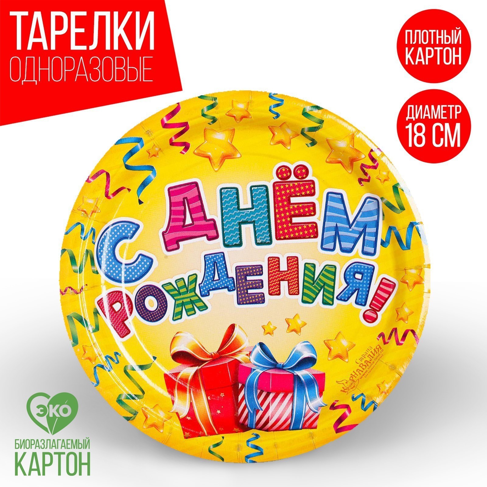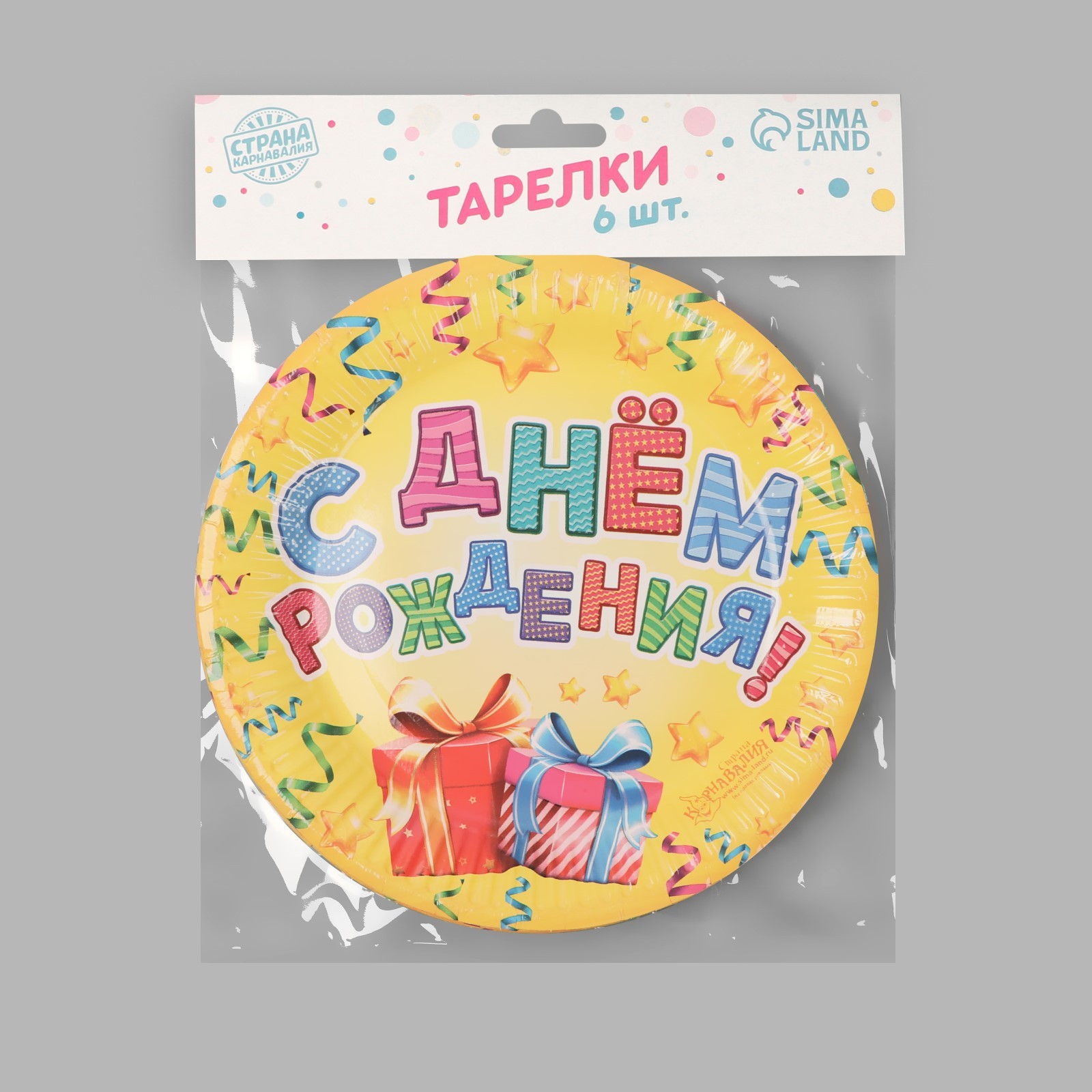 Тарелка одноразовая бумажная "с днем рождения" подарки и серпантин (набор 6 шт)