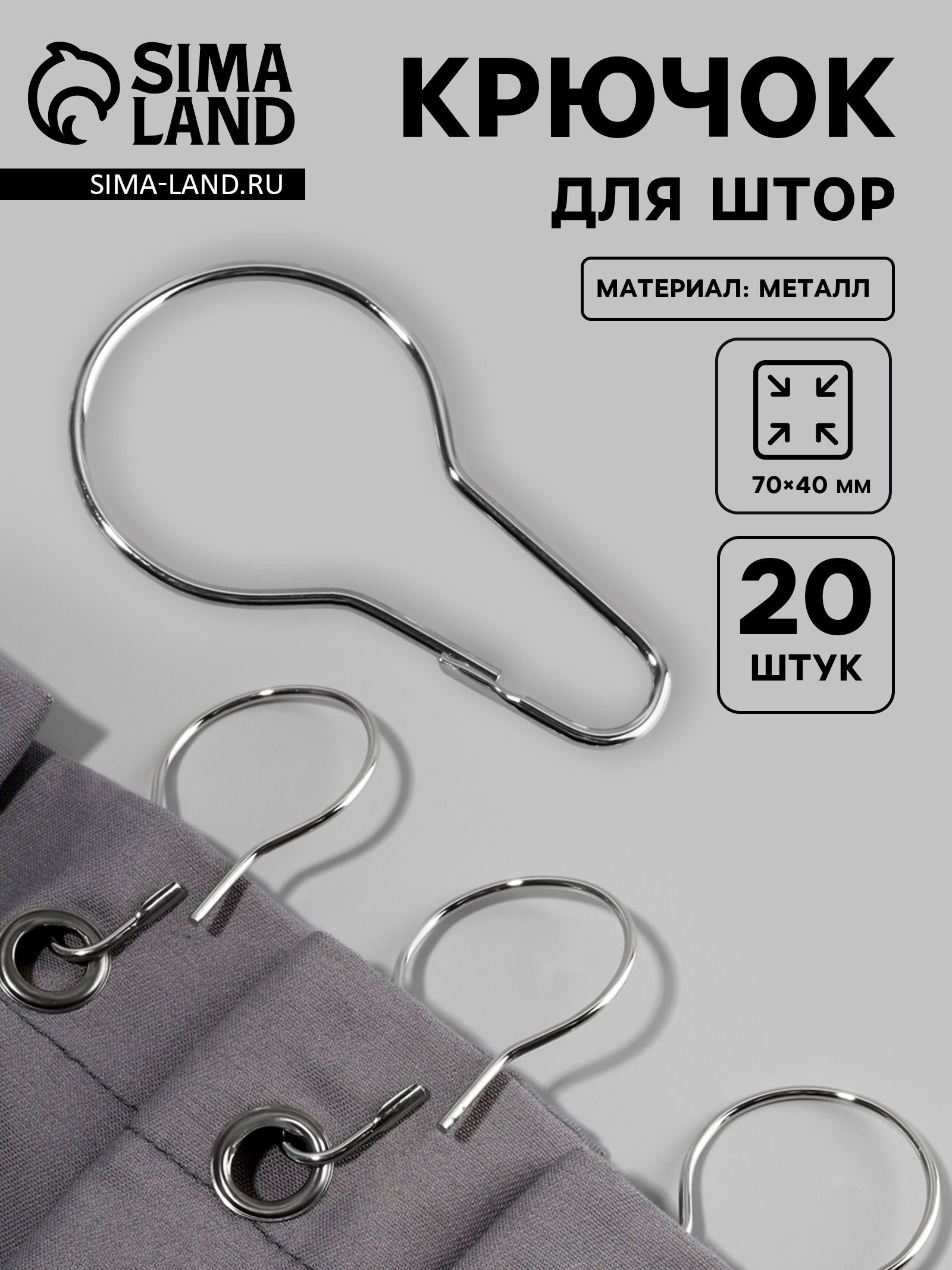 Крючок для штор, 7 4 см, 20 шт., цвет серебряный