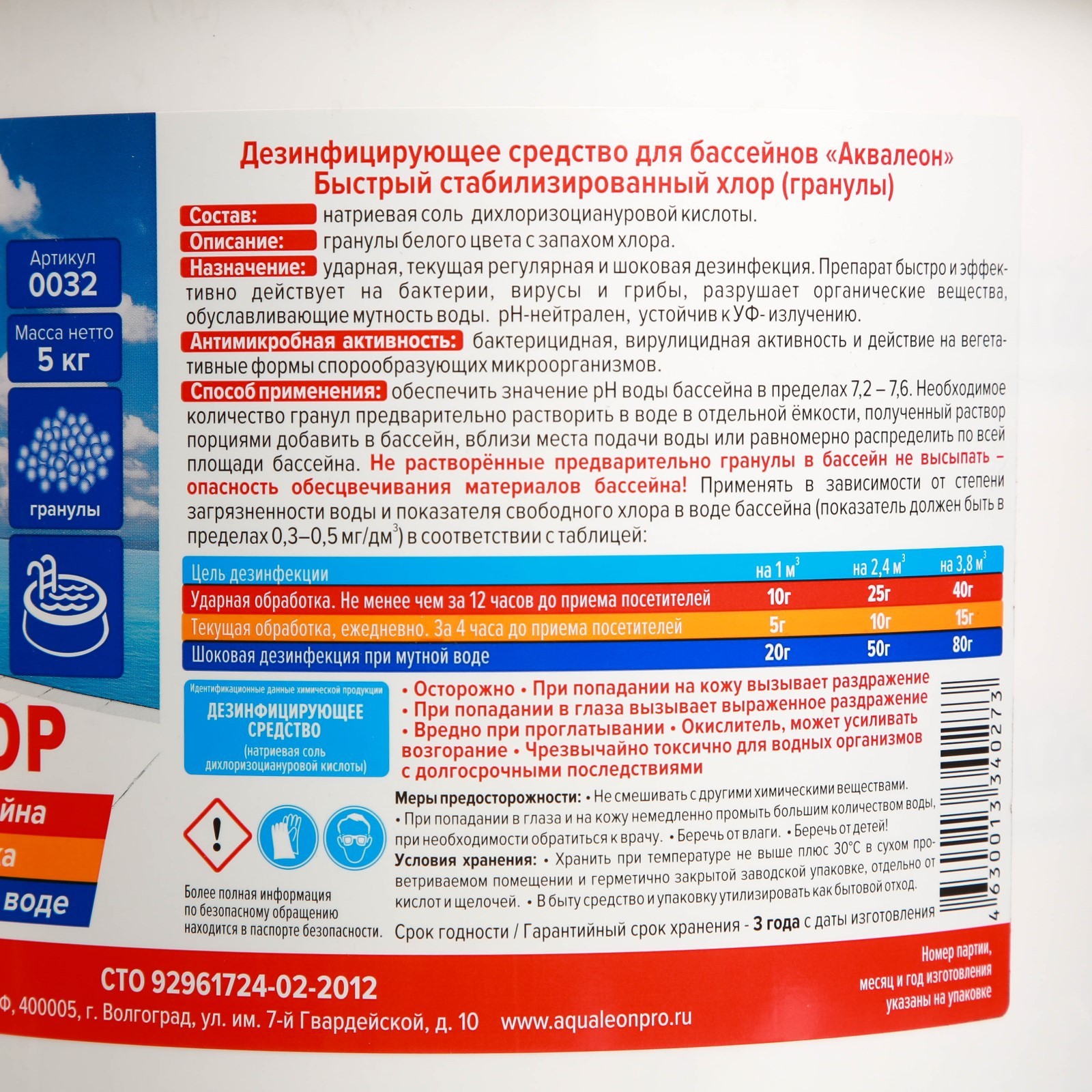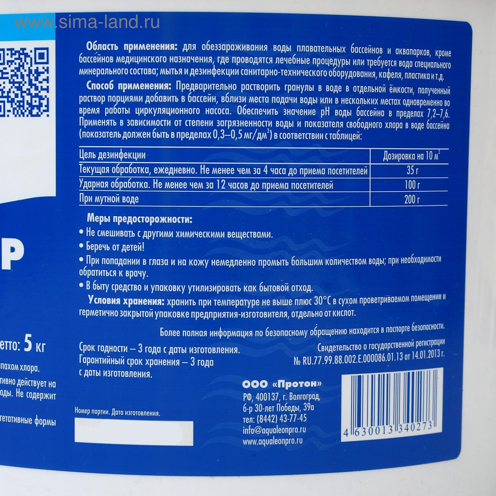 Быстрый стабилизированный хлор aqualeon гранулы, 5 кг.   Гранулы хлора Aqualeon используются для обеззараживания воды плавательных бассейнов, кроме бассейнов медицинского назначения, предназначенных для лечебных процедур или с водой специального минерального состава.  Антимикробная активность: бактерицидная, вирулицидная активность и действие на вегетативные формы спорообразующих микроорганизмов.  Состав: натриевая соль дихлоризоциануровой кислоты.  Способ применения:  Обеспечьте значение рН воды бассейна в пределах 7, 2–7, 6. Предварительно растворите гранулы в воде в отдельной ёмкости. Полученную смесь порциями добавьте в бассейн вблизи места подачи воды или в нескольких местах одновременно во время работы циркуляционного насоса. Меры предосторожности Применяйте в зависимости от степени загрязнённости воды. Дозировку средства смотрите на этикетке или в буклете. Не насыпайте гранулы в бассейн без предварительного растворения (возможно обесцвечивание материалов).  Вес, кг/Объём, л: 5 Объём, мл: 5000 Вид средства: Хлорсодержащие Форма выпуска: Таблетки Назначение: Бытовые Вид: Хлоросодержащиее  развернуть описание ▼