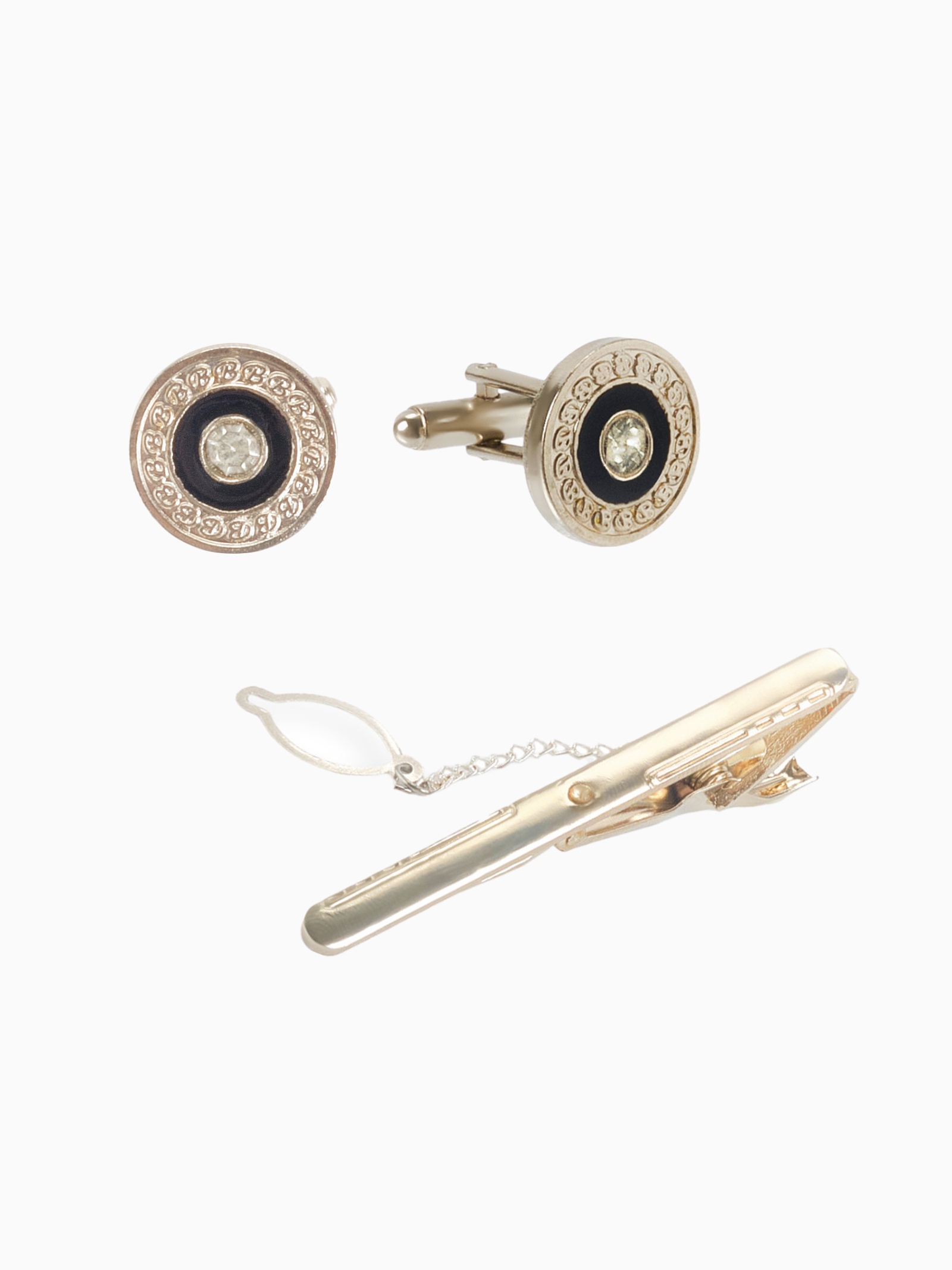 Набор мужской медный «запонки + зажим для галстука» круг с гравировкой, чёрно-белый в серебре