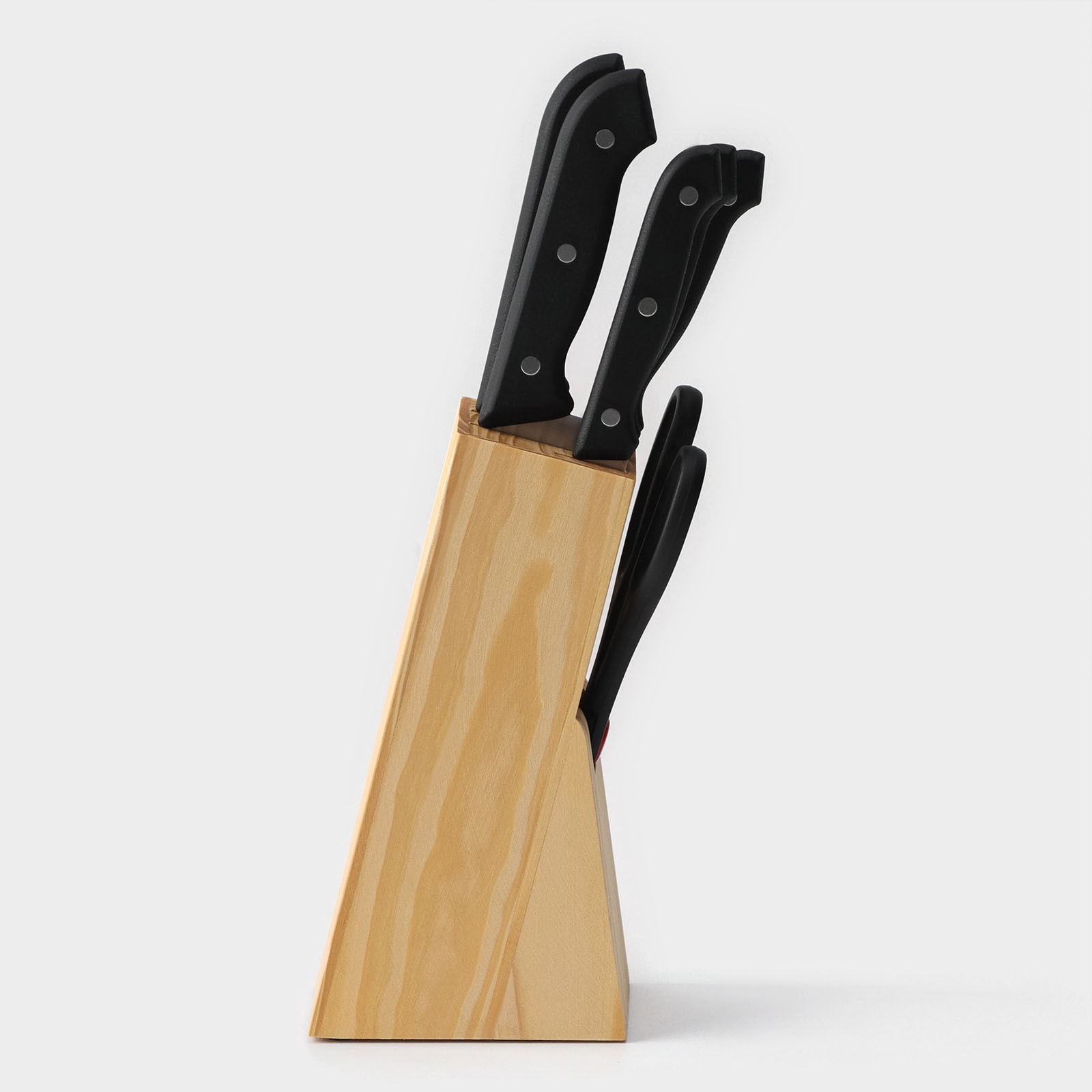 Набор кухонный на подставке, 6 предметов: ножи 8 см, 11 см, 13 см, 19 см, 20 см, ножницы, цвет чёрный