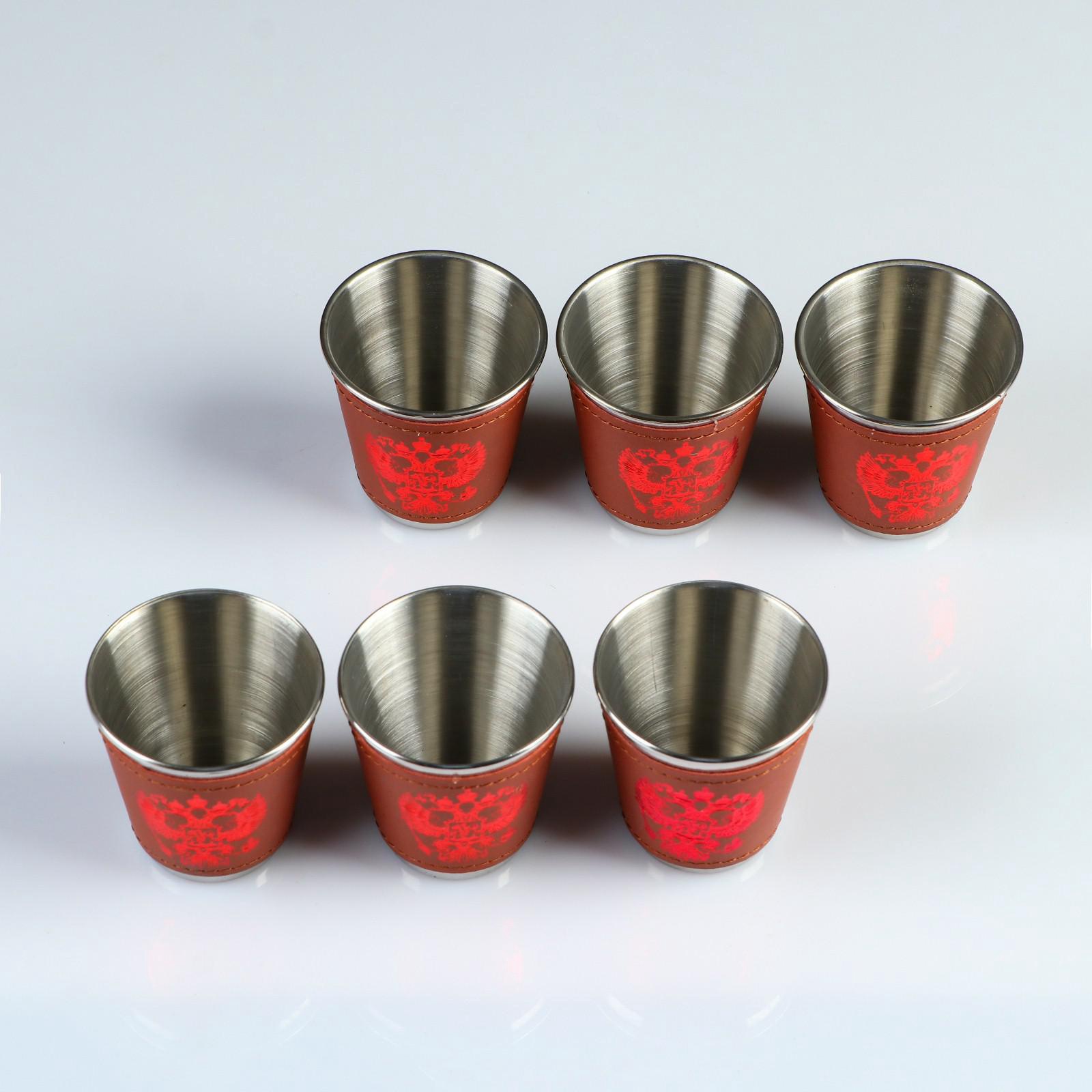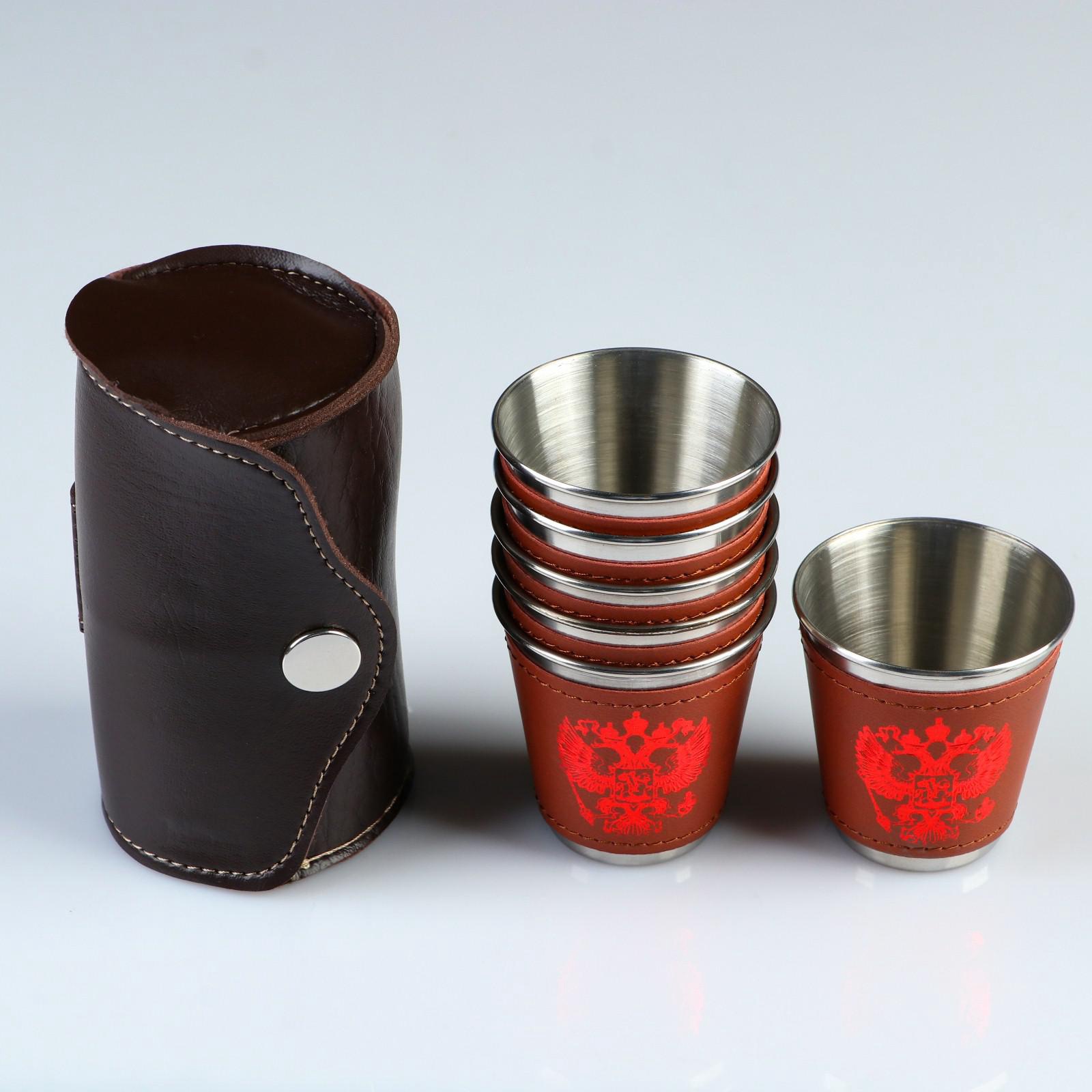 Стопки в чехле «герб», нержавеющая сталь, набор 6 шт. х 75 мл. Набор стопок из 6 штук по 75 мл из пищевой нержавеющей стали с удобным и компактным чехлом, который имеет хлястик для удобного крепления и носки на ремне, что отлично подходит для любителей охоты, рыбалки и людей любящих вылазки на природу, в горы, путешествия. Легкие и компактные, удобно брать с собой на отдых. Супер прочные и стильные, эти стопки изготовлены из высокого качества 304 нержавеющей стали, оплетка стопок выполнена из эко кожи, которые не только красиво смотрятся, но и обеспечивают долгий срок службы изделия. Они легко моются и подходят для повседневного использования. Отлично заменят стеклянные рюмки и бокалы, смотрятся эффектно и стильно. Стопки не слишком высокие, удобно помещаются в руке и имеют оптимальный объем 75 мл. Это подарочный набор на все случаи жизни, который станет прекрасным подарком на новый год папе или маме, бабушке или дедушке, а еще коллеге или начальнику боссу на день рождения или 23 февраля, 9 мая, 8 марта, юбилей. Этот набор шоттов удивит и порадует каждого получателя. Рюмки подойдут для водки, самогона, коньяка, виски, рома, ликера и другого алкоголя. Также допустимо использовать для безалкогольных напитков, таких как сок, вода или морс. Небольшие шоты идеальны для коктейлей, текилы или настоек. Набор:Да|Цвет:Коричневый|В наборе, шт.:6|Объём, мл:75|Рисунок:Да|Материал:Металл|Материал:Искусственная кожа|Особенности:Без особенностей|Страна:Китай  развернуть описание ▼