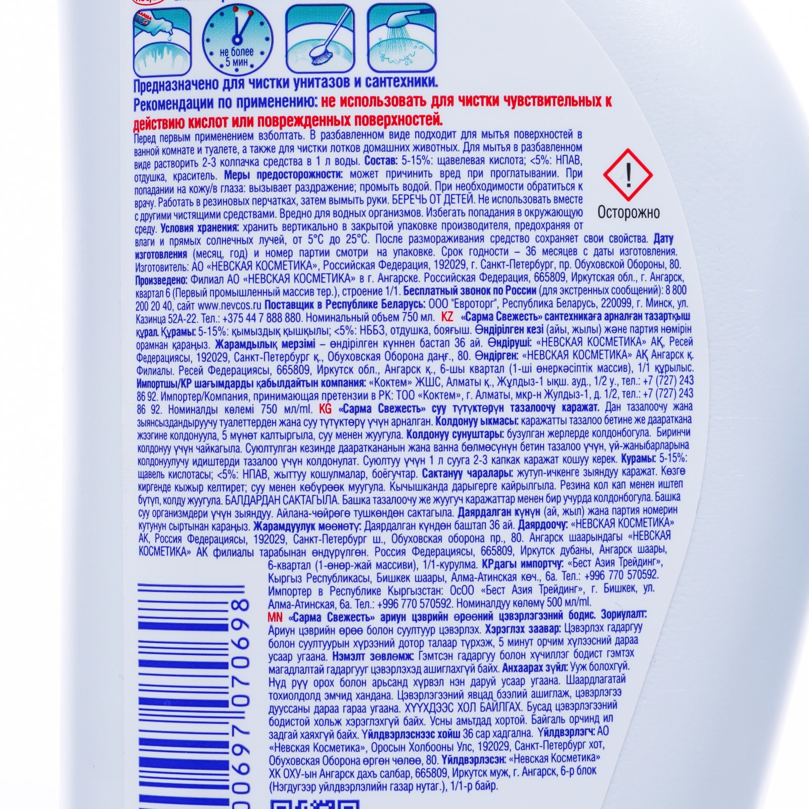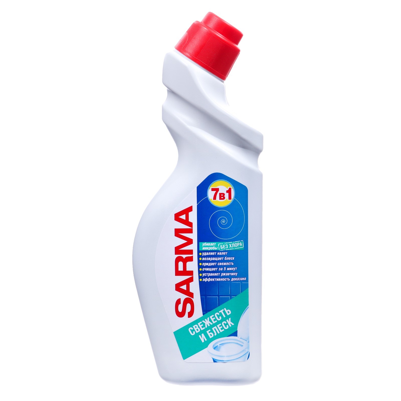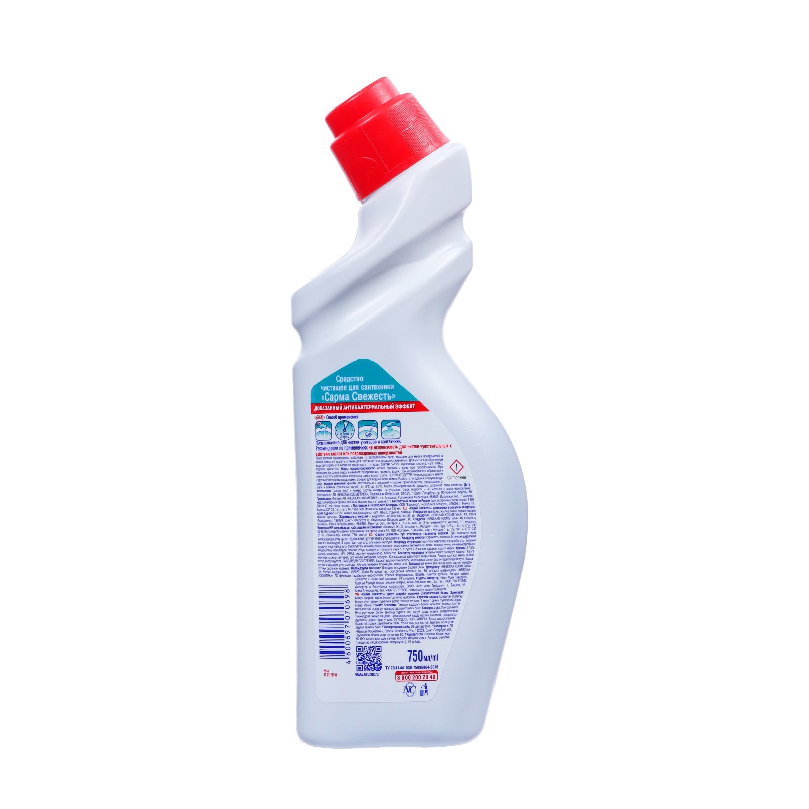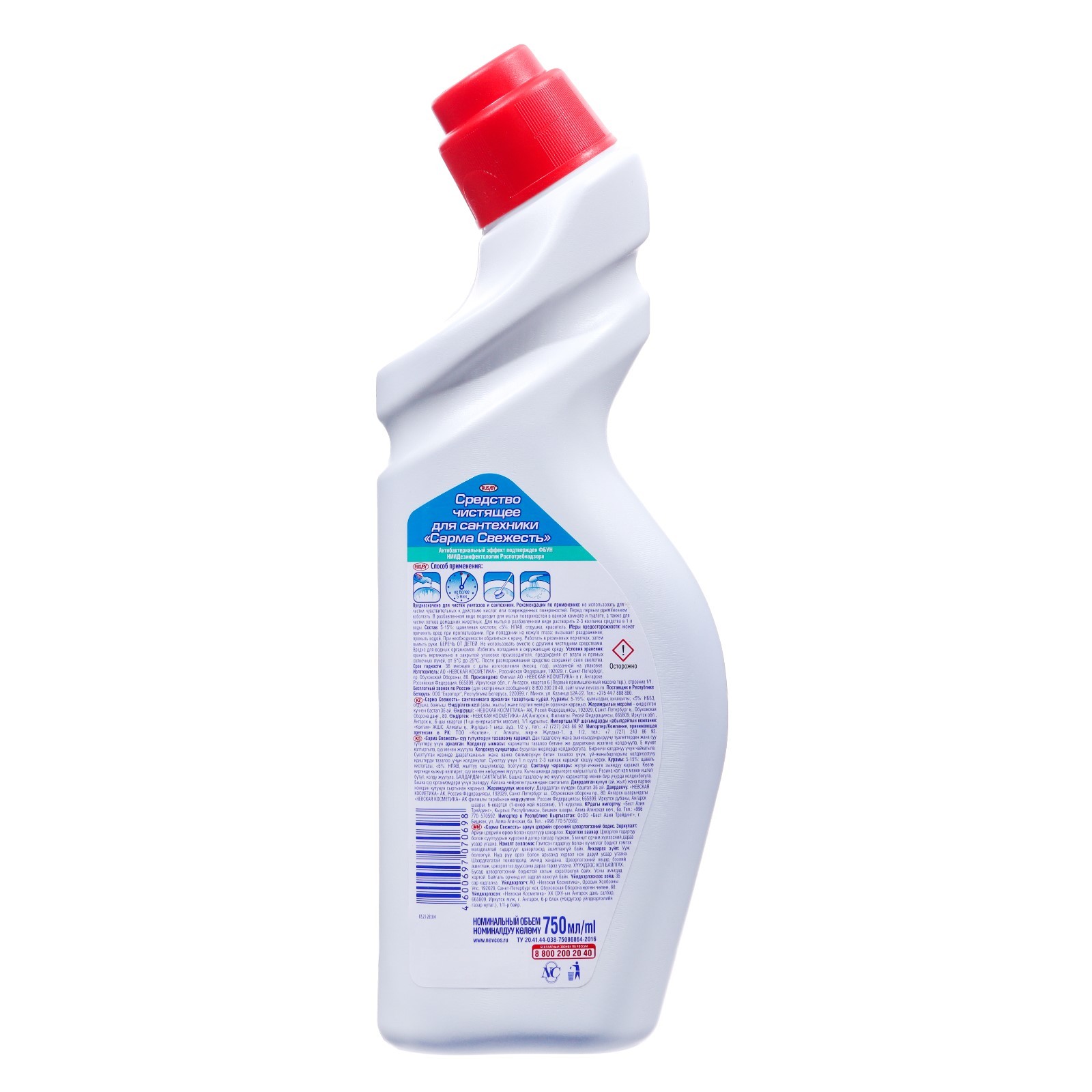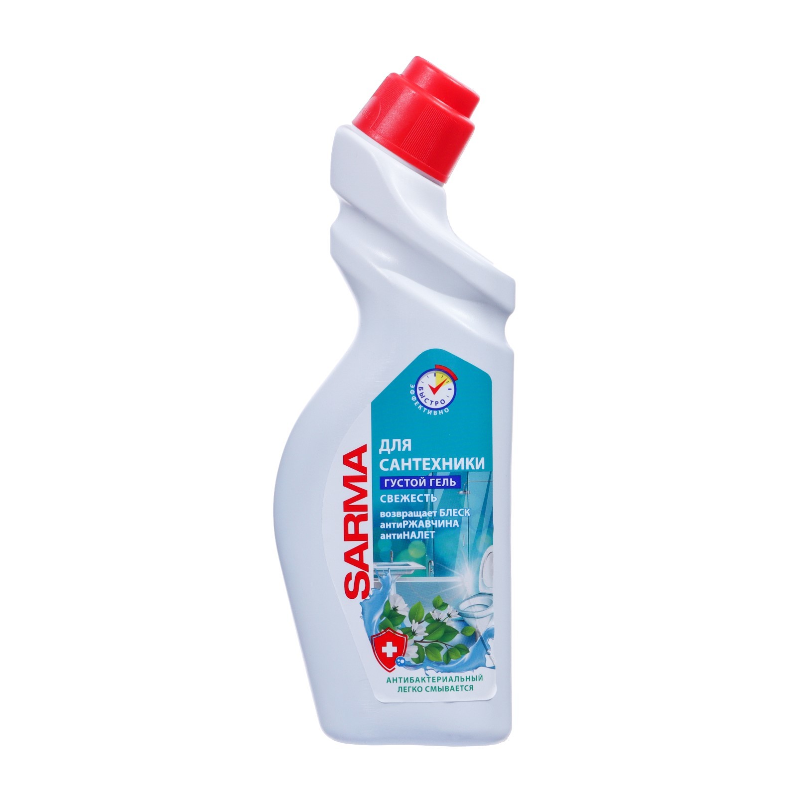 Средство чистящее для сантехники sarma «свежесть», 750 мл. Чистящий гель Sarma «Свежесть» используется для чистки сантехники, в том числе унитазов. Преимущества: устраняет неприятные запахи; удаляет микробы и бактерии; легко наносится под ободок унитаза; равномерно распределяется и держится на поверхности; обеспечивает чистоту и блеск сантехники, дарит ей приятный аромат; прекрасно справляется с ржавчиной, известковым налётом и мочевым камнем; не содержит хлора. Средство пригодится не только дома, но и в детских (в том числе школьных) и санаторно-курортных учреждениях, предприятиях гостиничного хозяйства, общественного питания и иных предприятиях и организациях, где требуется очистка и дезинфекция поверхностей. ФБУН «НИИ дезинфектологии» Роспотребнадзора подтверждает наличие антибактериального эффекта. Вес, г/Объём, мл: 750 Назначение: Для прочистки сантехники Эффект: Очищение Эффект: Дезинфицирующее  развернуть описание ▼