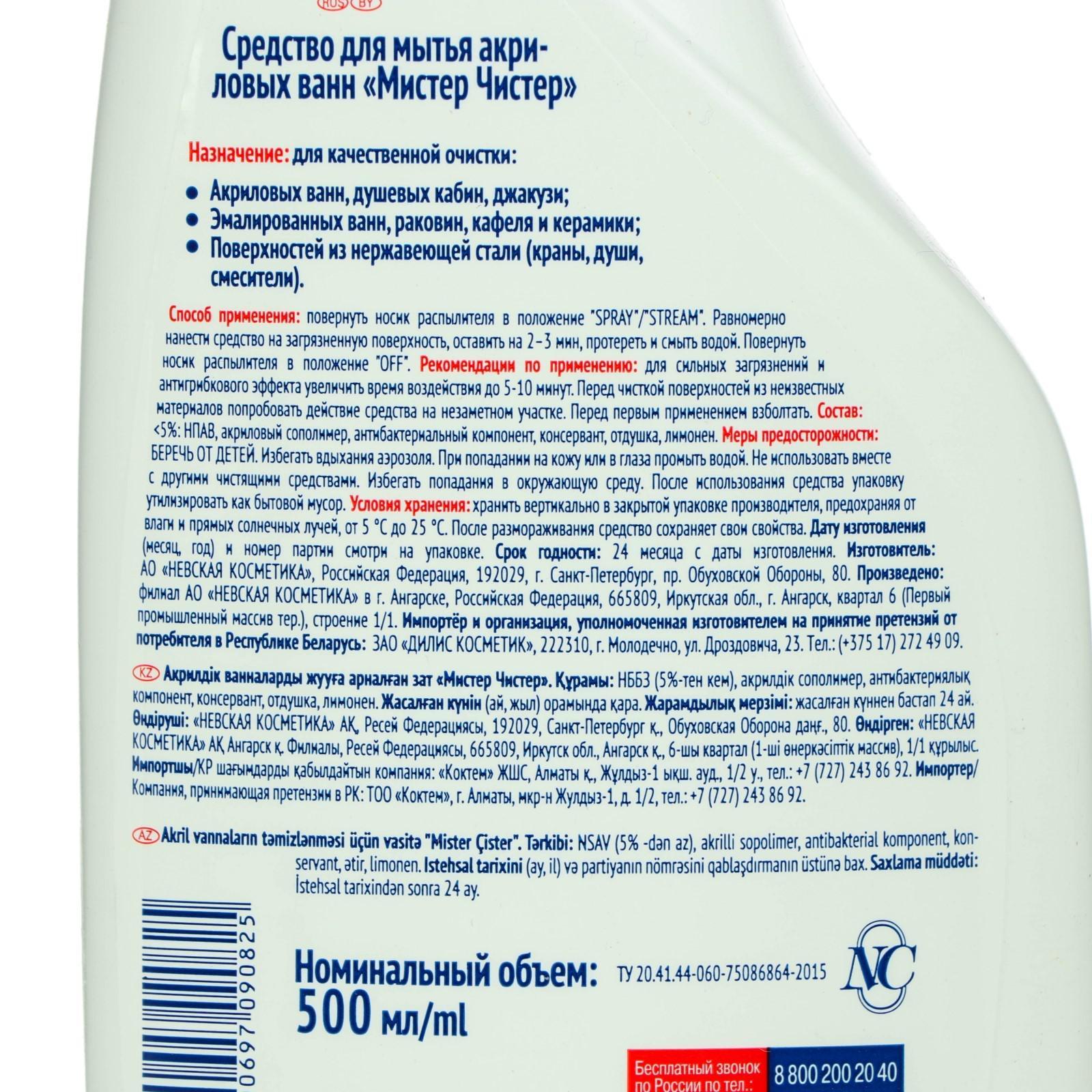 Средство для мытья акриловых ванн мистер чистер, 500 мл. Средство «Мистер Чистер» используется для мытья акриловых ванн и душевых кабин. Также подходит для эмалированных, кафельных и керамических поверхностей, изделий из нержавеющей стали. Преимущества: удаляет грязь, мыльный налёт, известковые отложения, устраняет желтизну; не повреждает акриловую поверхность; облегчает дальнейший уход; обладает антибактериальным эффектом. Чистящая способность средства и отсутствие повреждений на акриловой поверхности после его использования подтверждены независимой лабораторией НИИБХ «Росса». Объём, мл: 500 Вес, г/Объём, мл: 750 Назначение: Для ванн и душевых кабин : 0  развернуть описание ▼