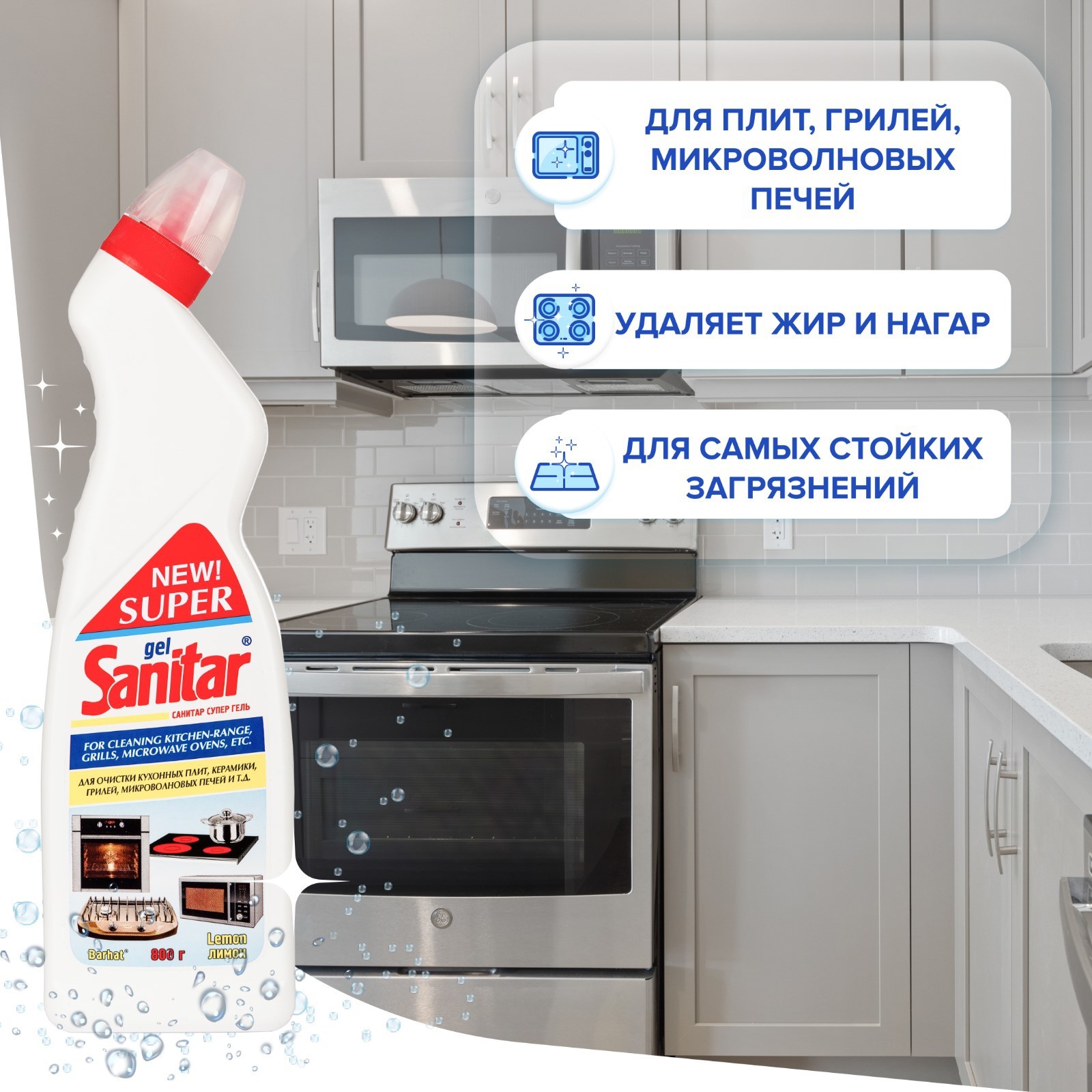 Универсальный гель для очистки плит, микроволновых печей super sanitar, 800 г. Универсальный гель для очистки плит, микроволновых печей Super Sanitar - это эффективное и удобное в использовании средство для уборки на кухне. Гель отлично справляется с различными видами загрязнений, такими как жир, копоть, пригоревшие остатки пищи и другие. Он подходит для очистки плит, микроволновых печей, духовок и других кухонных поверхностей. Благодаря своей густой текстуре, гель хорошо держится на поверхности и не стекает. Объем упаковки составляет 800 грамм, что делает его экономичным в использовании. parts count: 0 Вес, г/Объём, мл: 800 Назначение: Универсальное : 0  развернуть описание ▼