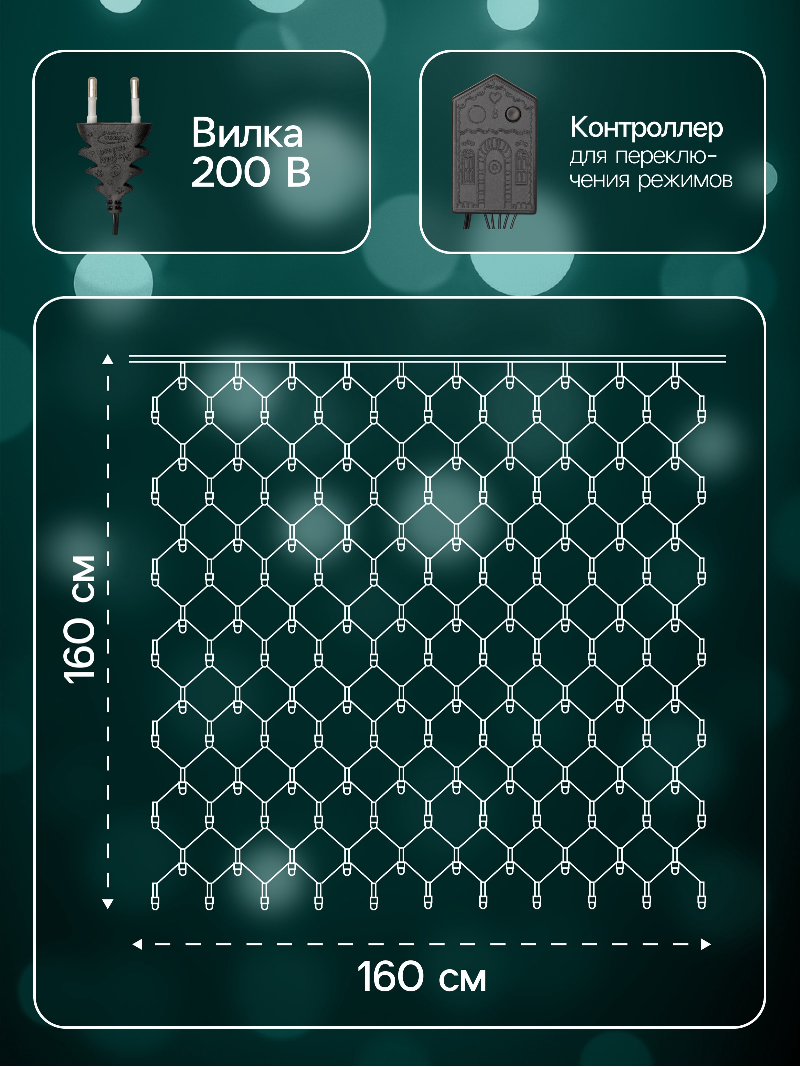 Гирлянда «сеть» 1.6 1.6 м, Ip20, тёмная нить, 144 Led, 8 режимов, 220 в, свечение мульти