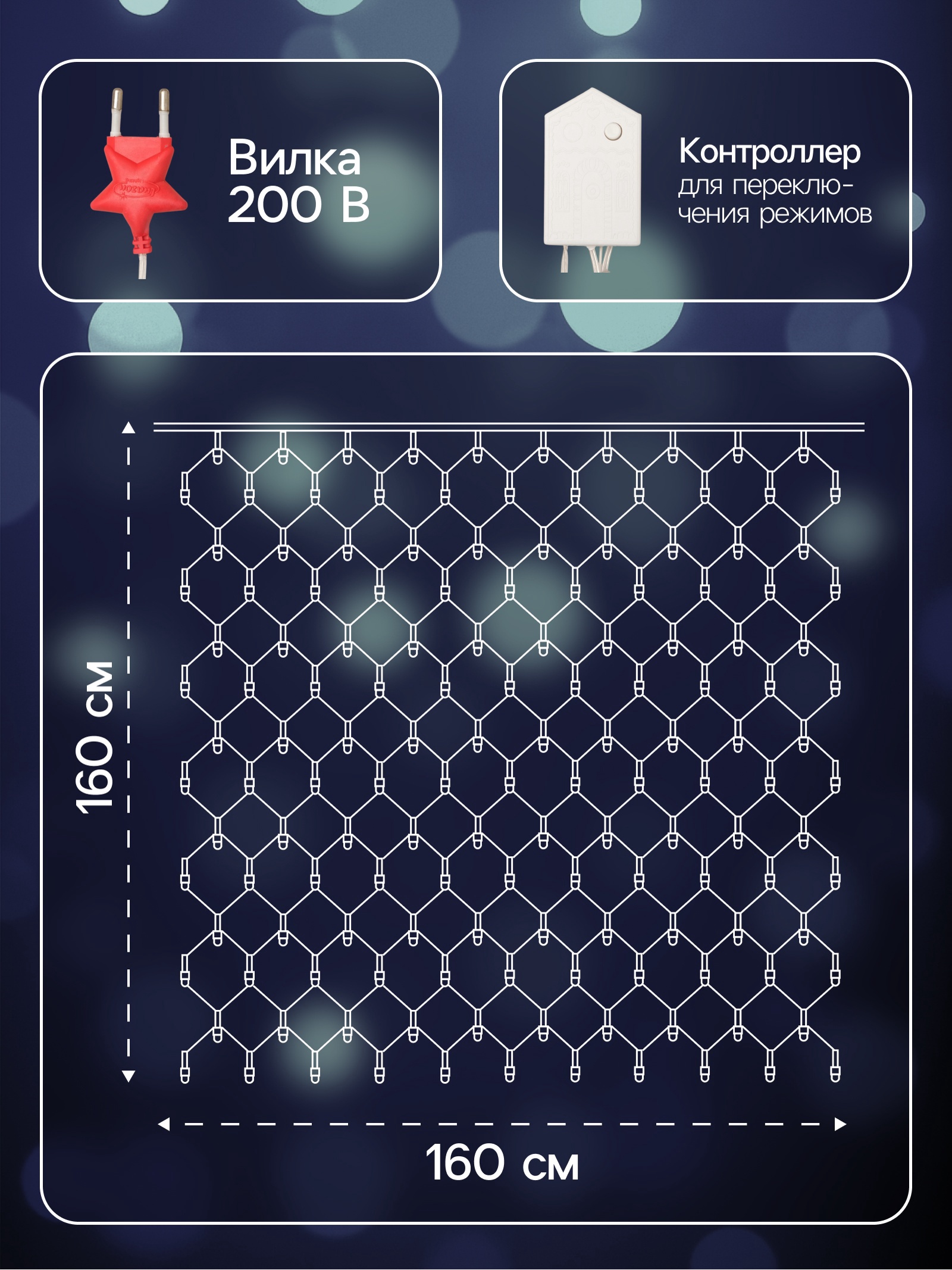 Гирлянда «сеть» 1.6 1.6 м, Ip20, прозрачная нить, 144 Led, 8 режимов, 220 в, свечение белое