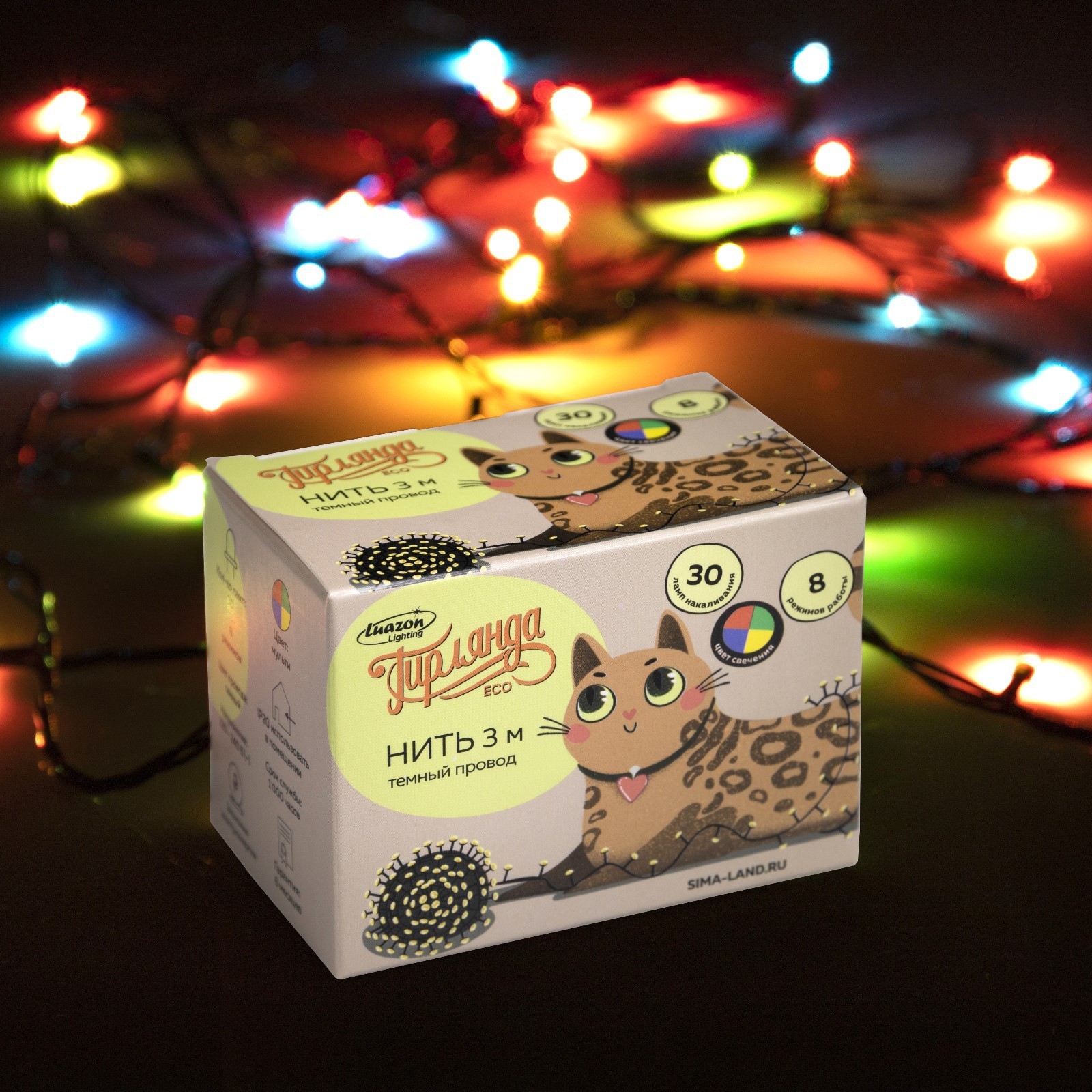 Гирлянда «нить» 3 м, Ip20, тёмная нить, 30 ламп, 8 режимов, 220 в, свечение мульти