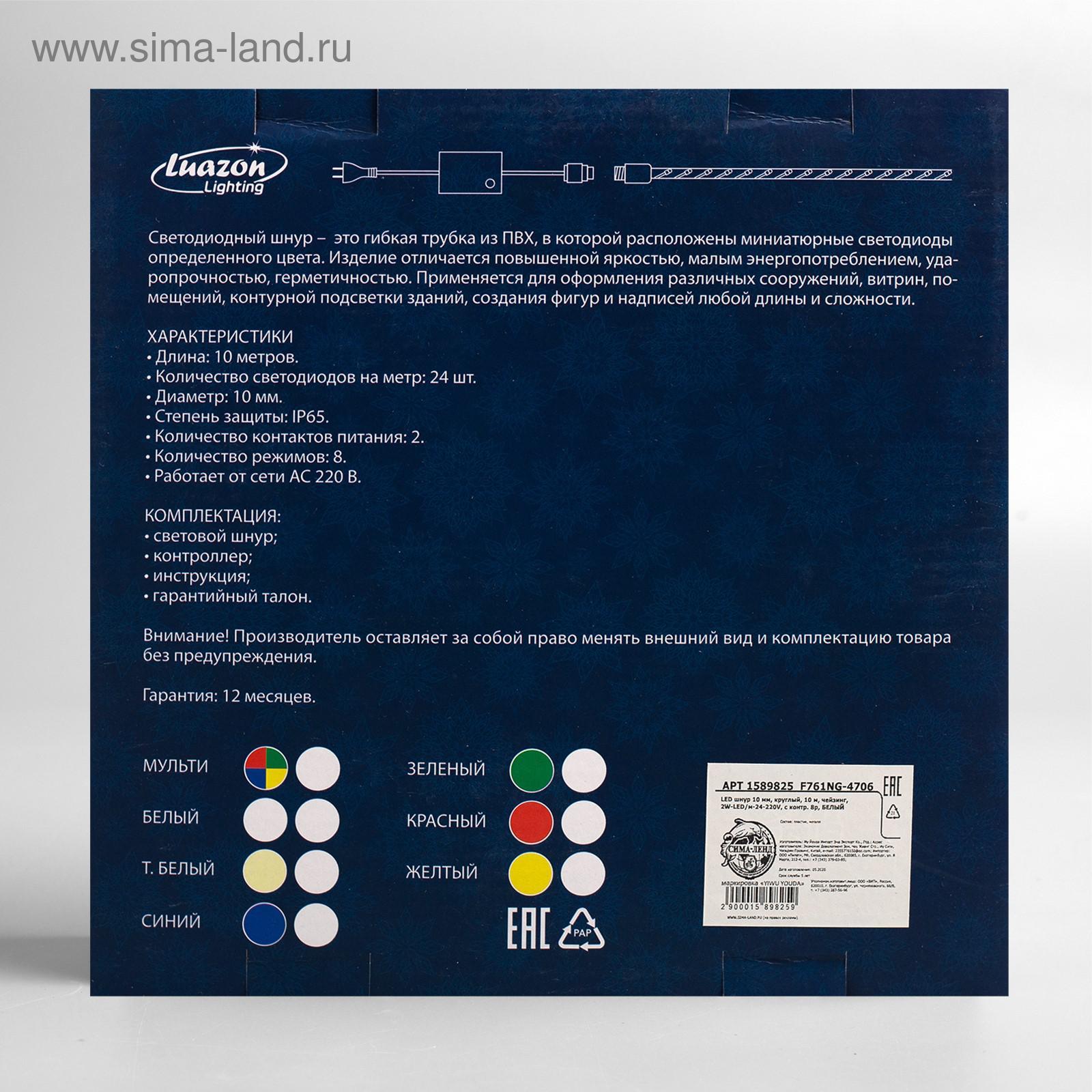 Световой шнур Luazon Lighting 10 мм, Ip65, 10 м, 24 Led/м, 220 в, 8 режимов, свечение мульти