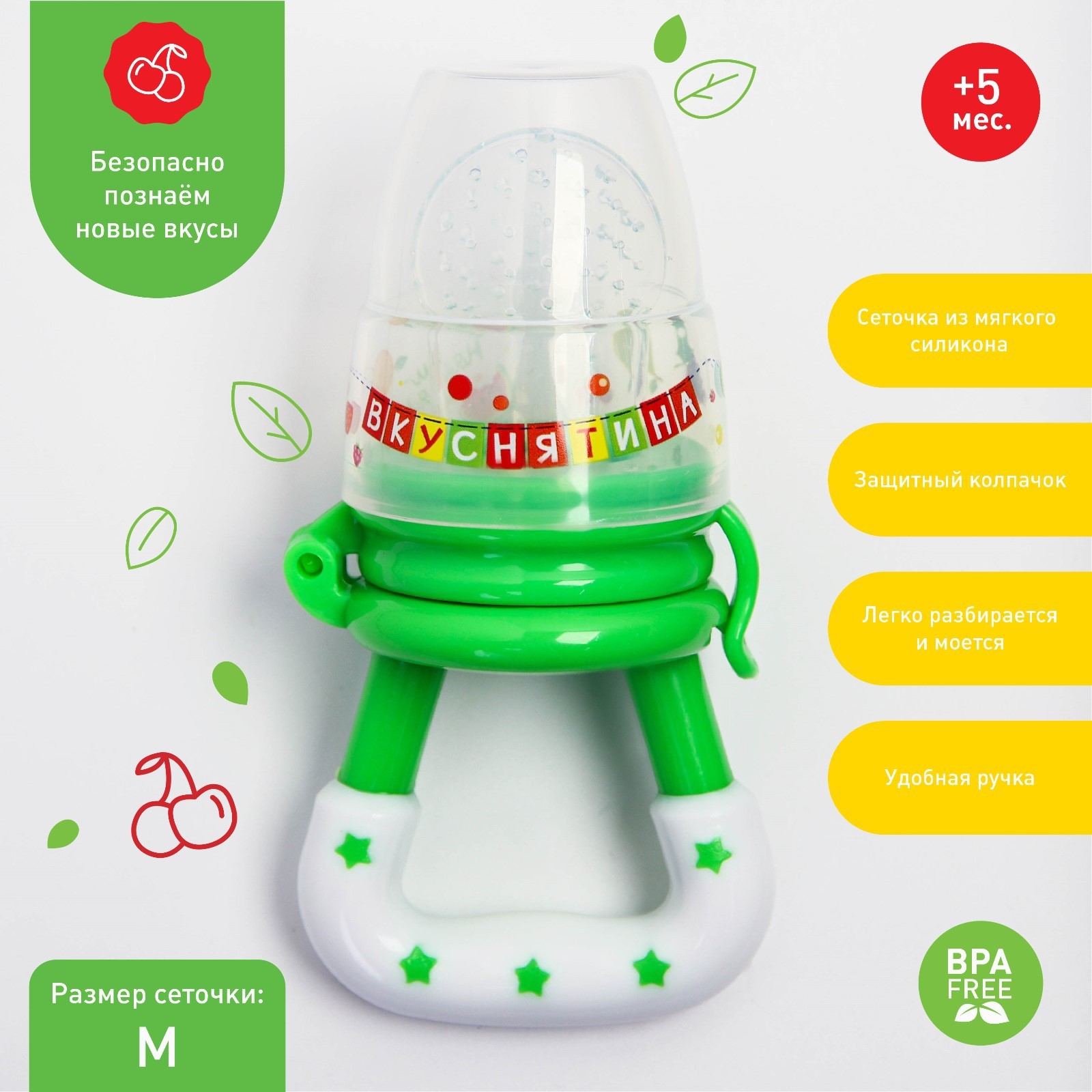 Ниблер m&b «вкуснятина» с силиконовой сеточкой, зелёный. Набор:Нет|Цвет:Зелёный|Для кого:Унисекс|Длина, см:10|Ширина, см:5|Глубина, см:4|Возраст:От 5 месяцев|Рисунок:Да|Тематика праздника:Рождение ребёнка|Адресат:Малышу/Малышке/Новорождённому|Возраст:Детский|Материал:Пластик|Материал соски:Силикон|Антиколиковая система:Нет|Для детей до 3 лет:Да|Вид насадки:Силиконовая|Возраст:Для детей|Размер сеточки:M|Вращающийся поршень:Нет|Страна:Китай  развернуть описание ▼