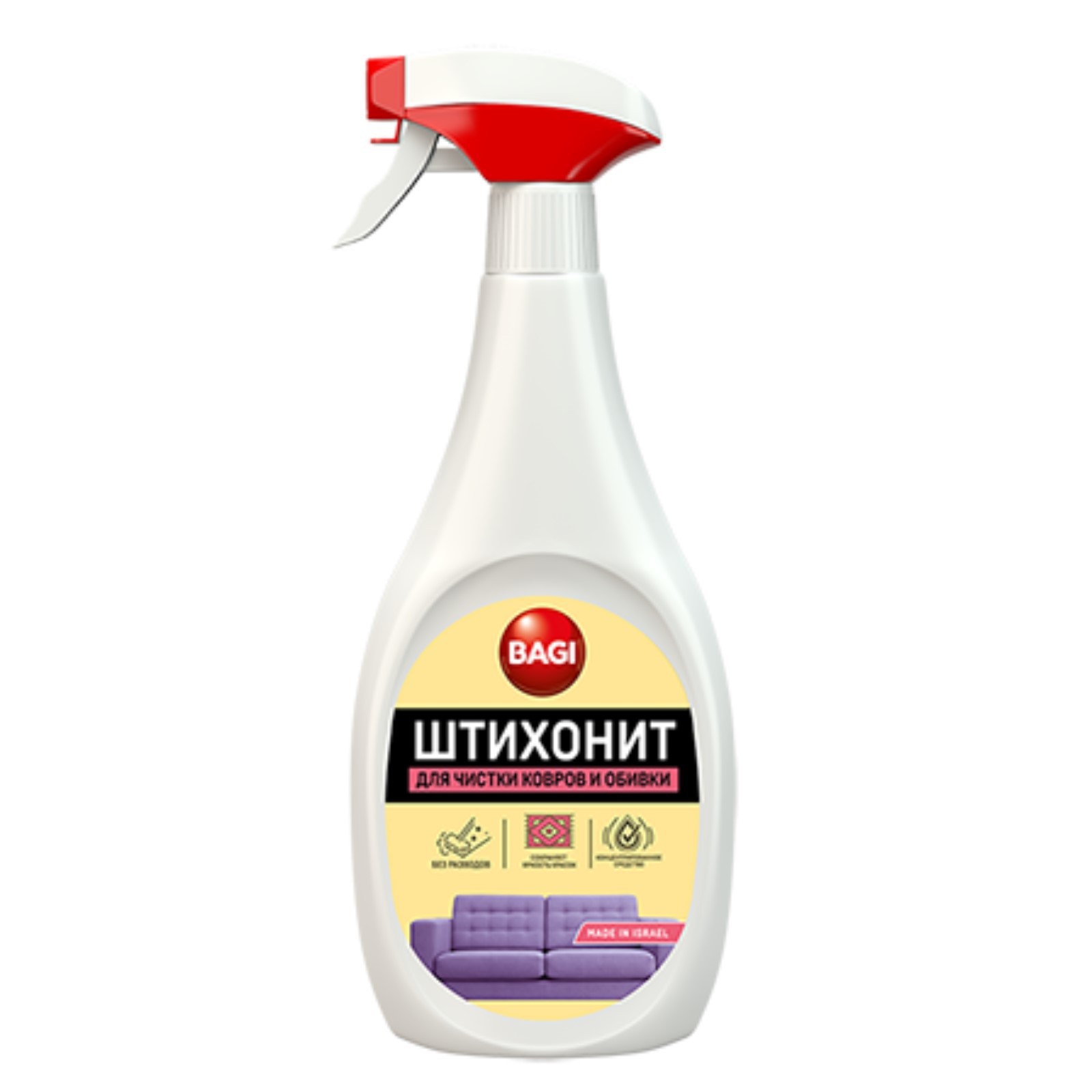 Средство для ручной чистки мягкой мебели, ковров bagi «штихонит», спрей, 500 мл. Концентрированное средство Bagi «Штихонит» подходит для чистки и обновления ковров, мягкой мебели и обивочной ткани, в том числе в салонах автомобилей. Оно облегчит вам уборку. Особенности: нейтрализует неприятные запахи; придаёт коврам освежающий аромат; удаляет пятна, жиры и следы домашних животных; не повреждает краску; не оставляет следов. Способы применения Для очистки подлокотников кресел, сидений в автомобилях: смочите тёплой водой загрязнение, распылите на него небольшое количество средства и потрите мягкой щёткой, смоченной в тёплой воде. После чистки используйте пылесос, а затем оставьте до полного высыхания. Для чистки ковров и мягкой мебели вручную: влейте 100–150 мл средства в 5 литров тёплой воды и хорошо перемешайте. Равномерно распределите жидкость по ковру и почистите мягкой щёткой. После чистки удалите остатки средства с помощью обычного пылесоса и оставьте до полного высыхания. Меры предосторожности Не употребляйте средство в пищу. Храните в недосягаемом для детей месте. В случае попадания в глаза немедленно промойте проточной водой. Если вы проглотили средство, выпейте воды и обратитесь к врачу. Вес, г/Объём, мл: 500 Форма выпуска: Спрей Вид: Моющее средство : 0  развернуть описание ▼