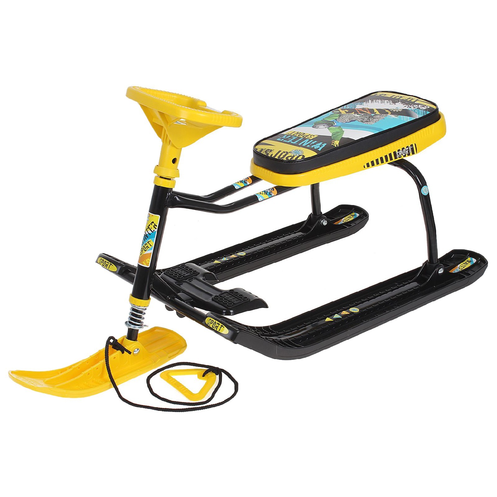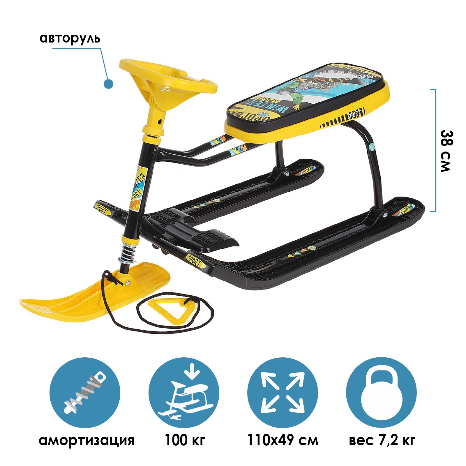 Снегокат тимка спорт 1 «зимний спорт». Снегокат предназначен для перевозки детей по плотному снегу или льду, катанию с горок. Имеет сварную конструкцию из стальных труб, пластиковых элементов и мягкое сиденье, обтянутое искусственной кожей с рисунком. Оснащён буксировочным и системой амортизации, которая обеспечивает комфортную поездку по крутым горкам и неровным поверхностям. Усиленный тормоз эффективен на обледенелой поверхности. Характеристики АвторульБуксировочный тросШирина сиденья: 20 смДлина сиденья: 44, 5 смВысота по руль: 54 смВысота по сиденью: 38 смМаксимальная нагрузка: 100 кгМасса: 7, 2 кг Цвет: Жёлтый Возраст: От 7 лет Высота до сиденья, см: 38 Maксимальная нагрузка, кг: 100 Ручка для родителей: Нет Ремень безопасности: Нет Наличие спинки: Нет Тип руля: Авторуль Буксировочный трос: Веревка Размер сиденья, см: 20 х 45 Регулировка посадочных мест: Нет Амортизатор: Да  развернуть описание ▼