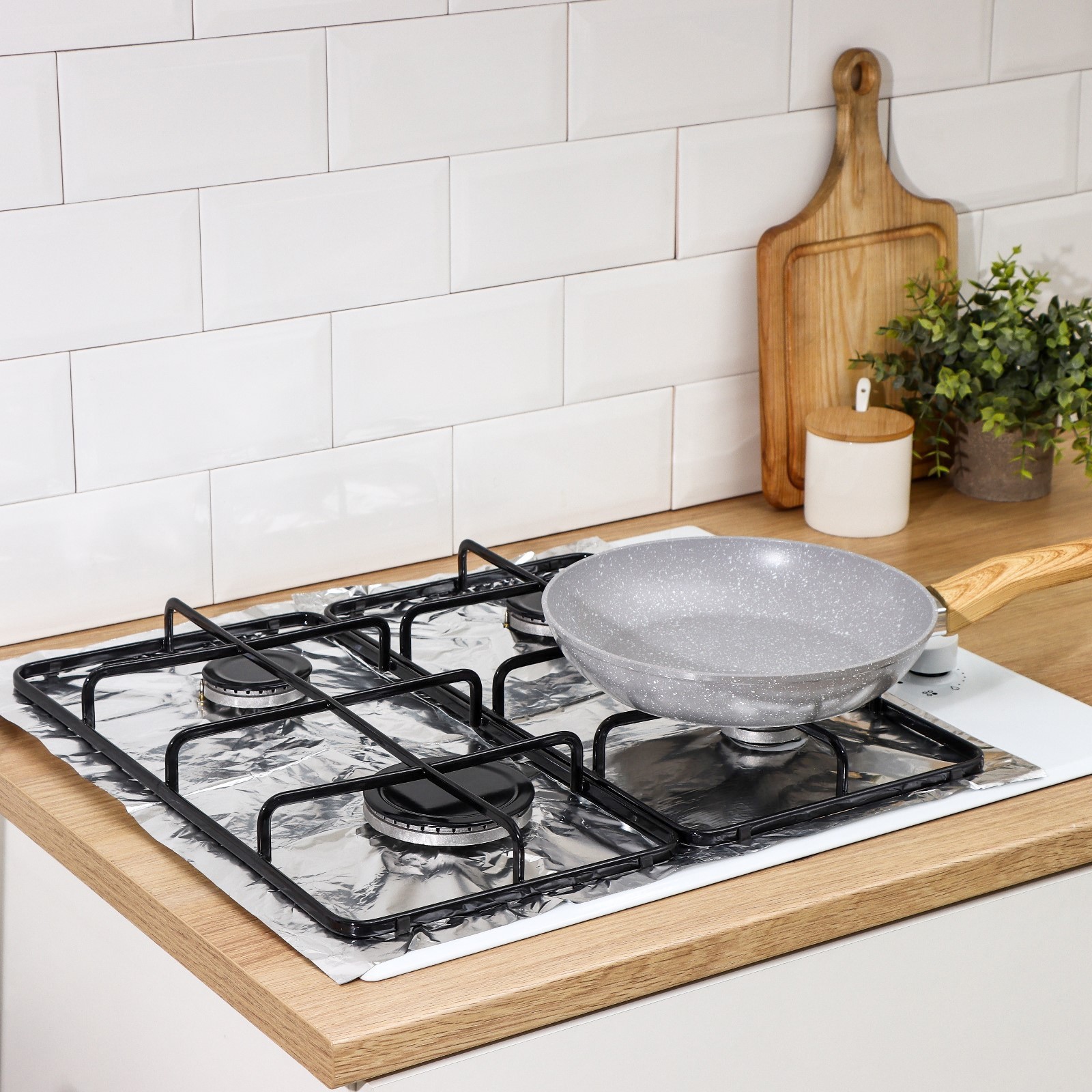 Защитное покрытие для газовых плит, 50x60 см. Защитная плёнка из алюминиевой фольги защитит поверхность газовой плиты от брызг масла, жира и пролитого молока. Изделие имеет специальный вырез для конфорки. Теперь не нужно тратить драгоценное время на оттирание пятен с плиты — просто замените накладку. Особенно актуальна эта фольга для тех, кто готовит несколько раз в день. При правильной эксплуатации и своевременной чистке лист может прослужить до 3–4 недель. После этого его следует заменить. Особенности: подходит для большинства плит российского и зарубежного производства. возможно многоразовое использование;практичный материал;легко раскладывается и снимается;С защитным покрытием вы сэкономите ваше время, а плита останется чистой. Цвет: Серый Форма: Квадратная parts count: 0 Количество ячеек: 4 tnved: 7616999008 Крышка: Нет Материал: Алюминий Тип покрытия: Без покрытия Ячейки: Да Разъёмная форма: Нет Можно мыть в посудомоечной машине: Нет Форма: Квадрат, куб  развернуть описание ▼