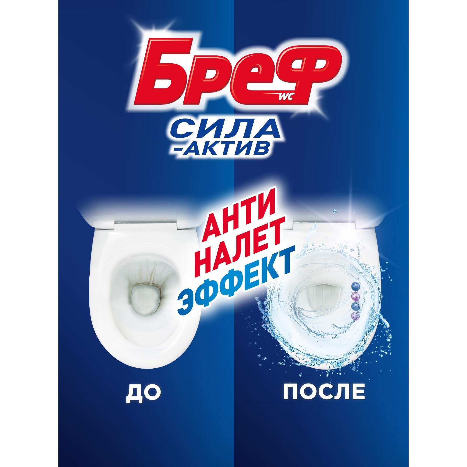 Блок для чистки и свежести унитаза bref сила актив 4 в 1 "свежесть лаванды", 2 шт х 50 г. Бреф Сила-Актив с АНТИНАЛЕТ ЭФФЕКТ – подвесной туалетный блок с формулой против известкового налета. Активная формула с антиналет эффектом действует в 4 направлениях: -образует очищающую пену, которая обеспечивает гигиеническую чистоту; -предотвращает образование известкового налета; -помогает предотвратить повторное загрязнение; -придает туалетной комнате свежий аромат лаванды после каждого смывания. Бреф Сила-Актив придает антиналет эффект при каждом смывании. Способ применения: Повесьте Бреф Сила-Актив под ободок Вашего унитазаВыберите положение блока как можно ближе к струе водыЗамените блок, когда он закончитсяВызывает раздражение кожи. Вызывает выраженное раздражение глаз. После работы тщательно вымыть руки. Использовать защитные перчатки / средства защиты глаз. ПРИ ПОПАДАНИИ НА КОЖУ: Промыть большим количеством воды. ПРИ ПОПАДАНИИ В ГЛАЗА: Осторожно промыть глаза водой в течение нескольких минут. Снять контактные линзы, если вы ими пользуетесь или если это легко сделать. Продолжить промывание глаз. Хранить в недоступном для детей месте. Состав:> 30 % анионных ПАВ, солей неорганических; 5-15% неионогенных ПАВ; < 5% красителя, комплексообразователя, растворителя, отдушки (в т. ч. кумарина, линалоола, лимонена) Аромат: Лаванда Вид средства: Сменный блок  развернуть описание ▼