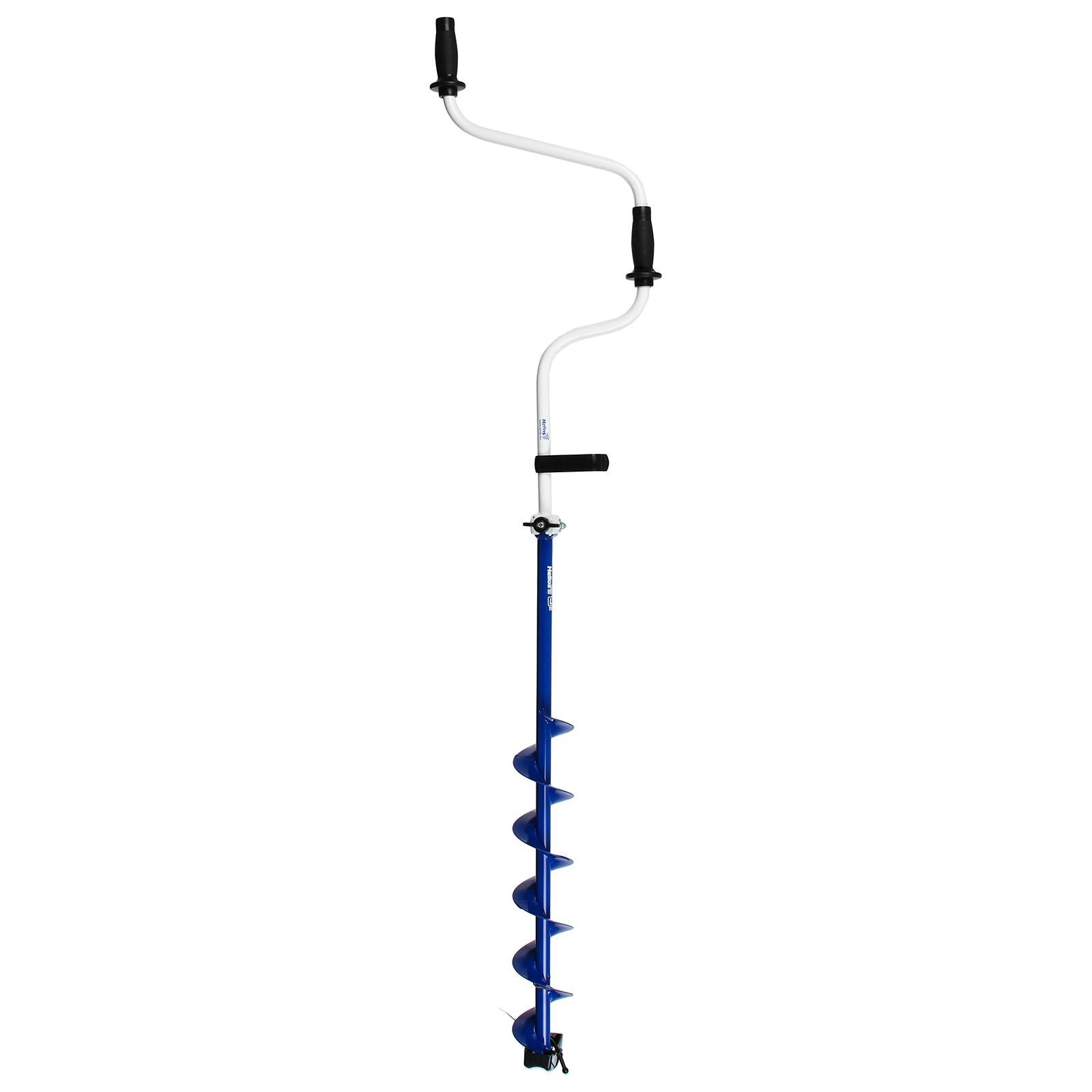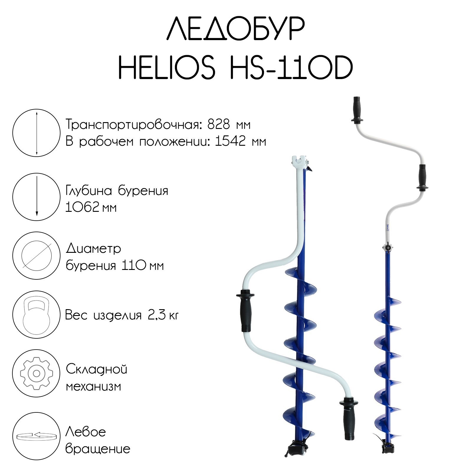 Ледобур helios hs-110d, левое вращение. Складной шнековый ледобур c левым вращением предназначен для бурения отверстий во льду при ловле рыбы. Верхняя рукоятка ледобура смещена относительно оси шнека на 130 мм, а нижняя на 150 мм. Такое расположение рукояток позволяет вращать ледобур одновременно двумя руками, тем самым, не прикладывая особых усилий, увеличивая скорость бурения лунок во льду. Ледобур комплектуется ножами СКАТ 110. Данный бур при необходимости можно нарастить удлинителем для ледобура УД-400 или УД-250 при этом значительно увеличив глубину бурения. Технические характеристики Левое вращение. Диаметр бурения: 110 мм. Глубина бурения: до 1062 мм. Длина в рабочем положении: 1542 мм. Длина шнека: 511 мм. Длина в транспортном положении: 828 мм. Вес: 2, 3±0, 2 кг. Комплект поставки Ледобур в сборе: 1 шт. Ножи: 2 шт. Болт (винт) М6 х 12: 4 шт. Футляр защитный: 1 шт. Паспорт: 1 шт. Диаметр, мм: 110 parts count: 0 Глубина бурения, м: 1.06 Вес, кг: 2.3 Транспортная длина, см: 80.5 Тип: Ледобур Вид ледобура: Двуручный Направление вращения: Левое (против часовой стрелки) Товар Каспи: Ледобуры для рыбалки  развернуть описание ▼