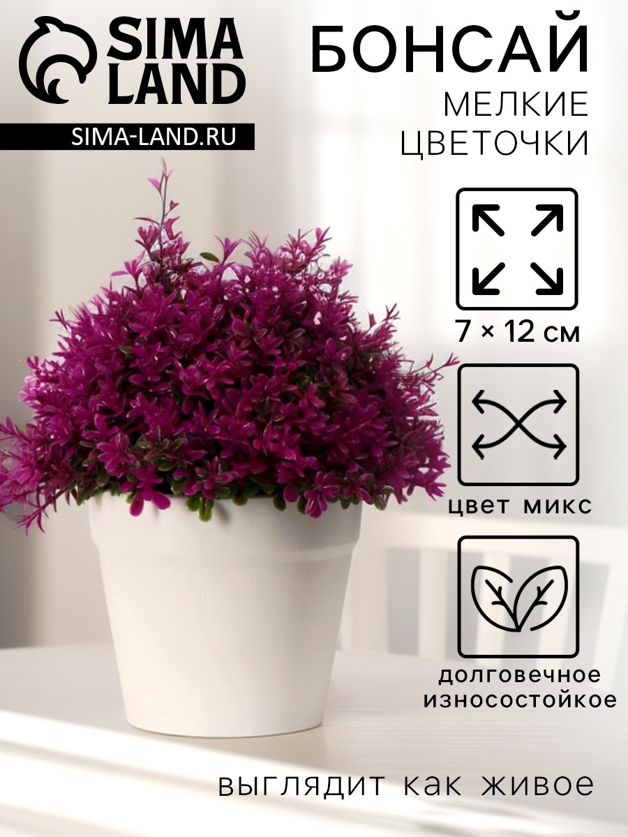 Искусственный цветок в горшке «мелкие цветочки», h=12 см, высота горшка 7 см, микс. Миниатюрное бонсаи с цветочками в горшке станет прекрасным дополнением вашего интерьера. Этот декоративный элемент привнесет нотку свежести и уюта, не требуя при этом сложного ухода. Особенности Нежные цветы в сочной цветовой гамме, создающие атмосферу гармонии.Компактные размеры подходят для любого стиля оформления: от минимализма до классики.Идеально подходит для домашних и офисных пространств, добавляя живую энергетику.Подходит для людей, желающих внести зелень в свою жизнь без особых усилий.Легкость ухода и долговечность — именно то, что нужно для занятых людей.Материалы безопасны и устойчивы, подойдут даже для детских комнат.Польза от декора Декоративное бонсаи не только украсит ваше пространство, но и создаст атмосферу спокойствия и гармонии. Оно способствует улучшению настроения и может стать отличной идеей для подарка. Позвольте себе наслаждаться природой, не выходя за пределы своего дома. Цвет:МИКС|Высота, см:12|Страна:Китай  развернуть описание ▼