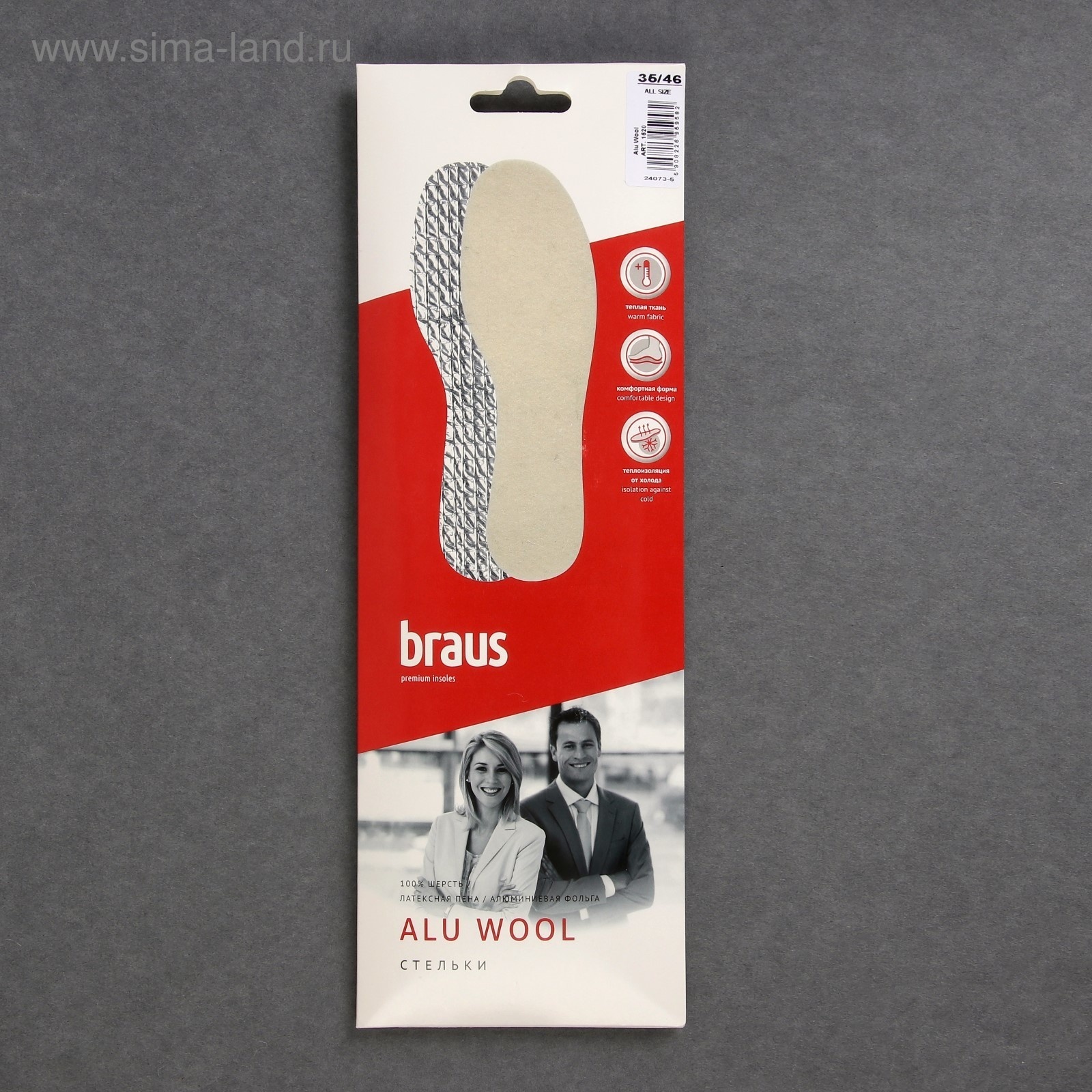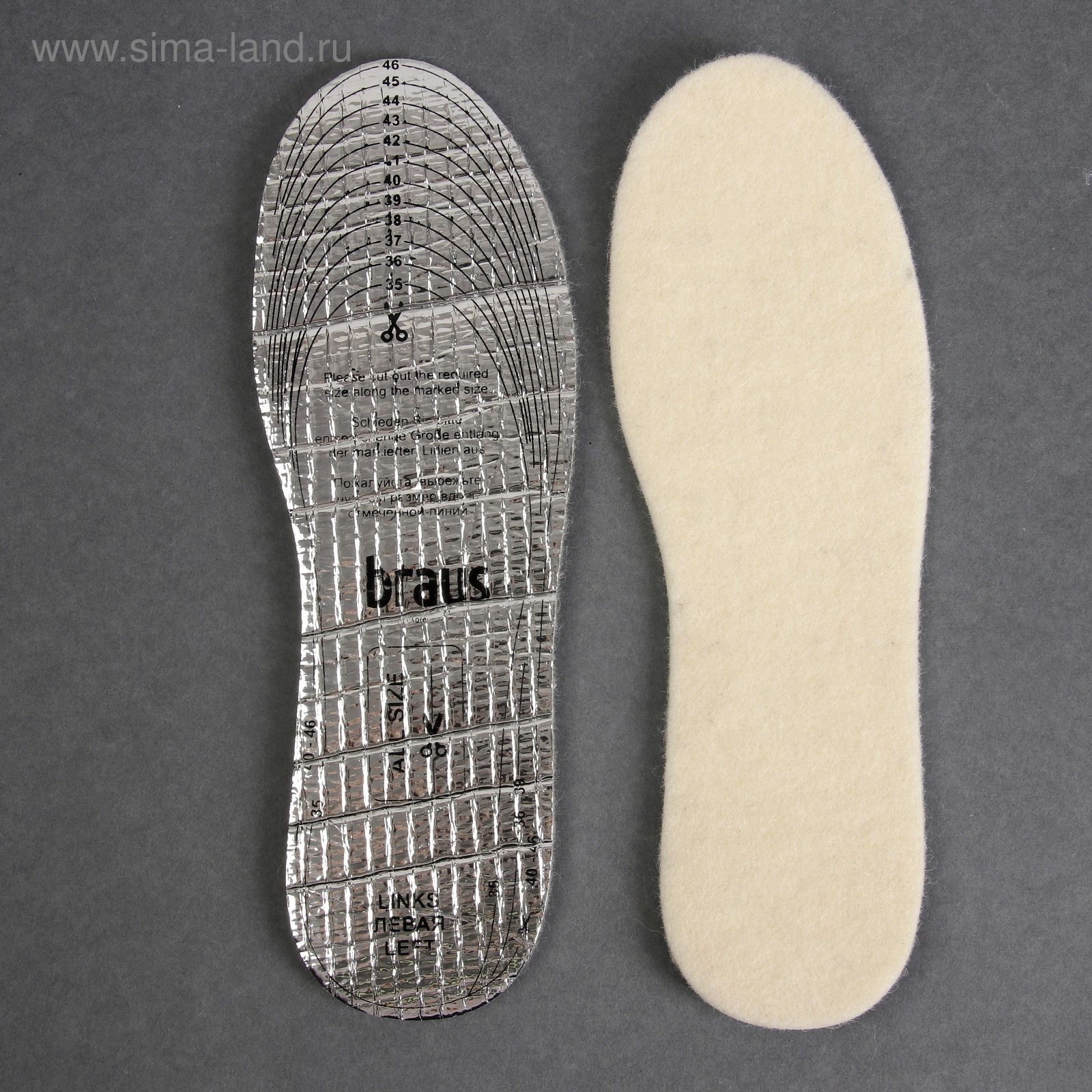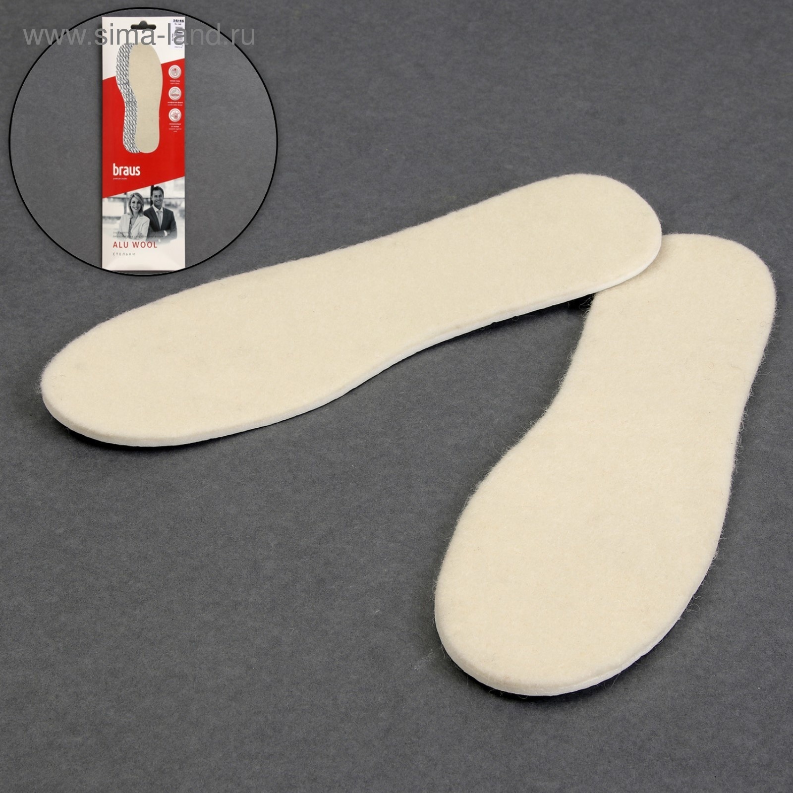 Стельки для обуви, универсальные, р-р ru до 48 (р-р пр-ля до 46), 30 см, пара, цвет белый. Теплые стельки рассчитаны на зимнее время года. Шерстяная ткань эффективно и надолго сохраняет тепло, впитывая излишнюю влагу обеспечивает комфорт. Эластичная и упругая пенка гарантирует мягкость и удобство во время ходьбы. Алюминиевая фольга препятствует проникновению холода снаружи. Компания ООО «Браус» специализируется на производстве качественных съёмных стелек. Они изготовлены из экологически безопасных, протестированных дерматологами и имеющих санитарно-гигиенические сертификаты материалов. Качество и долговечность изделий BRAUS не уступают мировым аналогам. Они обладают уникальной конструкцией, сделаны на пластиковом каркасе, имеют наполнение из латекса и активированного угля, покрыты натуральной кожей. Стельки обеспечивают отличную воздухопроницаемость, быстрое удаление излишков влаги, правильную поддержку свода стопы и жёсткую фиксацию пятки. Также с помощью них можно бороться с главными проблемами активных людей: тяжестью ног, усталостью, болями в голеностопе, мозолями. Цвет: Белый Размер: 35 Размер: 36 Размер: 37 Размер: 38 Размер: 39 Размер: 40 Размер: 41 Размер: 42 Размер: 43 Размер: 44 Размер: 45 Размер: 46 Детские: Нет Вид упаковки: Пакет Материал: Латекс Материал: Шерсть Материал: Фольга Вид: Утеплённые Вид: На всю стопу Вид: Универсальные Вид стелек: Стельки Температурное ограничение: Нет  развернуть описание ▼