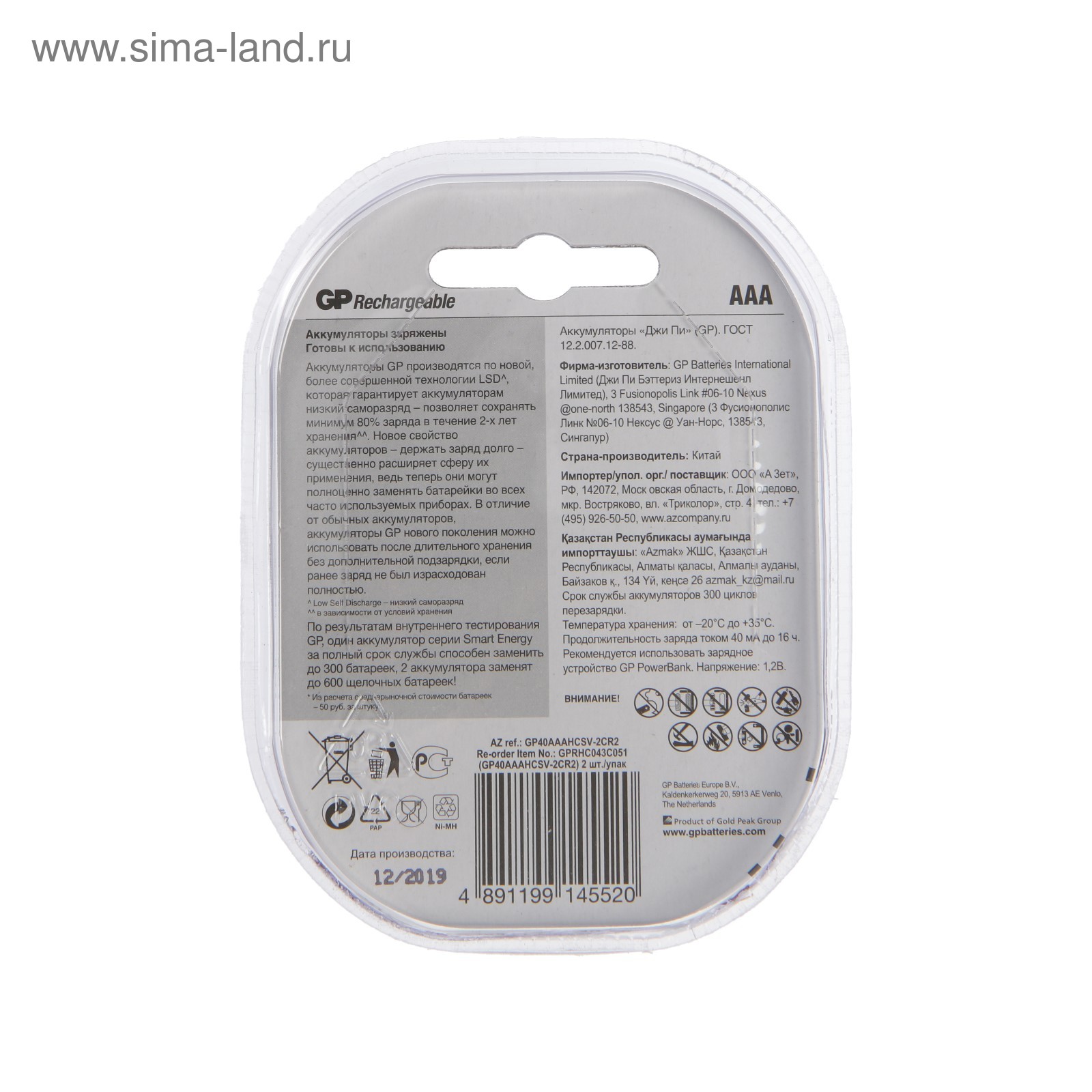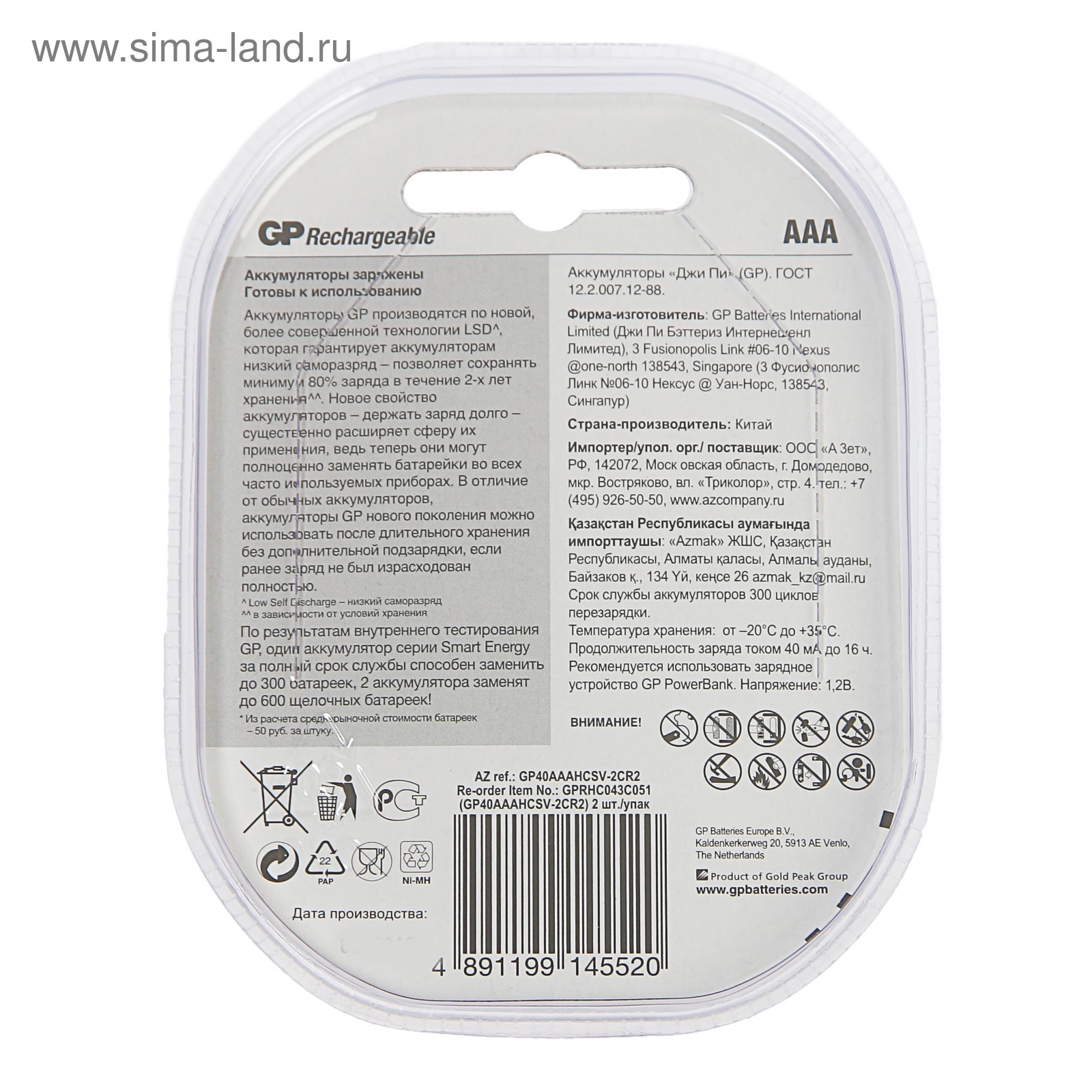 Аккумулятор Gp, Ni-mh, Aaa, Hr03-2bl, 1.2в, 400 мач, блистер, 2 шт.