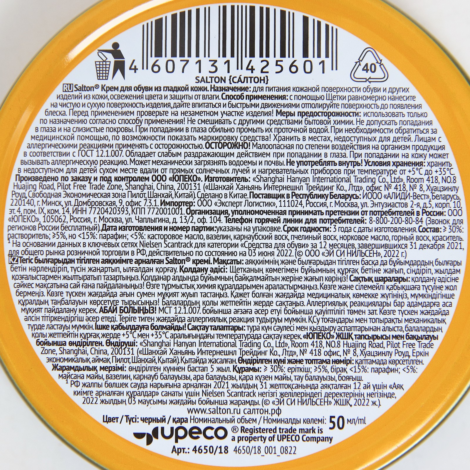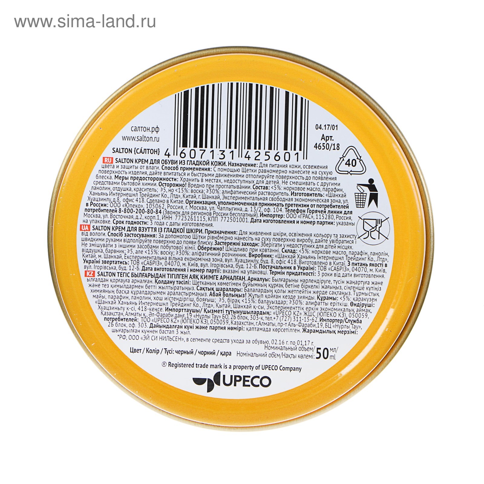 Крем для обуви из гладкой кожи salton, черный, в банке, 50 мл. Благодаря инновационной Технологии All-Day-Effect Крем для обуви SALTON поддерживает ухоженный вид обуви в течение всего дня: предотвращает появление мелких трещин, восстанавливает цвет, придает интенсивный блеск после полировки, обладая водоотталкивающими свойствами. Оригинальная крышка-«щелчок» гарантирует легкость открывания банки и делает процесс использования средством аккуратным. Смягчает кожу, предотвращает появление трещин и выравнивает поверхность кожи. Защищает обувь от влаги. Обновляет цвет. Придает блеск после полировки. С помощью ворсовой Щетки равномерно нанесите крем на сухую поверхность изделия, дайте впитаться и быстрыми движениями отполируйте поверхность до появления блеска. Цвет: Чёрный Вид: Крем С губкой: Нет Назначение: Натуральная кожа Назначение: Искусственная кожа Эффект: Восстановление Эффект: Обновление цвета Эффект: Питание Эффект: Водостойкость Форма выпуска: Банка  развернуть описание ▼