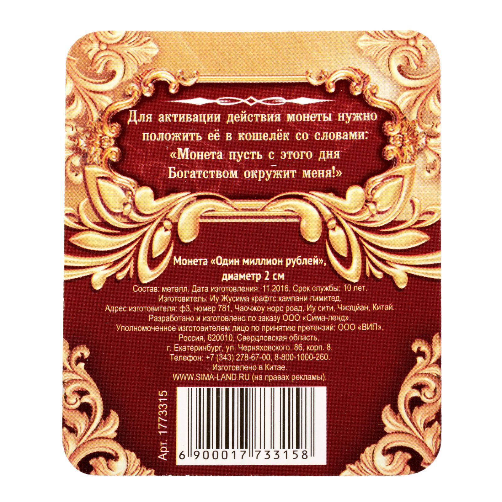 Монета сувенир «один миллион рублей», d=2 см.. Монета - это оригинальный талисман на богатство, любовь и удачу, счастье и успех. Эта монета обязательно принесет удачу тому, кому повезет стать ее обладателем. Чтобы всегда везло в денежных делах, монету можно положить в кошелёк – тогда он никогда не опустеет. Оригинальный сувенир и удачный подарок для каждого! Для кого:Унисекс|Вид упаковки:Подложка|Тематика праздника:Универсальная тематика|Материал:Металл|Тематика:Денежные|Страна:Китай  развернуть описание ▼