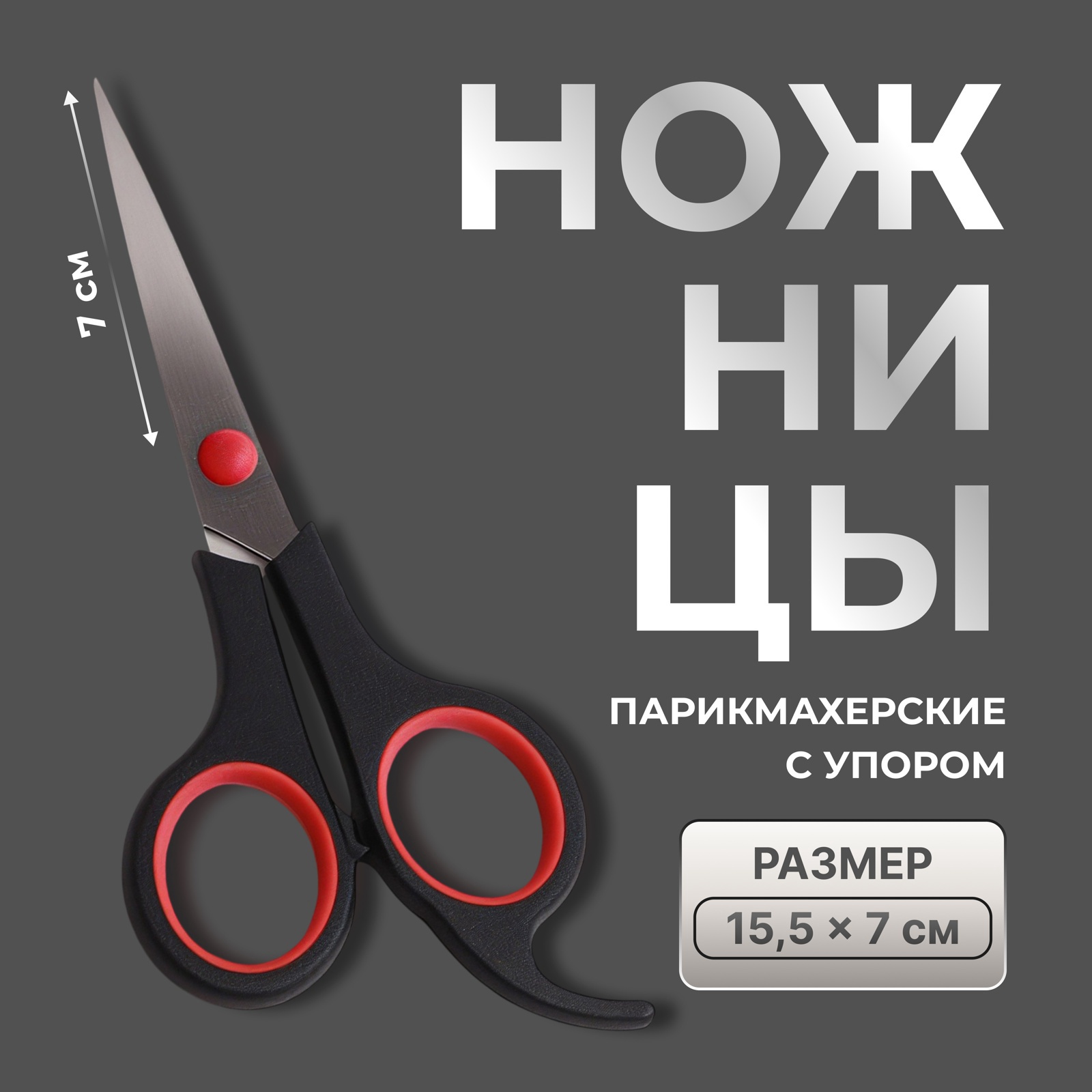 Ножницы парикмахерские с упором, лезвие — 7 см, чёрные, красные. Острые ножницы — незаменимый помощник парикмахера. Длинные лезвия справятся с объёмными волосами. Упор на кольцах сделает стрижку удобнее: вы можете контролировать силу нажатия до миллиметра. Набор:Нет|Цвет:Красный|Цвет:Чёрный|Цвет:Серебристый|Длина лезвия, см:7|Вид упаковки:Подложка|Материал:Металл|Материал:Пластик|Покрытие:Без покрытия|Назначение ножниц:Для стрижки|Регулируемые (винт):Да|Упор:Да|Размер, дюйм:6|Страна:Китай  развернуть описание ▼