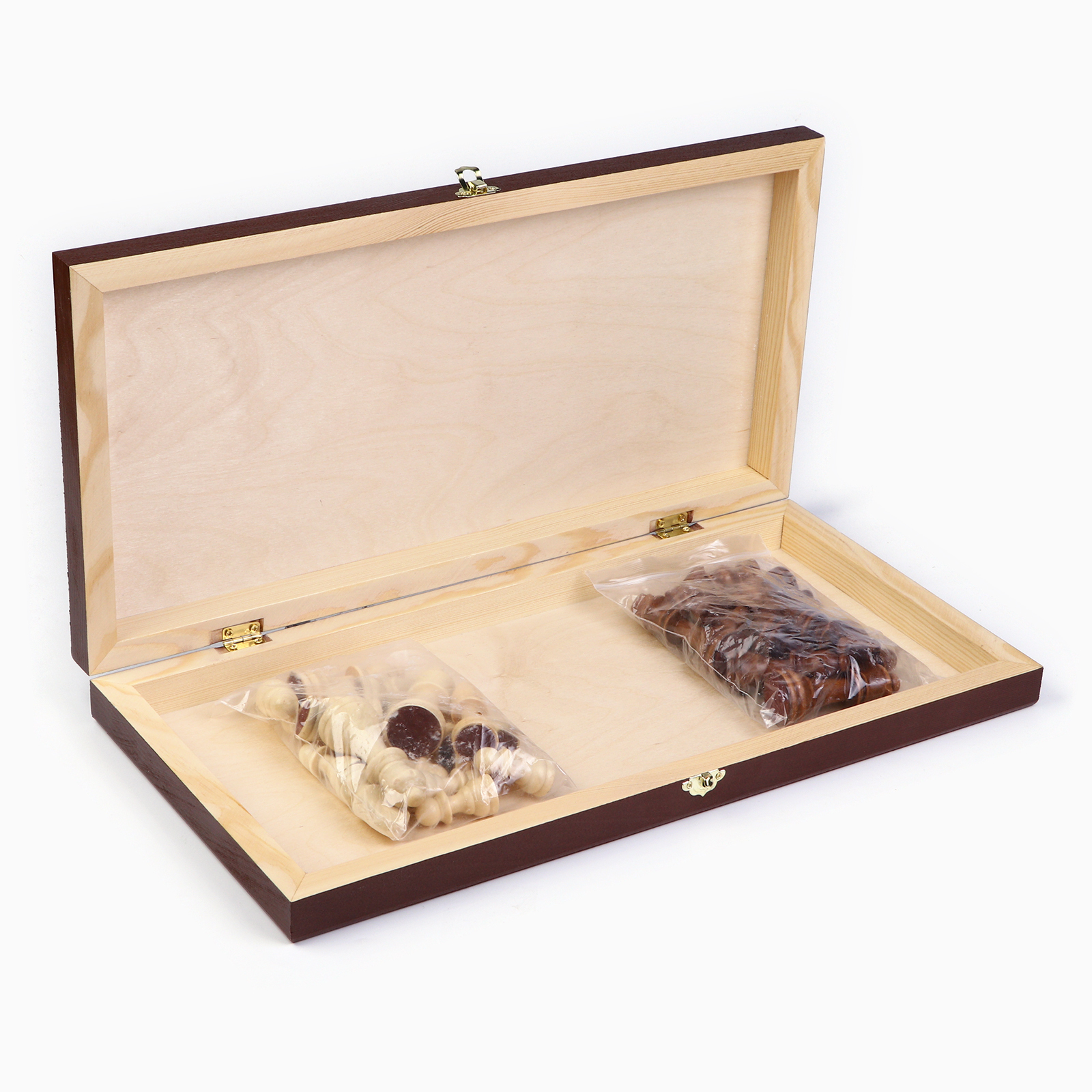 Шахматы деревянные отличаются высоким качеством изготовления. Фигурки выполнены из натурального дерева, сверху нанесено защитное лаковое покрытие. Доска изготовлена из дерева 50 x 50 см.
