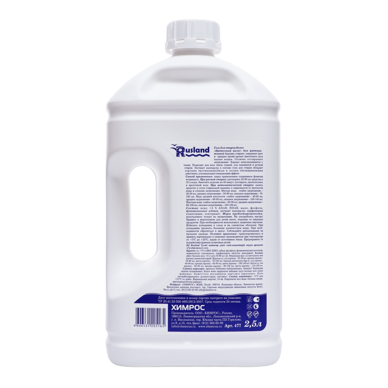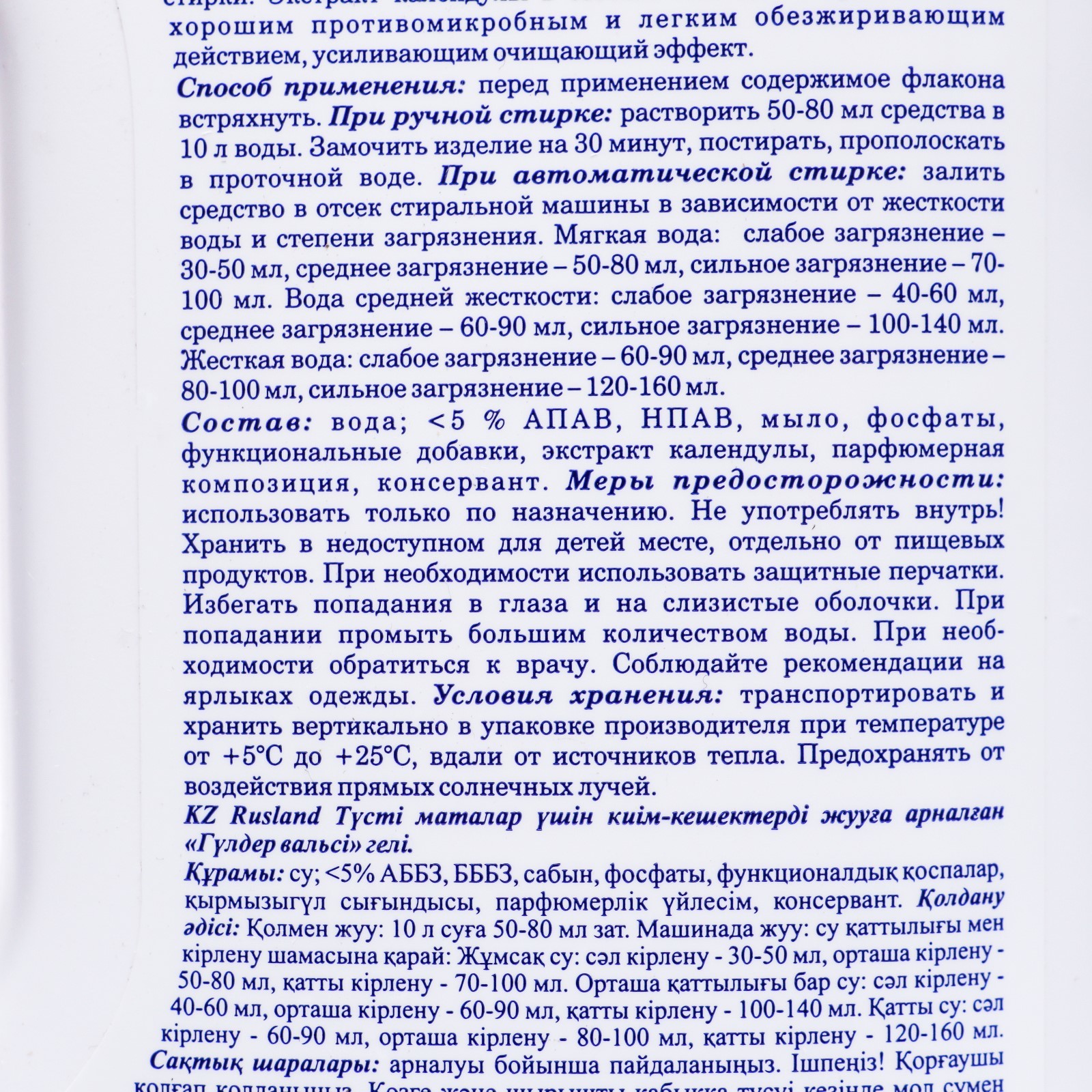 Гель для стирки белья rusland "цветочный вальс" для цветных тканей, 2,5 л. Гель Rusland бережно стирает, сохраняет цвет и наполняет бельё ярким ароматом цветочного луга. Он придаёт волокнам мягкость и дополнительную защиту. Средство содержит экстракт календулы, который убивает бактерии и обладает обезжиривающим действием. Особенности: хорошо выполаскивается; удаляет любые загрязнения; подходит для машинной и ручной стирки. Объём, л: 2.5 Назначение: Для цветных тканей Вид стирки: Для всех видов стирки : 0  развернуть описание ▼