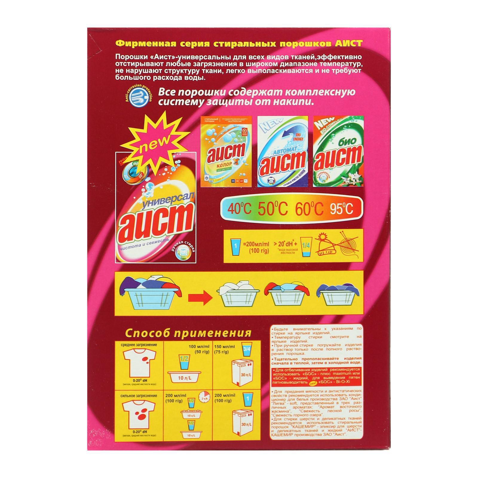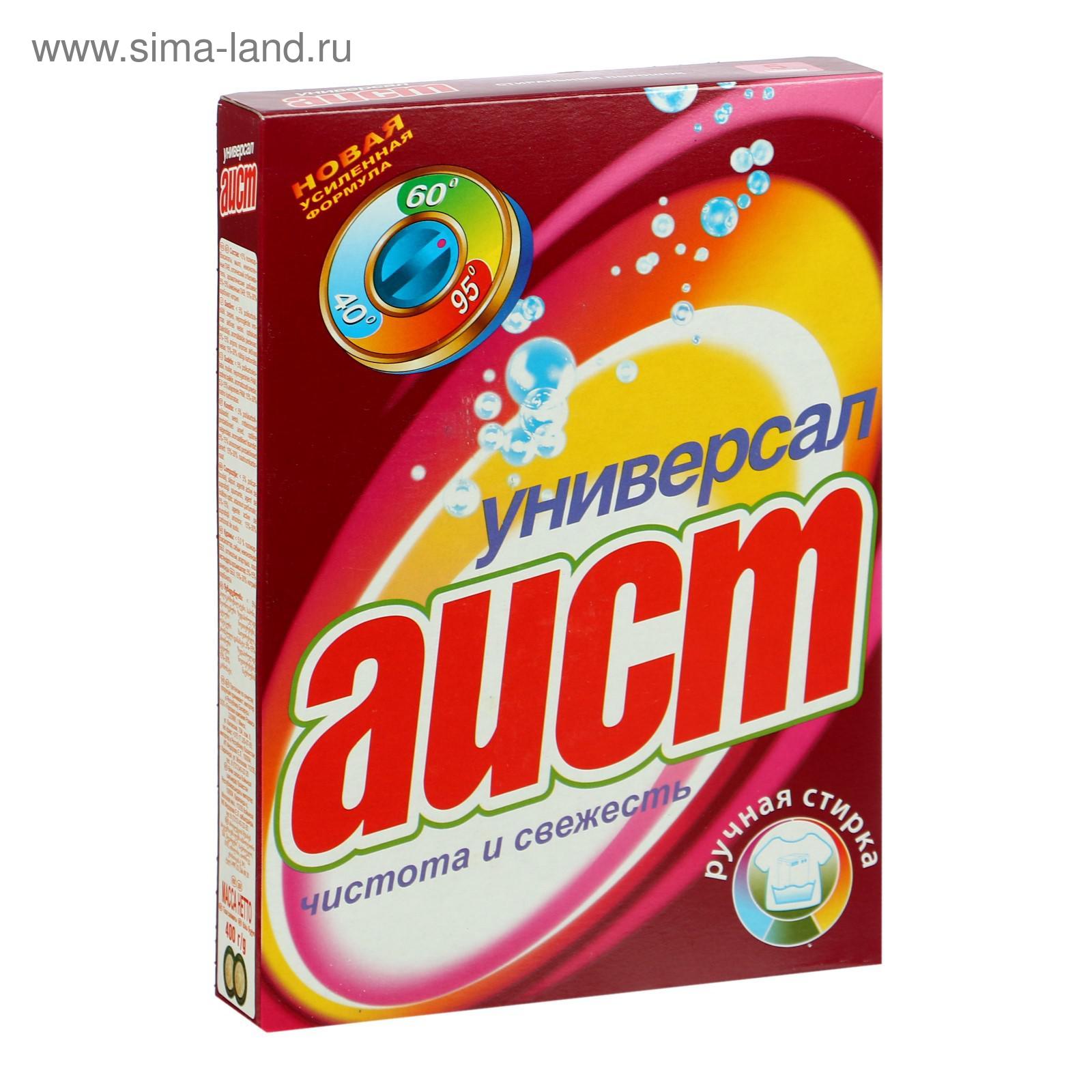 Стиральный порошок "аист", универсальный, 400 г. Используйте порошок «Аист Универсал» для стирки изделий из хлопчатобумажных, льняных, искусственных, синтетических и смешанных волокон. Особенности: легко выполаскивается; не нарушает структуру ткани; отстирывает любые загрязнения при температуре от 40 до 95 °С; защищает стиральную машину от накипи; не требует большого расхода воды. Средство подходит для машин активаторного типа и ручной стирки. Вес, г: 400 Объём, мл: 400 Назначение: Для всех видов тканей Вид стирки: Ручная  развернуть описание ▼
