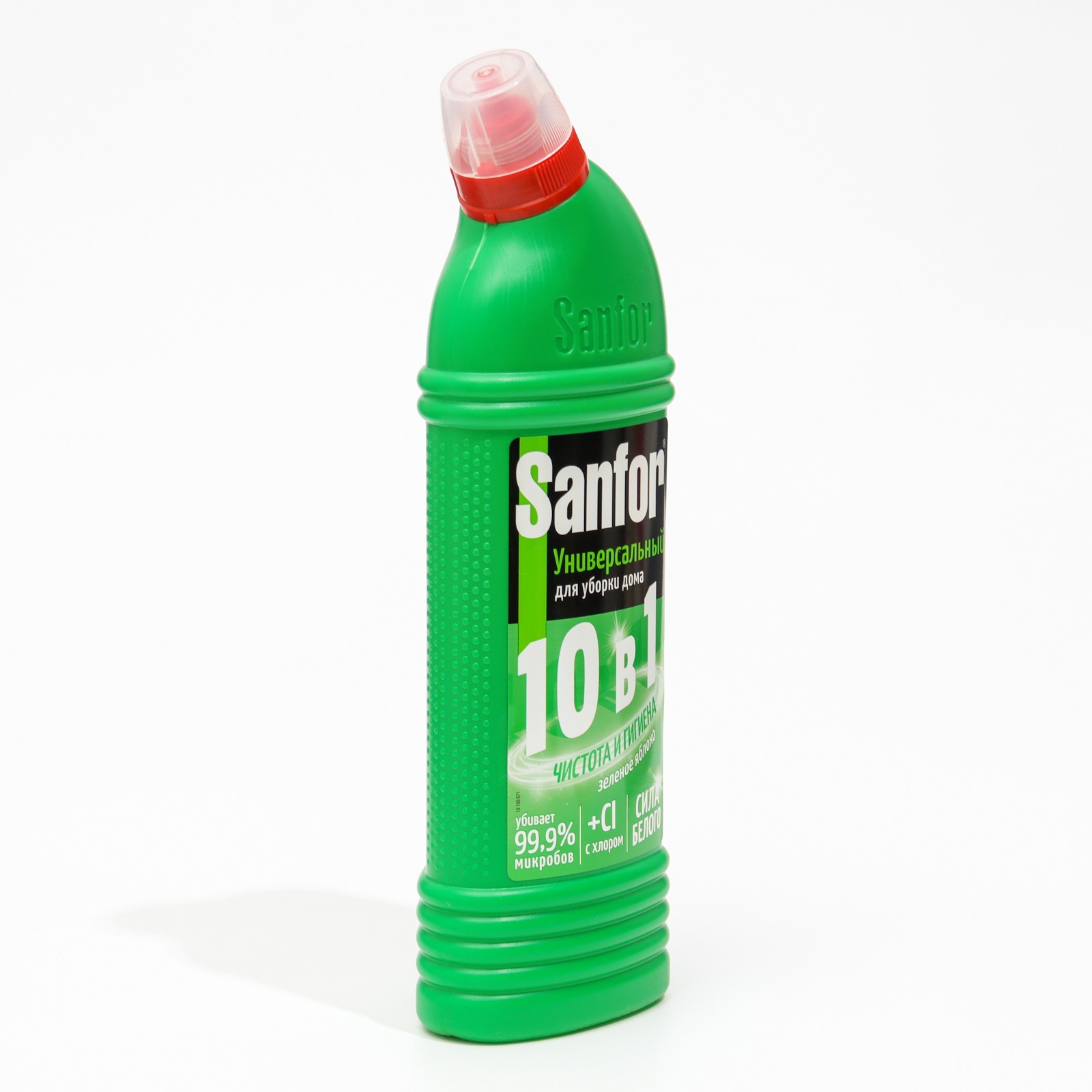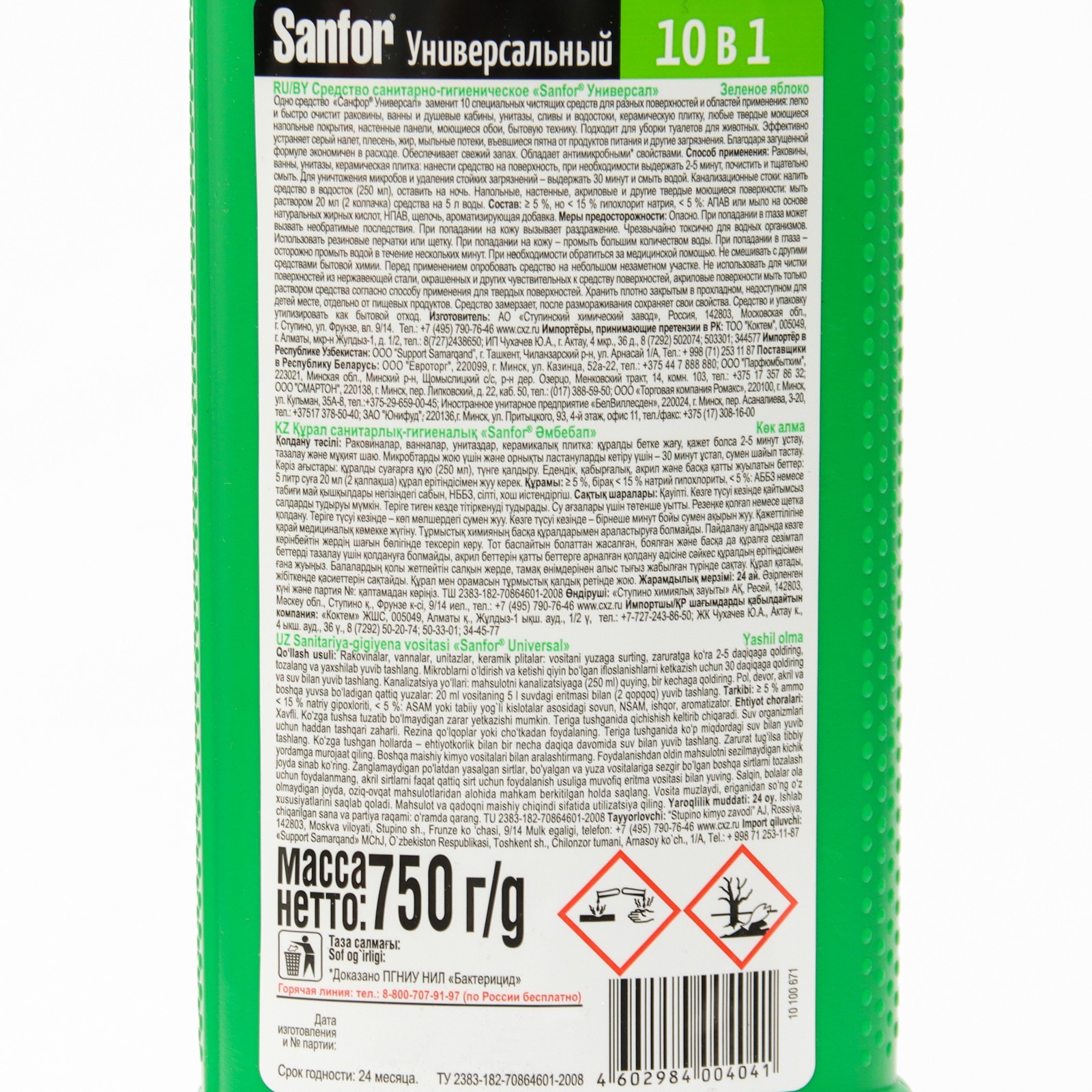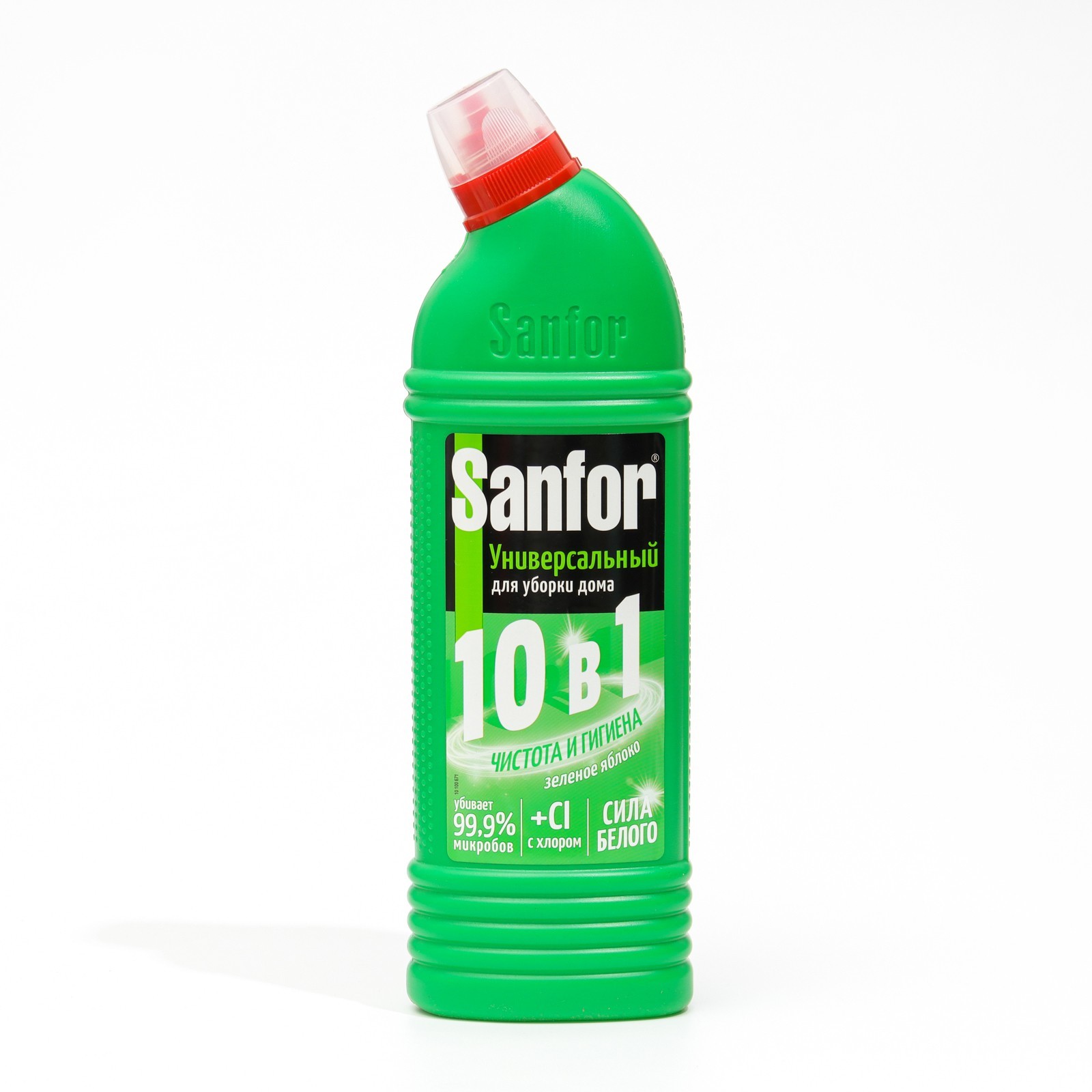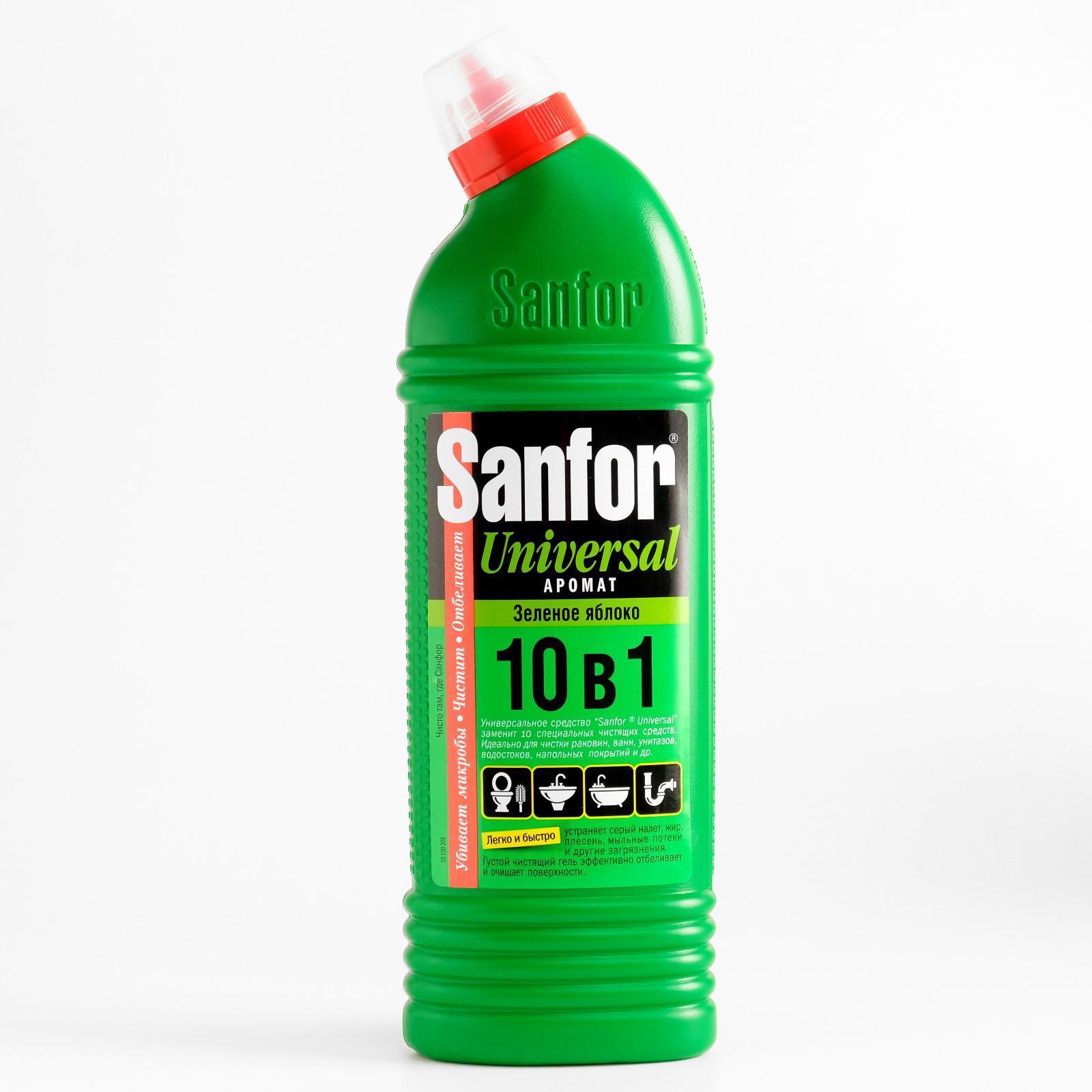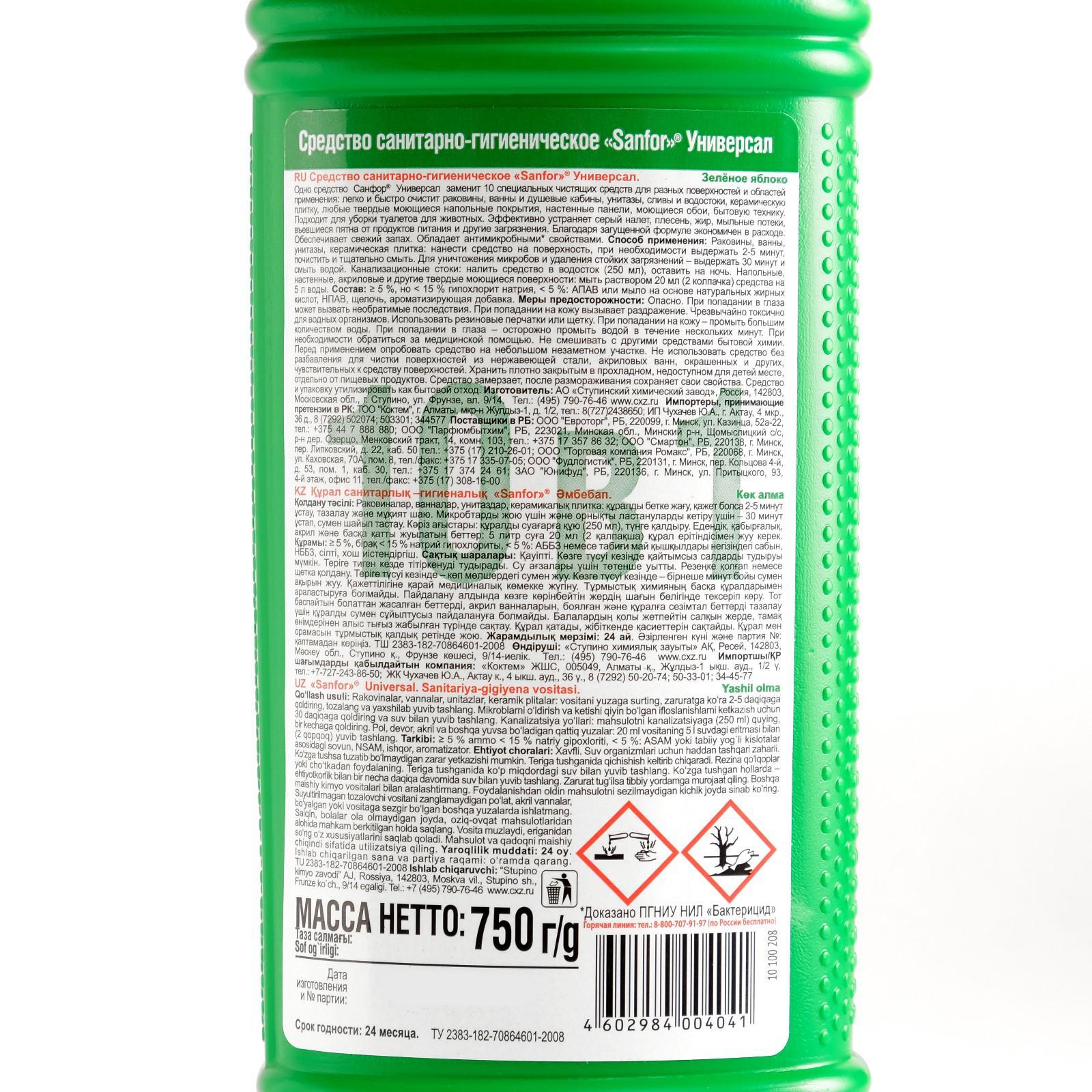 Чистящее средство sanfor "зеленое яблоко", антимикробный, гель, универсальное, 750 мл. Универсал заменит 10 специальных чистящих средств для разных поверхностей и областей применения – легко и быстро очистить раковины, ванны и душевые кабины, унитазы, сливы и водостоки, керамическую плитку, любые твердые моющиеся напольные покрытия, настенные панели, моющиеся обои, бытовую технику. Подходит для уборки туалетов для животных. Эффективно устраняет серый налет, плесень, жир, мыльные потеки, въевшиеся пятна от продуктов питания и другие загрязнения. Способ применения: раковины, ванны, унитазы, керамическая плитка – нанести средство на поверхность, при необходимости выдержать 2-5 минут, почистить и тщательно смыть. Для уничтожения микробов и удаления стойких загрязнений – выдержать 30 минут и смыть водой. Канализационные стоки – налить средство в водосток 250 мл, оставить на ночь. Напольные, настенные, акриловые и другие твердые моющиеся поверхности – мыть раствором 20 мл (2 колпачка) средства на 5 л воды. Меры предосторожности: опасно. При попадании на кожу – промыть большим количеством воды. При попадании в глаза – осторожно промыть водой в течении нескольких минут. При необходимости обратиться к врачу. Не смешивать с другими средствами бытовой химии. Хранить в недоступном для детей месте. Средство замерзает, после размораживания сохраняет свои свойства. Состав: 5% гипохлорит натрия, апав 5%, мыло на основе натуральных жирных кислот, нпав, щелочь, ароматизирующая добавка. Вес, г/Объём, мл: 750 Назначение: Универсальное : 0 Эффект: Дезинфицирующее Эффект: Очищение  развернуть описание ▼