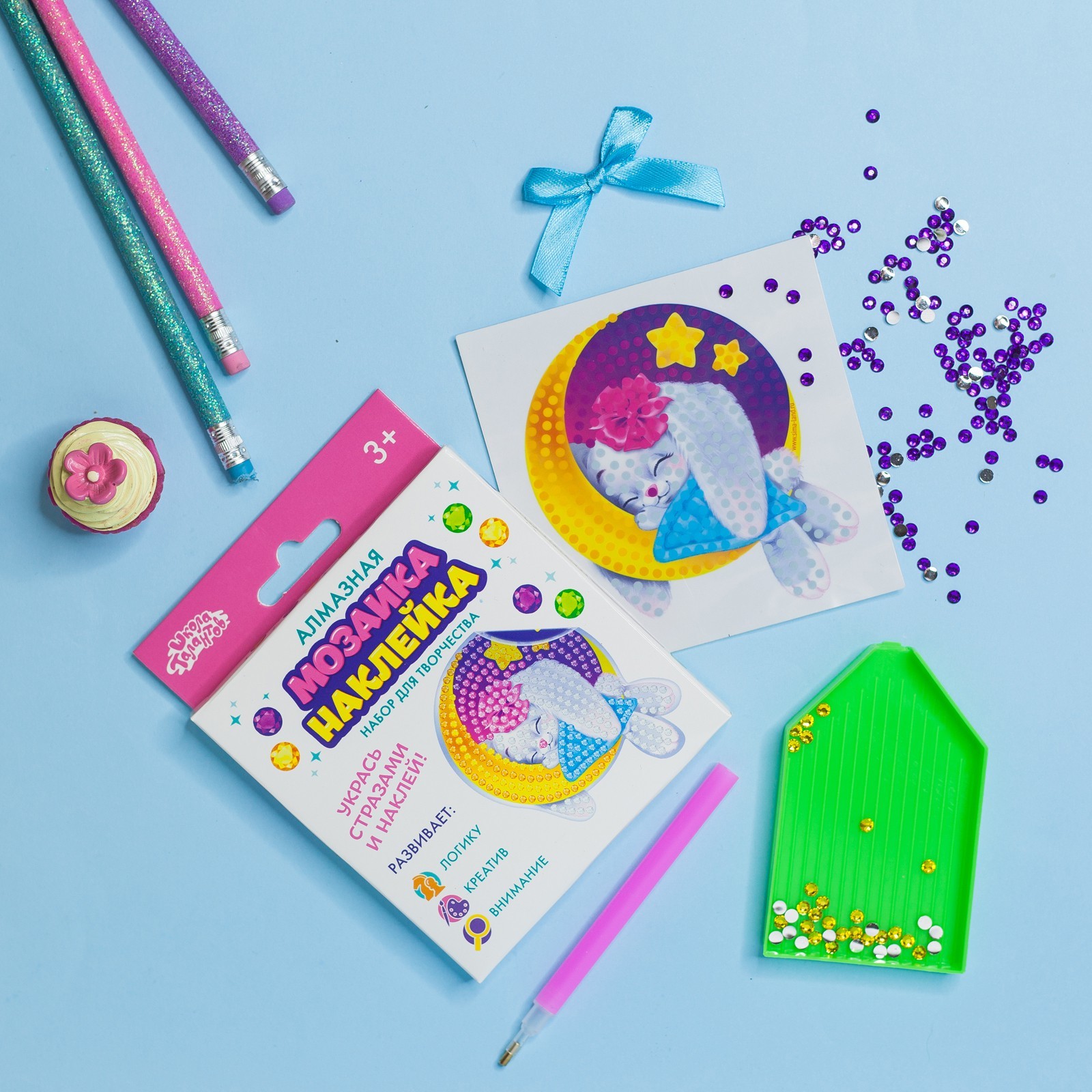 Алмазная мозаика-стикер на наклейке для детей «зайка». Алмазная мозаика — это увлекательный вид творчества, который понравится любому малышу! Ребёнку предстоит разложить карандашом кристаллики, постепенно заполняя рисунок элементами соответствующего цвета. Основа с клеевым покрытием будет надёжно удерживать стразы. Готовое творение можно вырезать и прикрепить на гладкую поверхность. Мерцающая картина станет украшением рабочего места юного творца. Стразы немного крупнее полей, поэтому их лучше располагать плотнее друг к другу и в шахматном порядке. Количество цветов:7|Для кого:Унисекс|Размер, см:7 х 9|Ширина, см:10|Высота, см:10|Возраст:От 3 лет|Тематика:Животный мир|Тематика:Детская|Символ года:Нет|Материал для аппликации:Стразы|Тип выкладки:С полным заполнением|Вид наклейки:Наклейка-стразы|Форма страз:Круглые|Тип основы:Наклейка|Страна:Китай  развернуть описание ▼