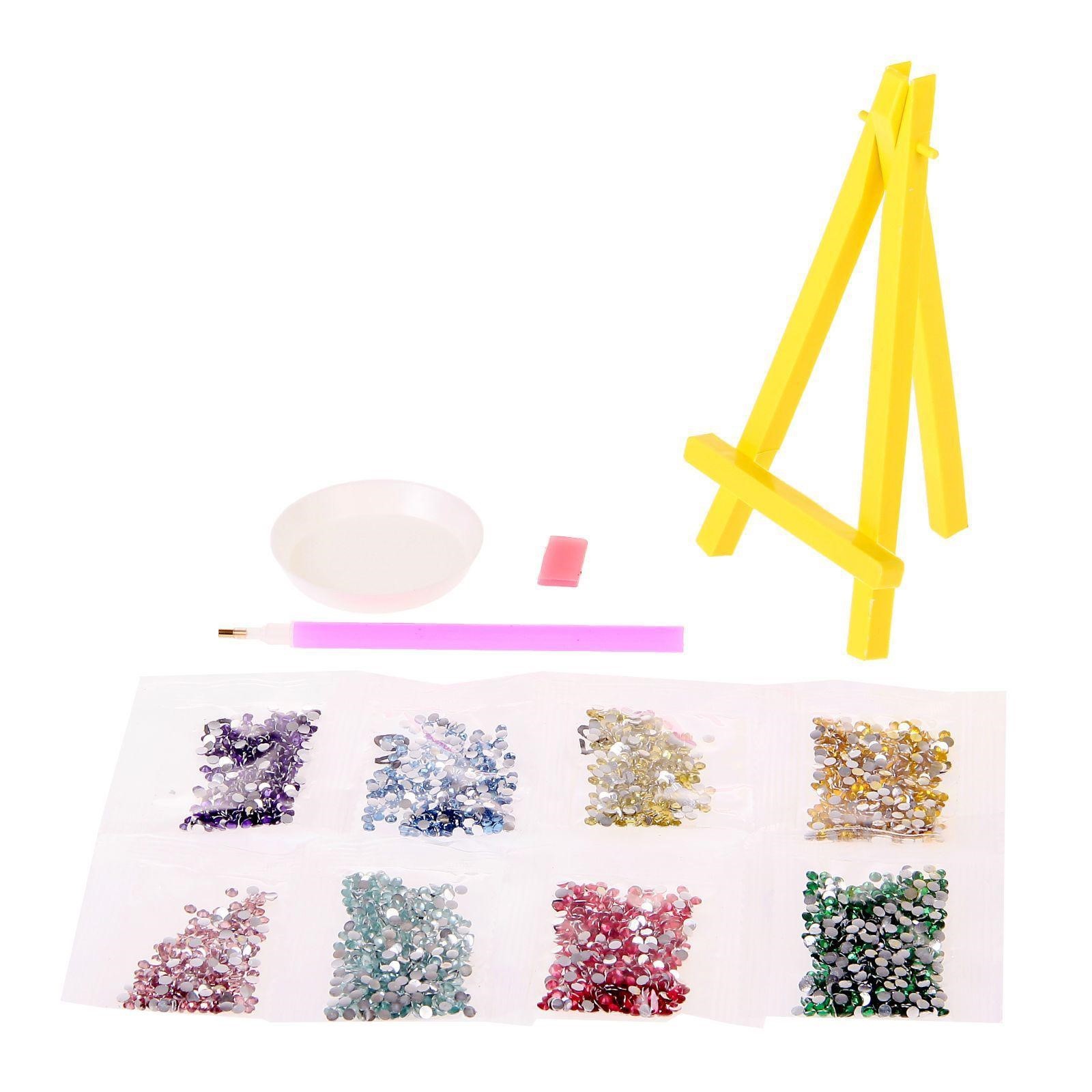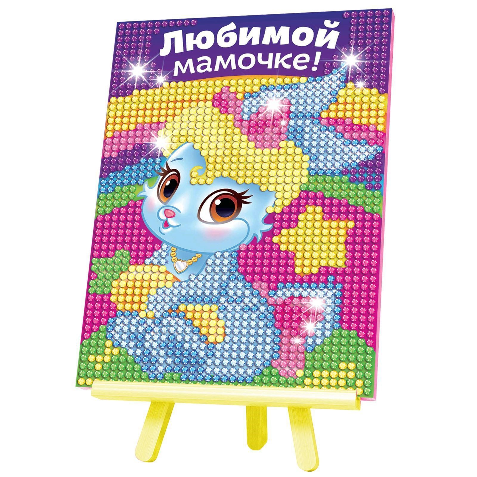 Алмазная мозаика с частичным заполнением на подставке для детей «любимой мамочке!», 10 х 15 см. Алмазная мозаика — это увлекательный вид творчества, который понравится любому малышу! Ребёнку предстоит разложить кристаллики карандашом по пронумерованной схеме, заполнив всё полотно. Основа с клеевым покрытием будет надёжно удерживать стразы. На ней уже обозначены необходимые оттенки, а цветовая таблица расположена на упаковке. В наборе есть небольшой мольберт: с ним готовое творение можно расположить на полке или столе без дополнительных креплений. В таком интересном оформлении сверкающая картина будет выглядеть как предмет искусства. Как создать мозаику Для начала откройте небольшой участок схемы, приподняв и отогнув защитную плёнку. Не открывайте всю схему сразу.Из пакетика с номером, который соответствует схеме, отсыпьте в ёмкость немного стразов.Возьмите специальный карандаш, окуните кончик в клеевую подушечку (розовый квадратик), возьмите страз. Таким образом заполните рисунок.Немного терпения, и сверкающая картина готова! Количество цветов:8|Для кого:Для девочки|Размер, см:10 х 15|Ширина, см:10|Высота, см:15|Возраст:От 3 лет|Тематика:Детская|Тематика:Животный мир|Адресат:Маме|Ориентация изображения:Вертикально|Материал для аппликации:Стразы|Тип выкладки:С частичным заполнением|Тип:Алмазная мозаика|Форма страз:Круглые|Тип основы:Картон|Страна:Китай  развернуть описание ▼