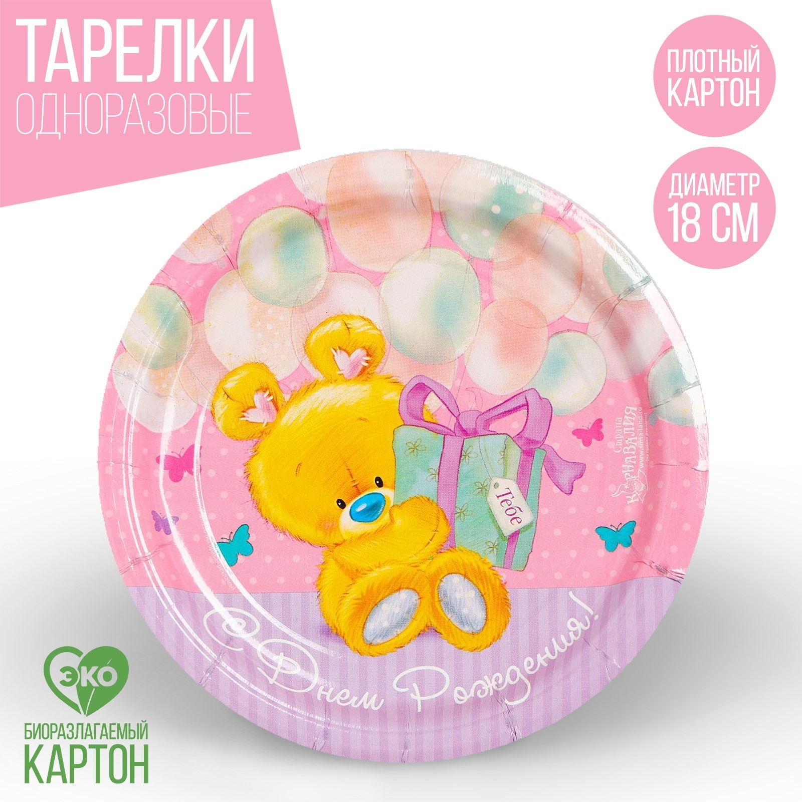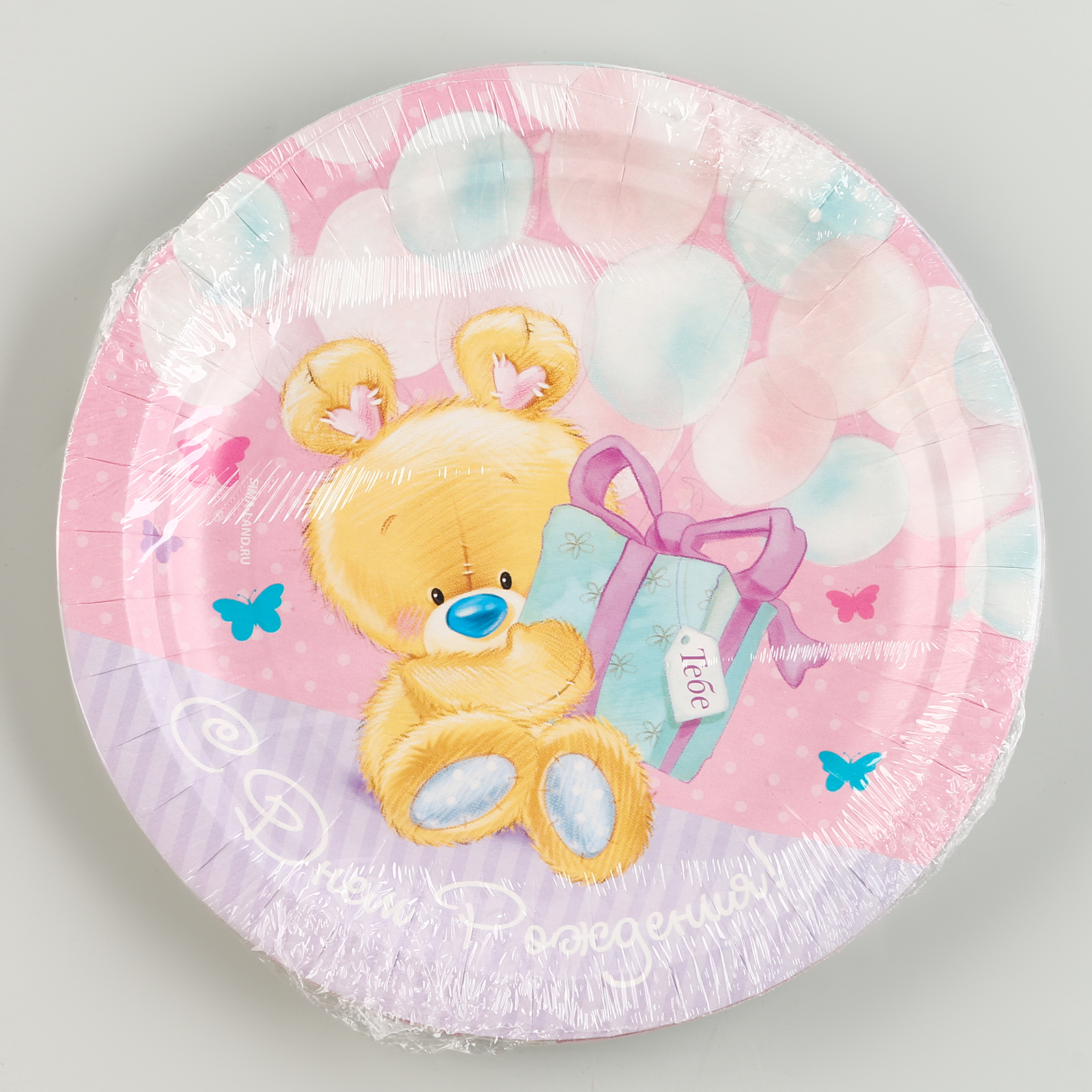 Тарелка одноразовая бумажная "с днем рождения" мишутка с подарком (18 см)