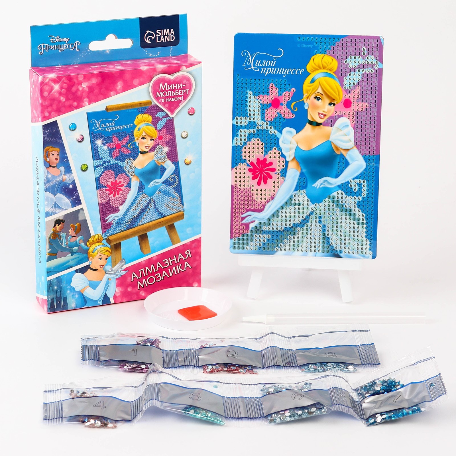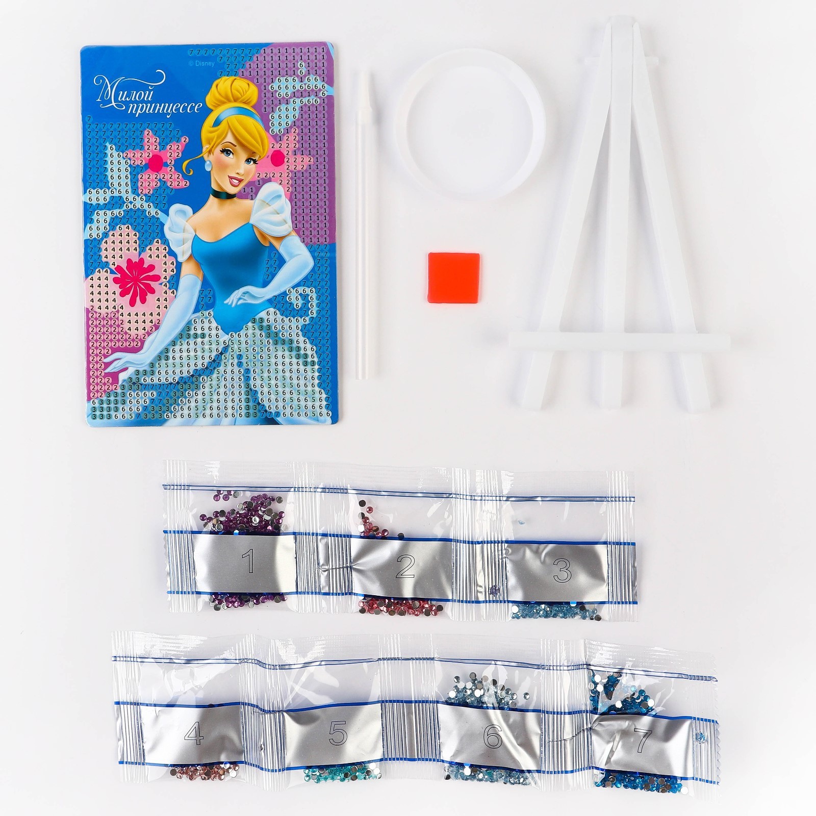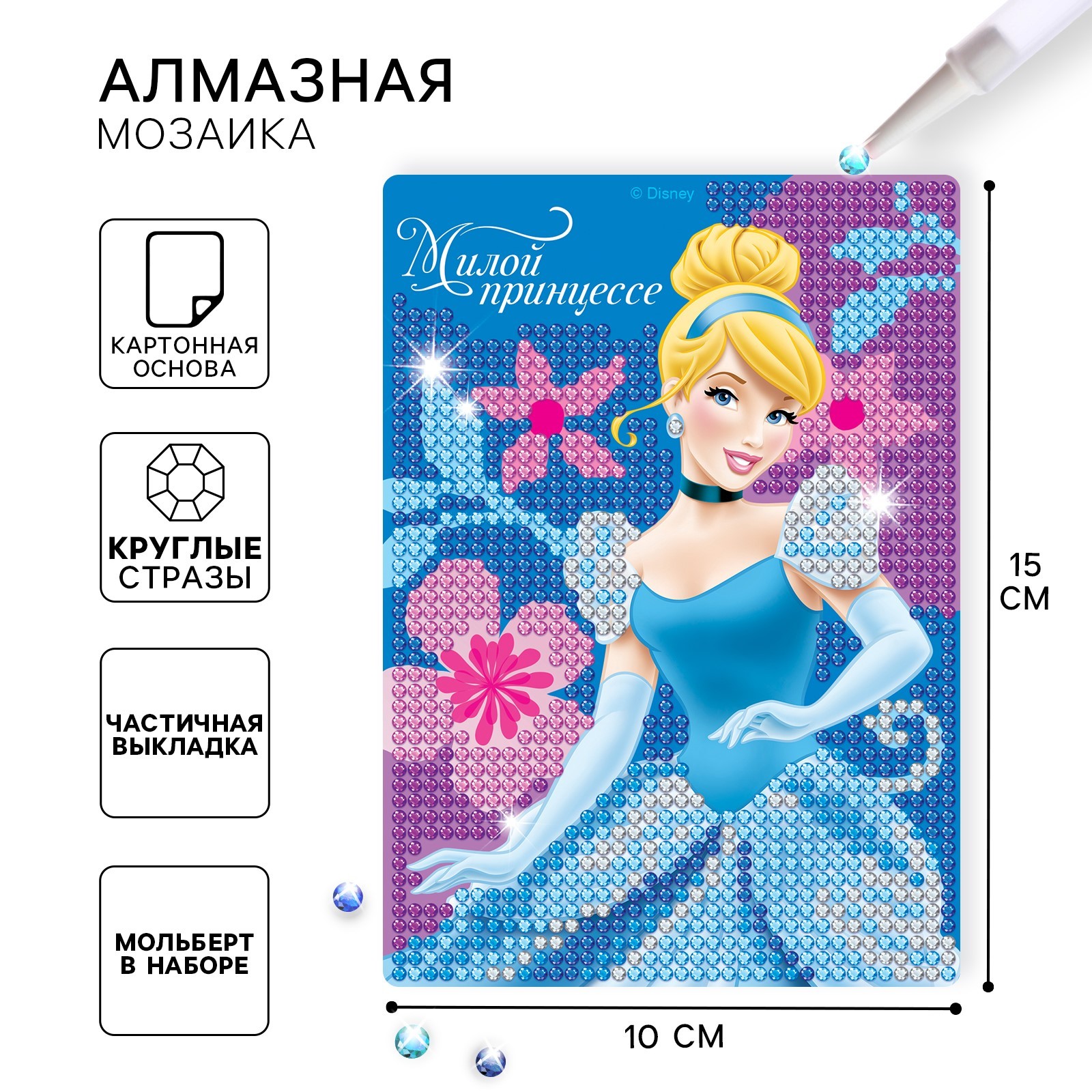 Алмазная мозаика с частичным заполнением для детей «принцессы», 15 х 10 см. Аккуратно, легко, безопасно. Без ножниц и клея! Алмазная вышивка-мозаика с любимыми персонажами — отличный бюджетный подарок и прекрасный способ увлечь ребёнка творчеством! В наборе: картинка-основа, стразы, поддон для страз,специальный карандаш,мини-мольберт из жёлтого пластика. Инструкция Приподнимите защитный слой с небольшого участка картины-основы. Чтобы вязкость клеевого состава не снижалась, не открывайте всю схему. Найдите номер на схеме и из пакетика с ним высыпьте в поддон немного деталей. Снимите защитную плёнку с клеевой подушечки. Окуните в неё карандаш для алмазной вышивки таким образом, чтобы клей попал внутрь стержня. Он поможет вам с лёгкостью перенести стразы из поддона на картинку. Старайтесь чуть прижимать стразы к основе и располагать их как можно ближе друг к другу. После того как все детали наклеены, поместите работу на мольберт. Шедевр готов! Набор:Да|Количество цветов:7|Цвет:Разноцветный|Для кого:Для девочки|Формат:А6|Размер, см:10 х 15|Ширина, см:10.5|Высота, см:15|Возраст:От 3 лет|Тематика:Мультфильмы|Тематика:Детская|Символ года:Нет|Ориентация изображения:Вертикально|Жанр игры:На фантазию|Развитие навыков:Моторика|Материал для аппликации:Стразы|Тип выкладки:С частичным заполнением|Для создания:Набор для декорирования|Составляющие набора:Товары для творчества|Форма страз:Круглые|Тип основы:Холст на подрамнике|Страна:Китай  развернуть описание ▼