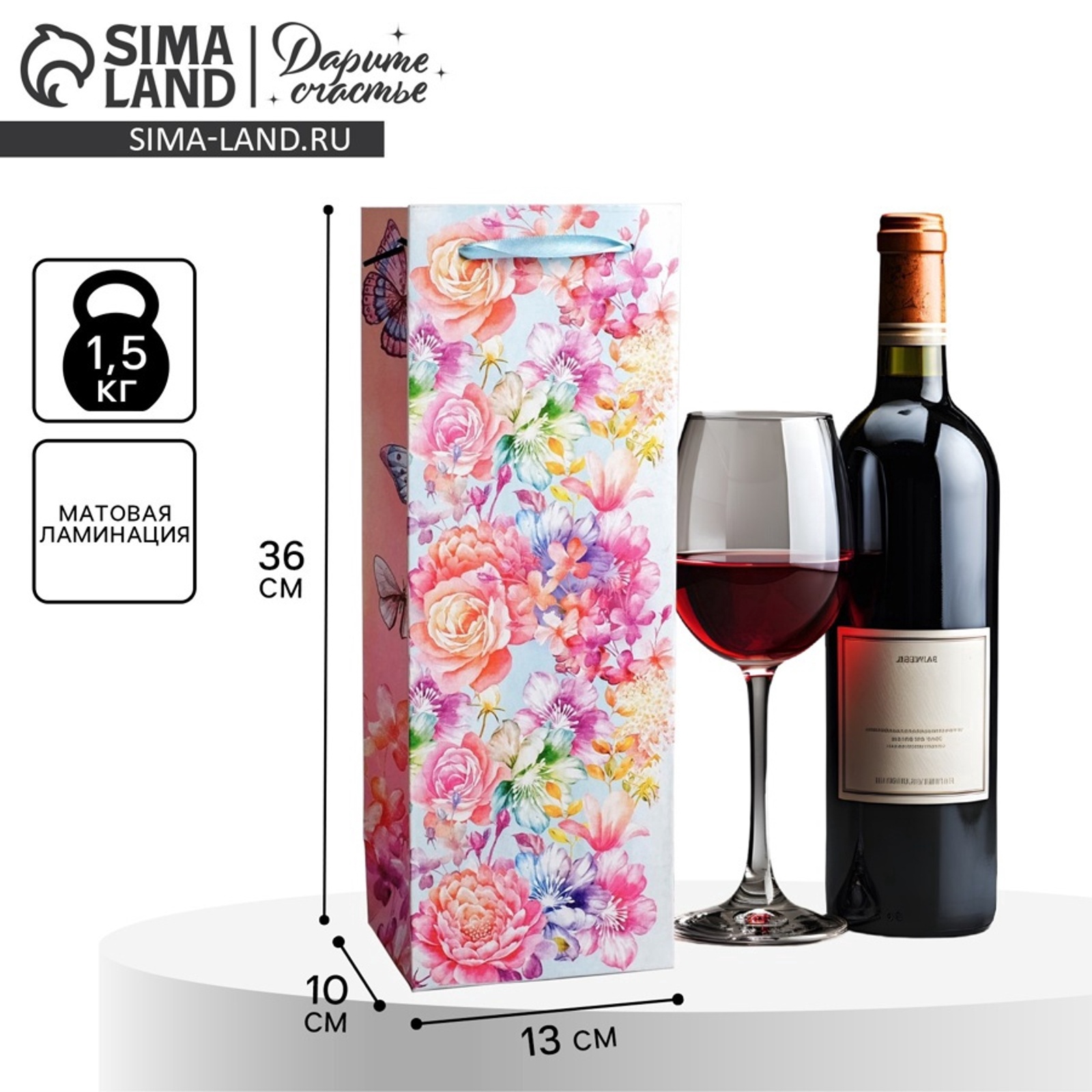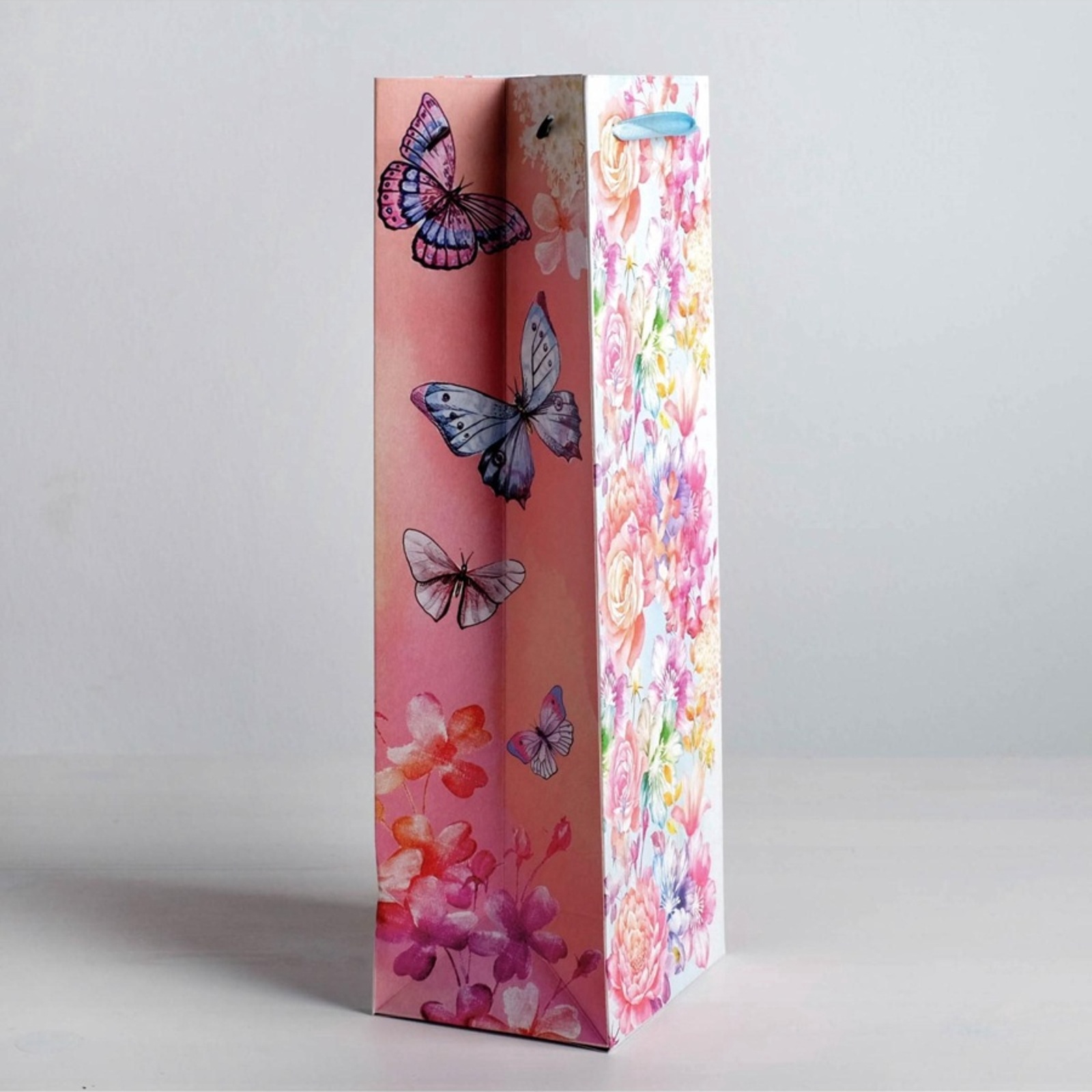 Пакет подарочный ламинированный под бутылку, упаковка, «цветы и бабочки», 13 х 36 х 10 см