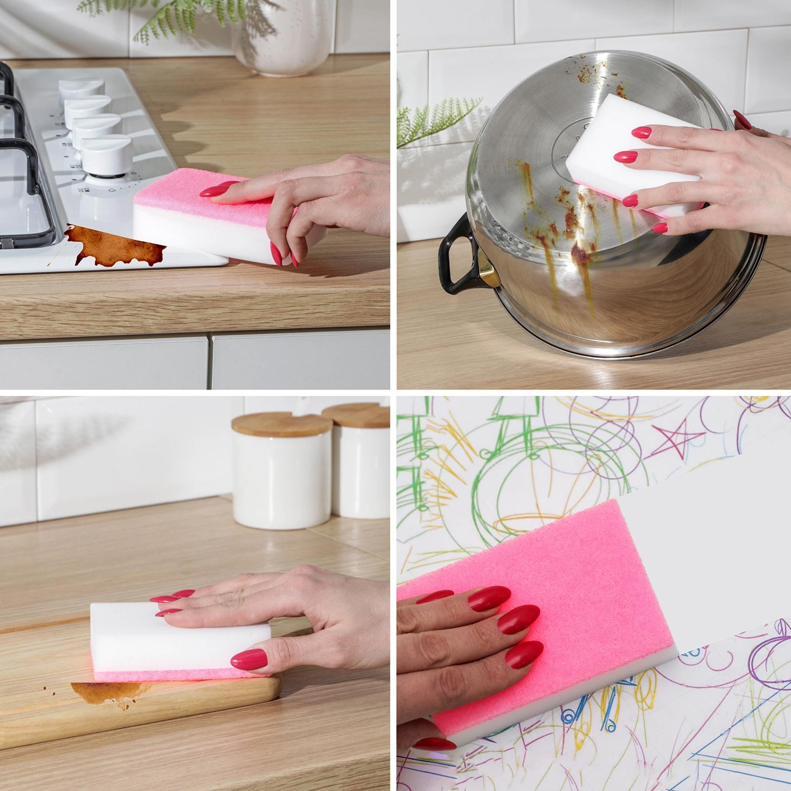 Губка не имеет запаха и позволяет с легкостью очистить обувь (особенно эффективно на светлой подошве), сантехнику, пластиковые окна, керамическую плитку, бытовую технику и другие поверхности. Меланиновая губка легко удалит налет и пятна ржавчины, жирных пятен, плесени. Имеется абразивный слой. Как использовать: