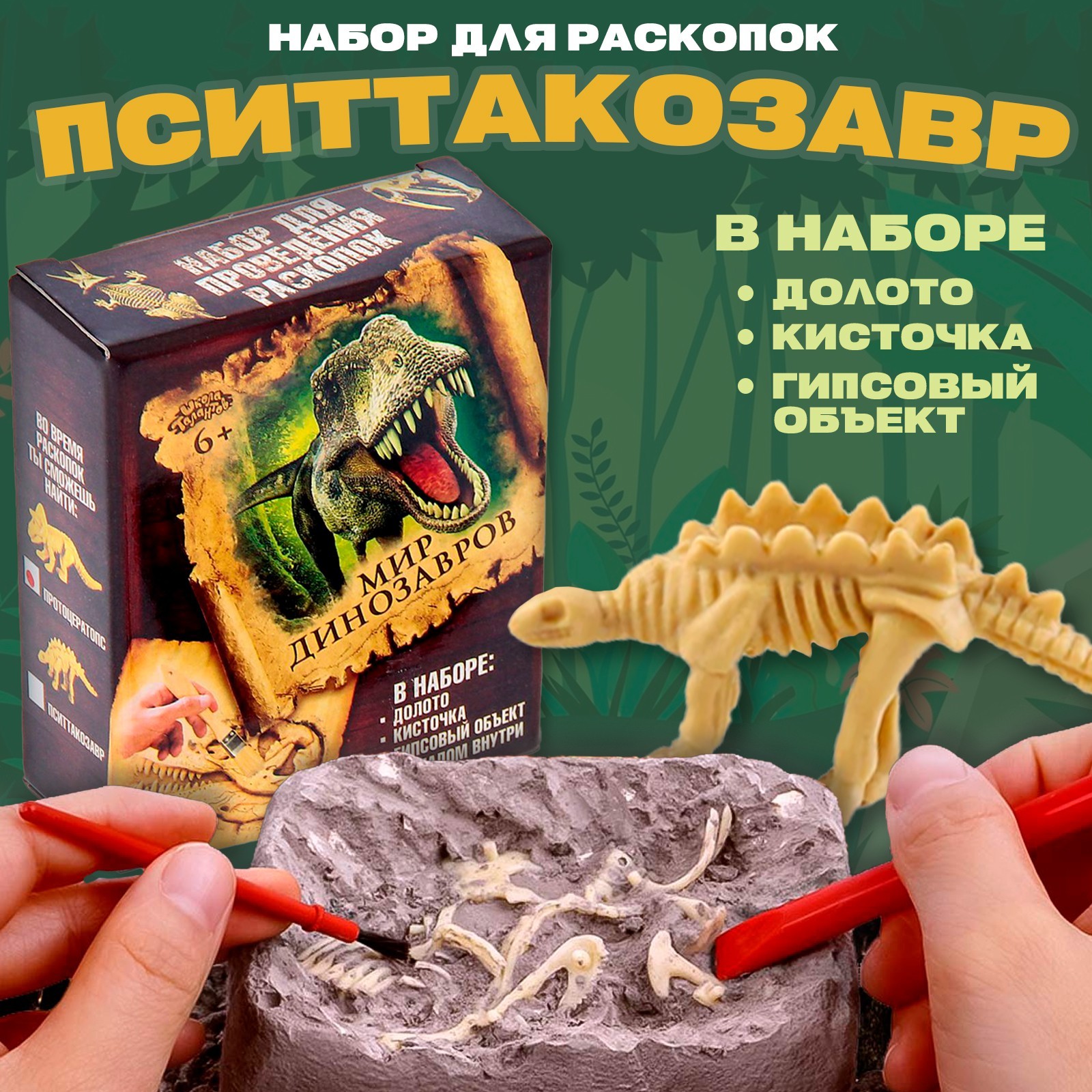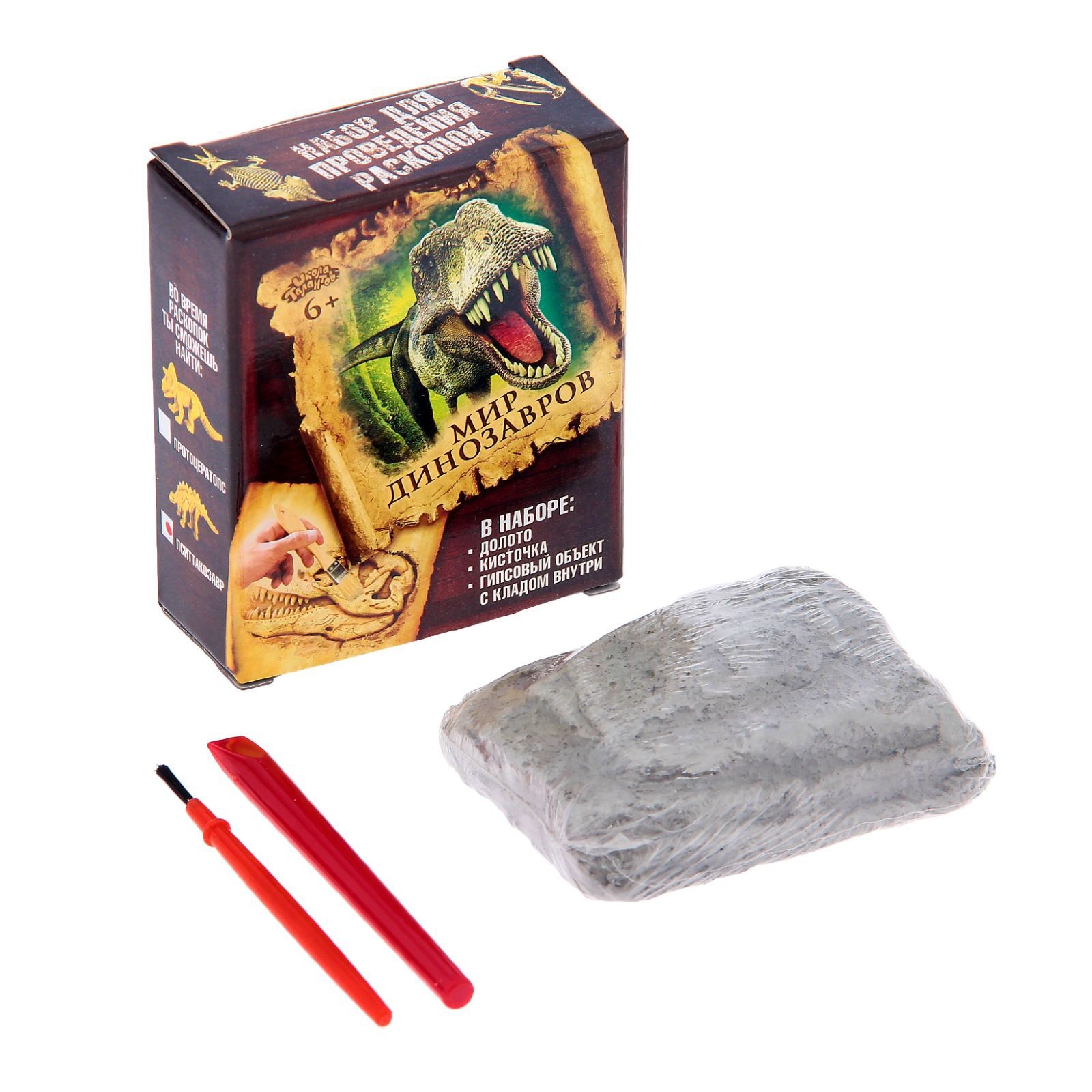 Раскопки «динозавры: пситтакозавр». Набор для раскопок не оставит равнодушными любознательных исследователей истории планеты Земля. Руководство по раскопкам С помощью долота создавайте канавки на окаменелости, а образующийся песок аккуратно удаляйте кисточкой.Извлекайте скелет динозавра из грунта. Будьте аккуратны, ведь он пролежал под землёй много миллионов лет!В наборе: долото, кисточка, гипсовый объект с кладом внутри. Рекомендовано для детей от 6 лет. Набор:Да|Для кого:Для мальчика|Возраст:От 7 лет|Вид упаковки:Коробка картонная|Научная тема:Археология|Материал:Гипс|Тематика набора:Раскопки|Страна:Китай  развернуть описание ▼