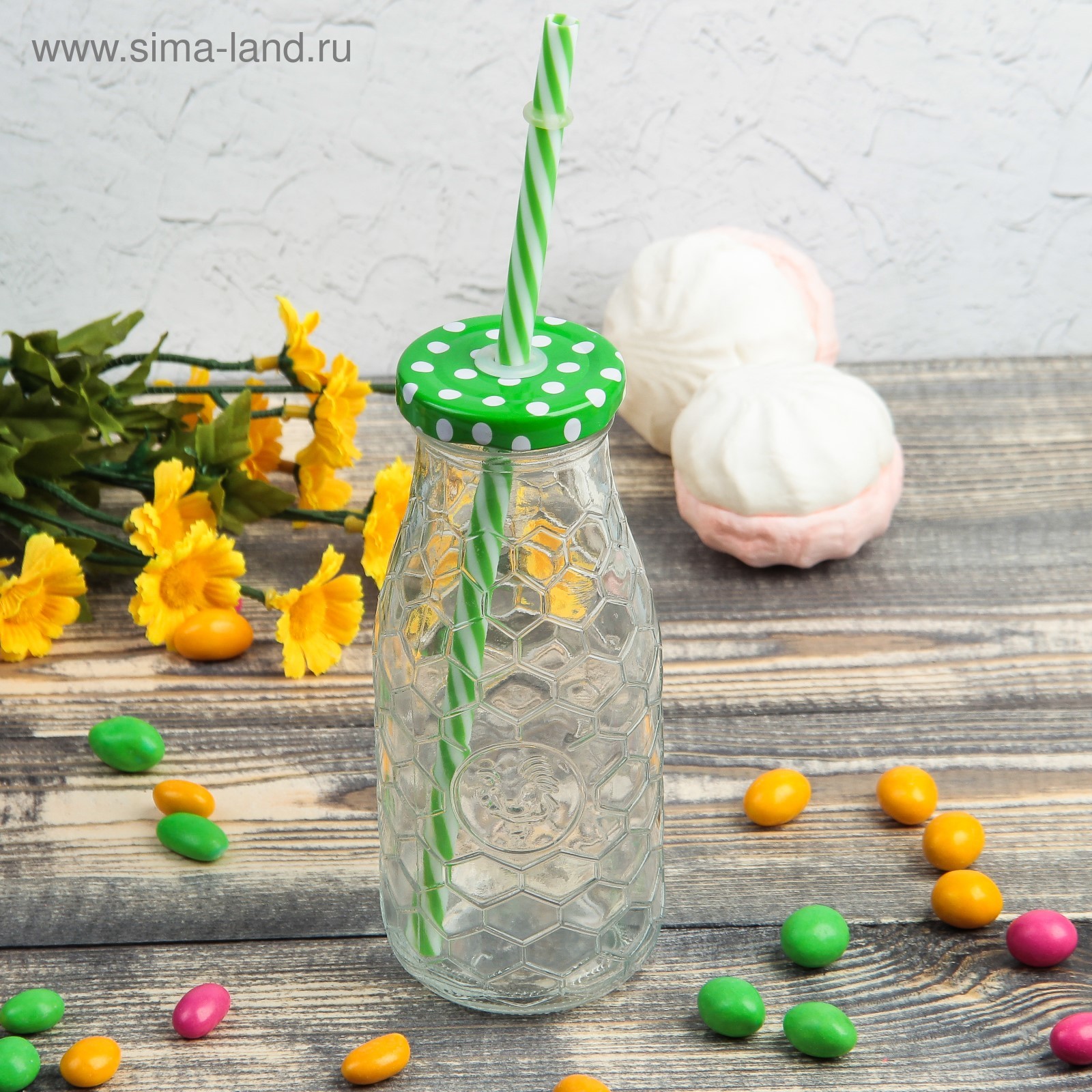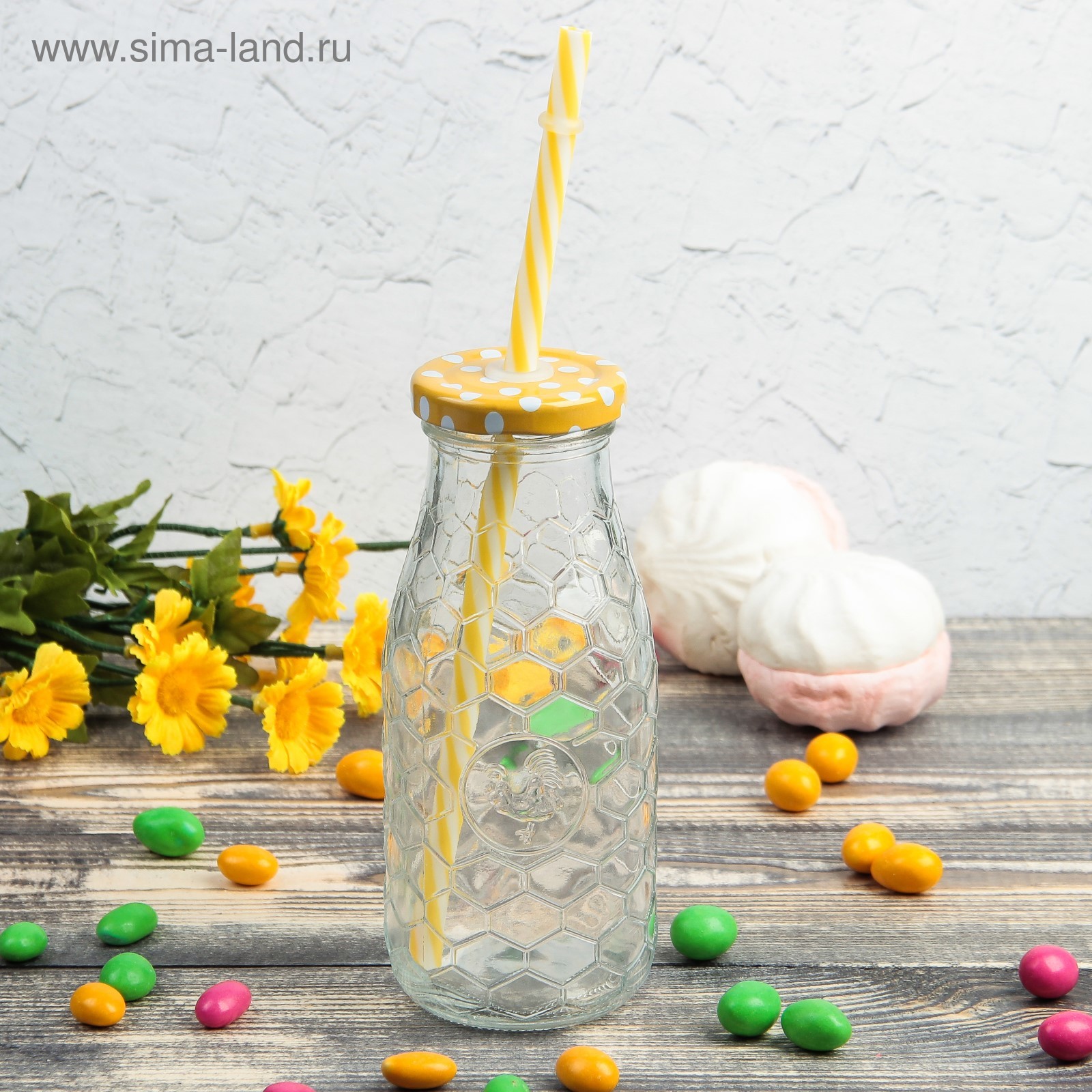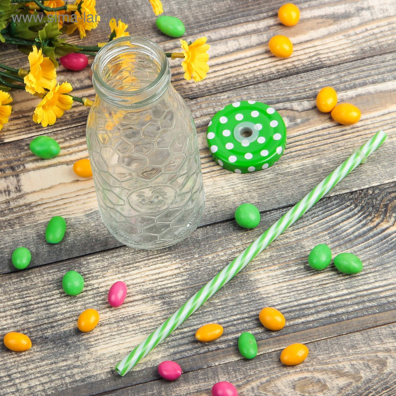 Бутыль стеклянная с крышкой и трубочкой «соты», 300 мл, 6,5x15,5 см, цвет микс