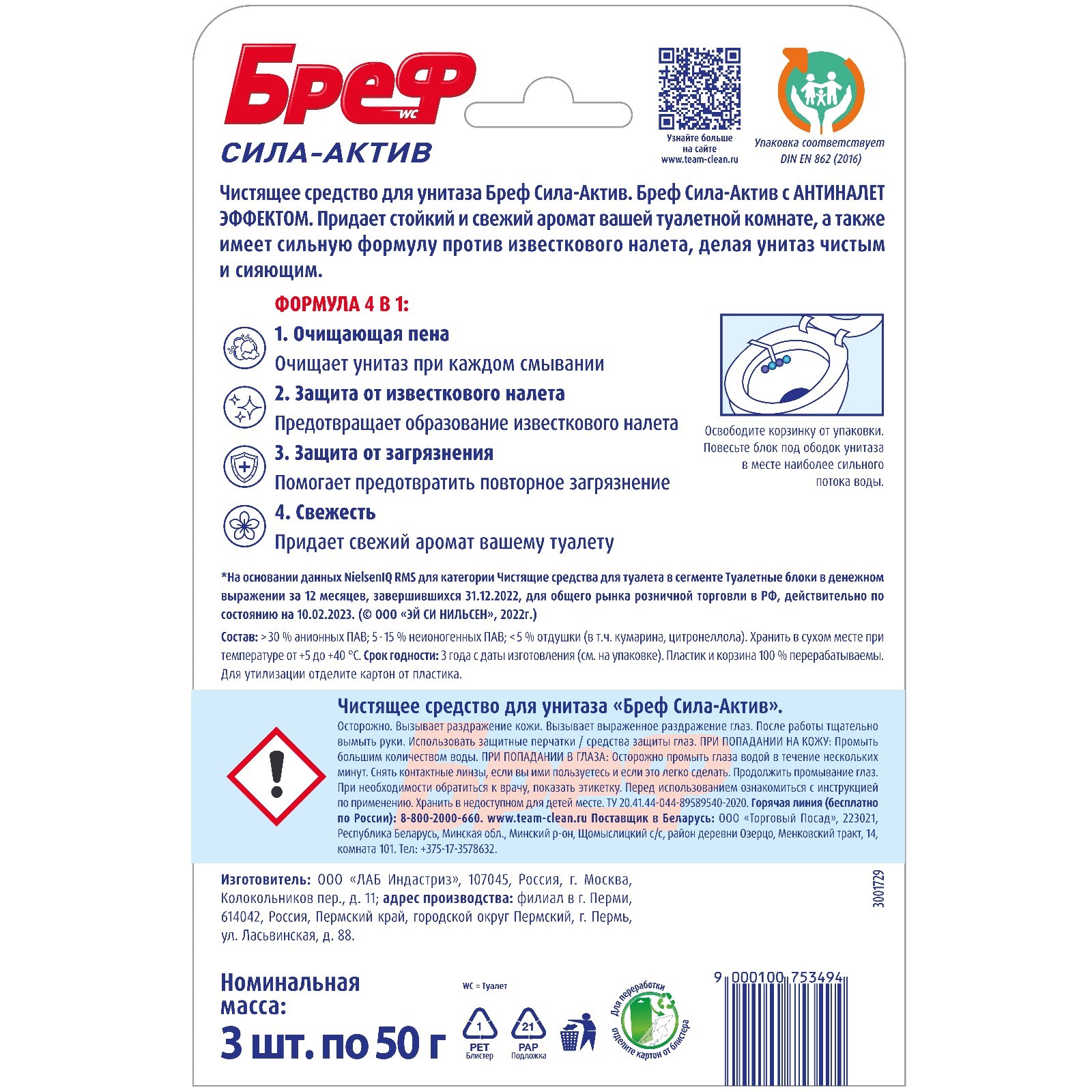 Блок для чистки и свежести унитаза bref сила актив 4 в 1 bref "океанский бриз", 50 гр. Бреф Сила-Актив с АНТИНАЛЕТ ЭФФЕКТ – подвесной туалетный блок с формулой против известкового налета. Активная формула с антиналет эффектом действует в 4 направлениях: -образует очищающую пену, которая обеспечивает гигиеническую чистоту; -предотвращает образование известкового налета; -помогает предотвратить повторное загрязнение; -придает туалетной комнате свежий аромат океана после каждого смывания. Бреф Сила-Актив придает антиналет эффект при каждом смывании. Способ применения: Повесьте Бреф Сила-Актив под ободок Вашего унитазаВыберите положение блока как можно ближе к струе водыЗамените блок, когда он закончитсяВызывает раздражение кожи. Вызывает выраженное раздражение глаз. После работы тщательно вымыть руки. Использовать защитные перчатки / средства защиты глаз. ПРИ ПОПАДАНИИ НА КОЖУ: Промыть большим количеством воды. ПРИ ПОПАДАНИИ В ГЛАЗА: Осторожно промыть глаза водой в течение нескольких минут. Снять контактные линзы, если вы ими пользуетесь или если это легко сделать. Продолжить промывание глаз. Хранить в недоступном для детей месте. Состав:> 30% анионных ПАВ, солей неорганических; 5-15% неионогенных ПАВ; < 5% красителя, комплексообразователя, растворителя, отдушки (в т. ч. кумарина, цитронеллола) Аромат: Океанская свежесть Вид средства: Сменный блок  развернуть описание ▼
