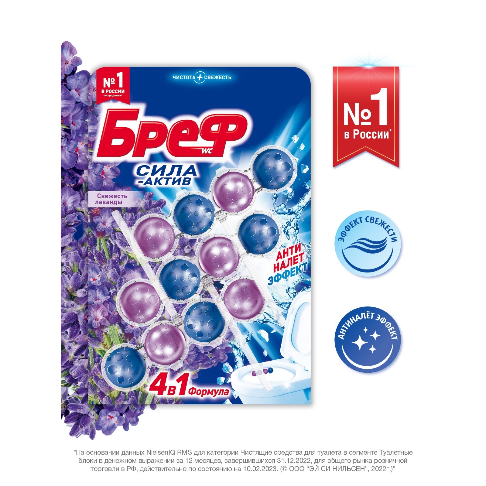 Блок для чистки и свежести унитаза bref сила актив 4 в 1 bref сила актив "свежесть лаванды", 3 шт x 50 г.   Бреф Сила-Актив с АНТИНАЛЕТ ЭФФЕКТ – подвесной туалетный блок с формулой против известкового налета.  Активная формула с антиналет эффектом действует в 4 направлениях: -образует очищающую пену, которая обеспечивает гигиеническую чистоту; -предотвращает образование известкового налета; -помогает предотвратить повторное загрязнение; -придает туалетной комнате свежий аромат лаванды после каждого смывания.  Бреф Сила-Актив придает антиналет эффект при каждом смывании.  Способ применения: Повесьте Бреф Сила-Актив под ободок Вашего унитазаВыберите положение блока как можно ближе к струе водыЗамените блок, когда он закончитсяВызывает раздражение кожи. Вызывает выраженное раздражение глаз. После работы тщательно вымыть руки. Использовать защитные перчатки / средства защиты глаз. ПРИ ПОПАДАНИИ НА КОЖУ: Промыть большим количеством воды. ПРИ ПОПАДАНИИ В ГЛАЗА: Осторожно промыть глаза водой в течение нескольких минут. Снять контактные линзы, если вы ими пользуетесь или если это легко сделать. Продолжить промывание глаз. Хранить в недоступном для детей месте.  Состав:> 30 % анионных ПАВ, солей неорганических; 5-15% неионогенных ПАВ; < 5% красителя, комплексообразователя, растворителя, отдушки (в т. ч. кумарина, линалоола, лимонена) Аромат: Лаванда Вид средства: Сменный блок  развернуть описание ▼