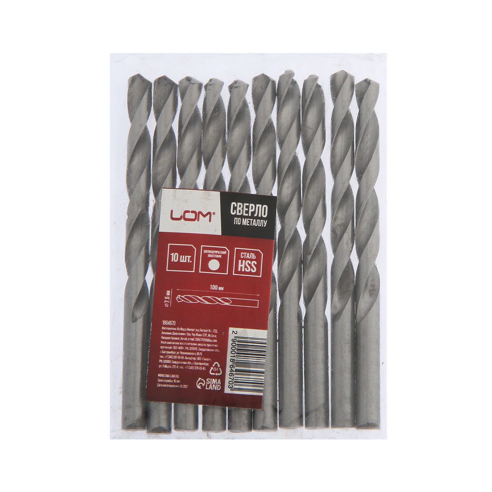 Сверло по металлу лом, Hss, цилиндрический хвостовик, 7.5 110 мм, 10 шт.