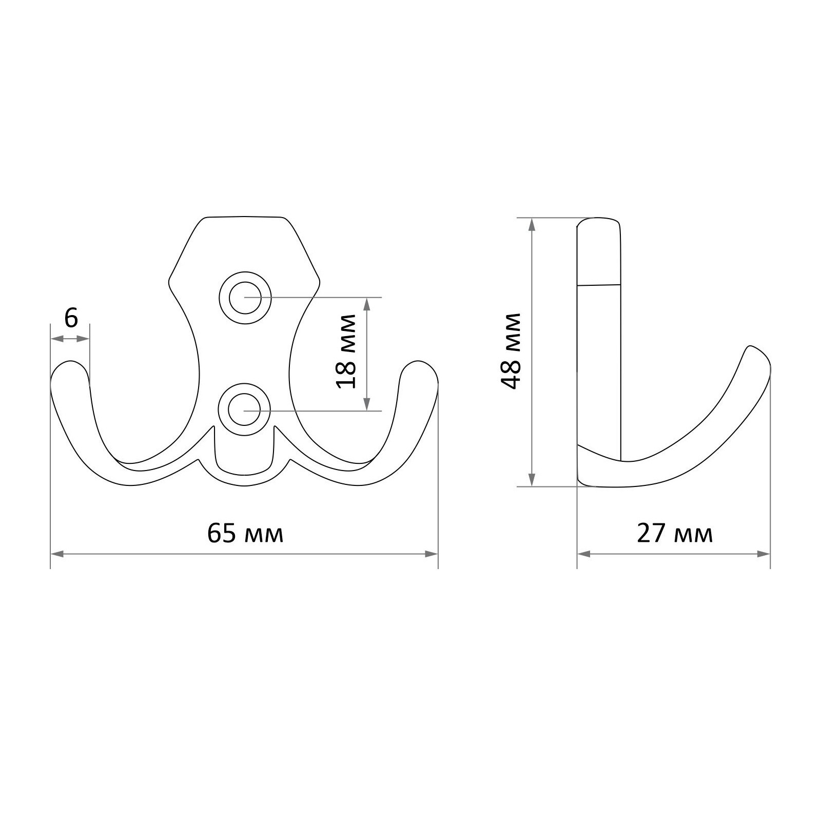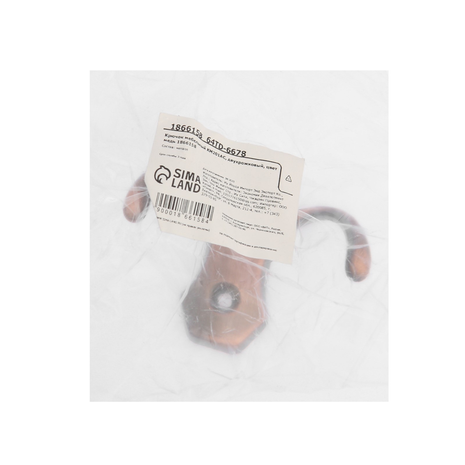 Крючок мебельный тундра Tkd007, двухрожковый, медь