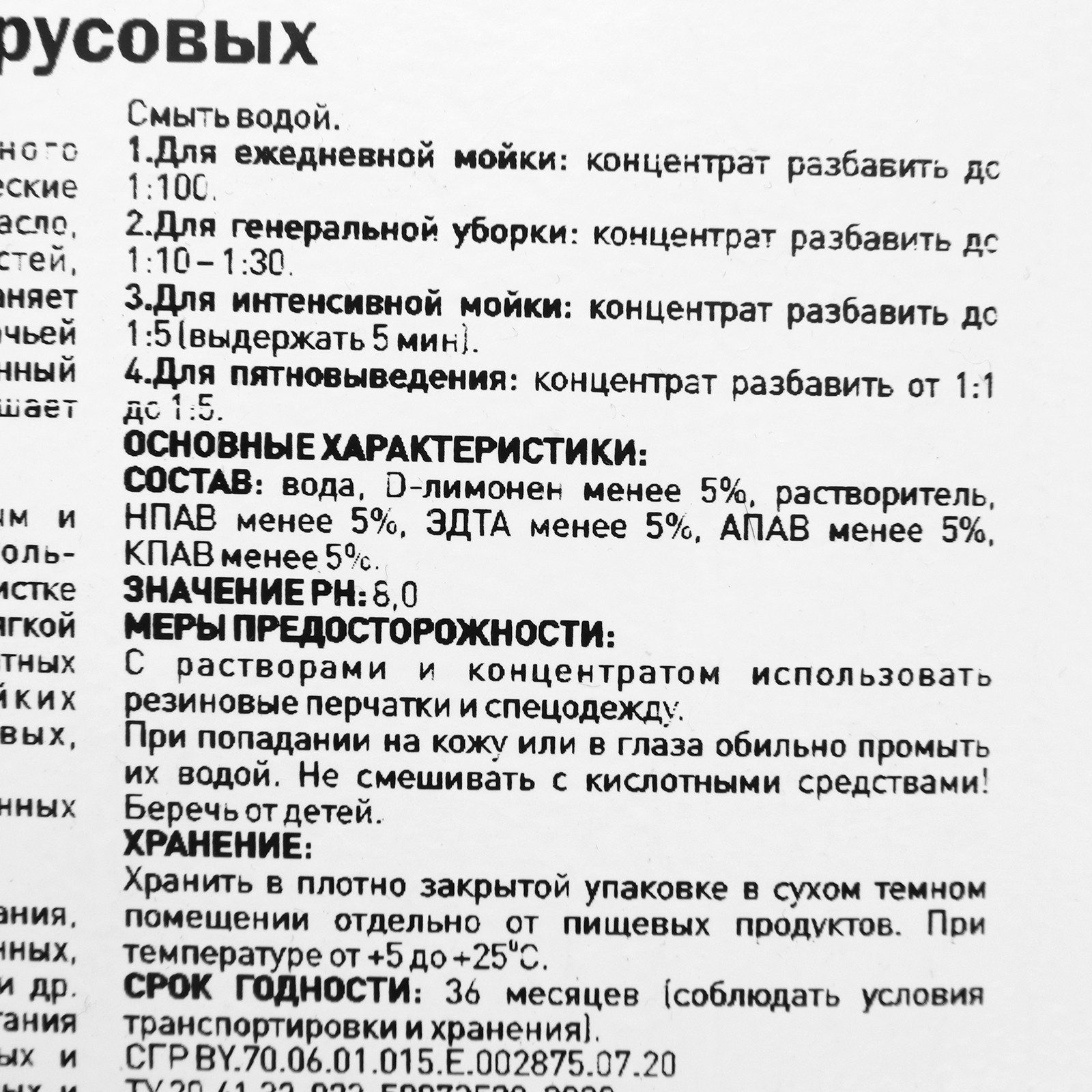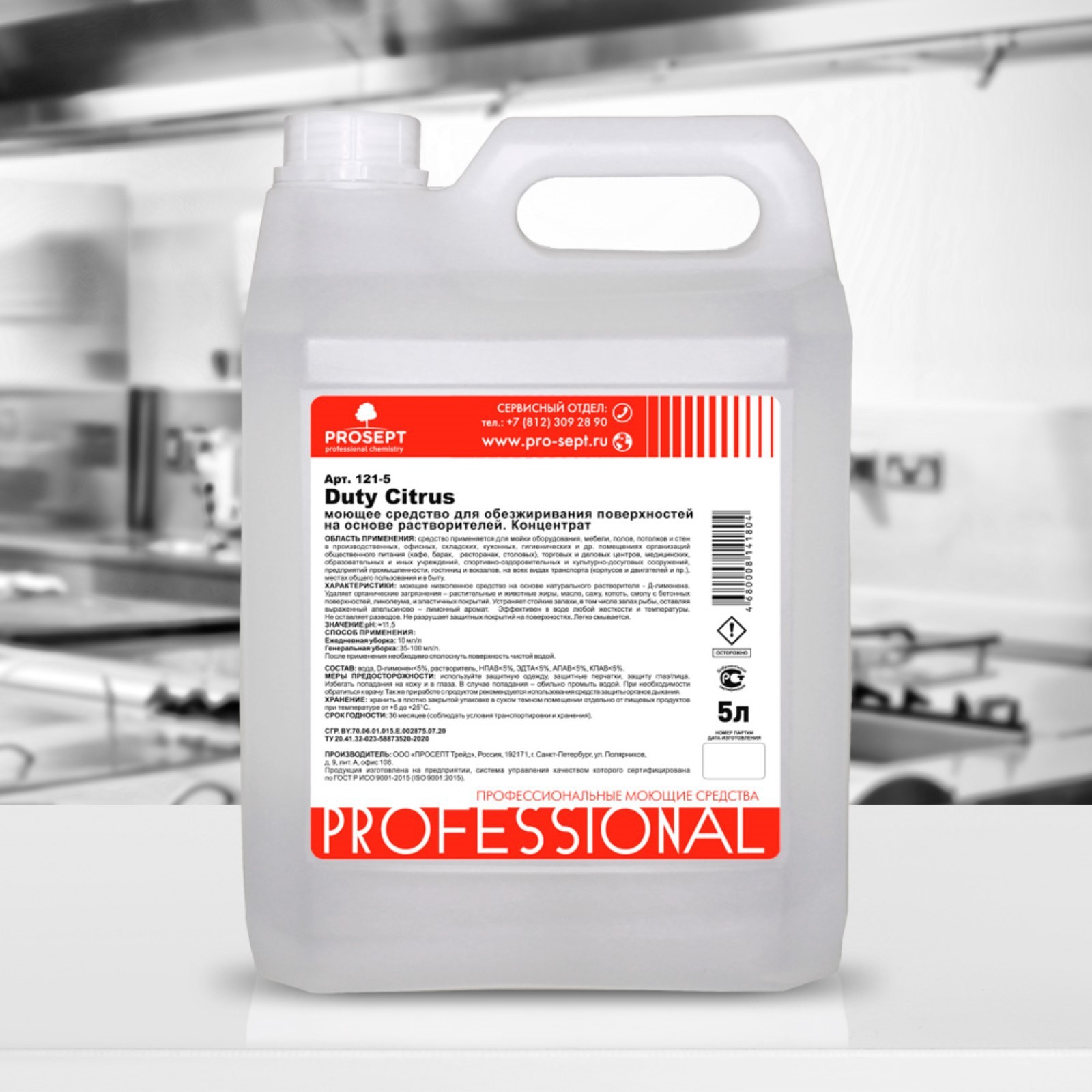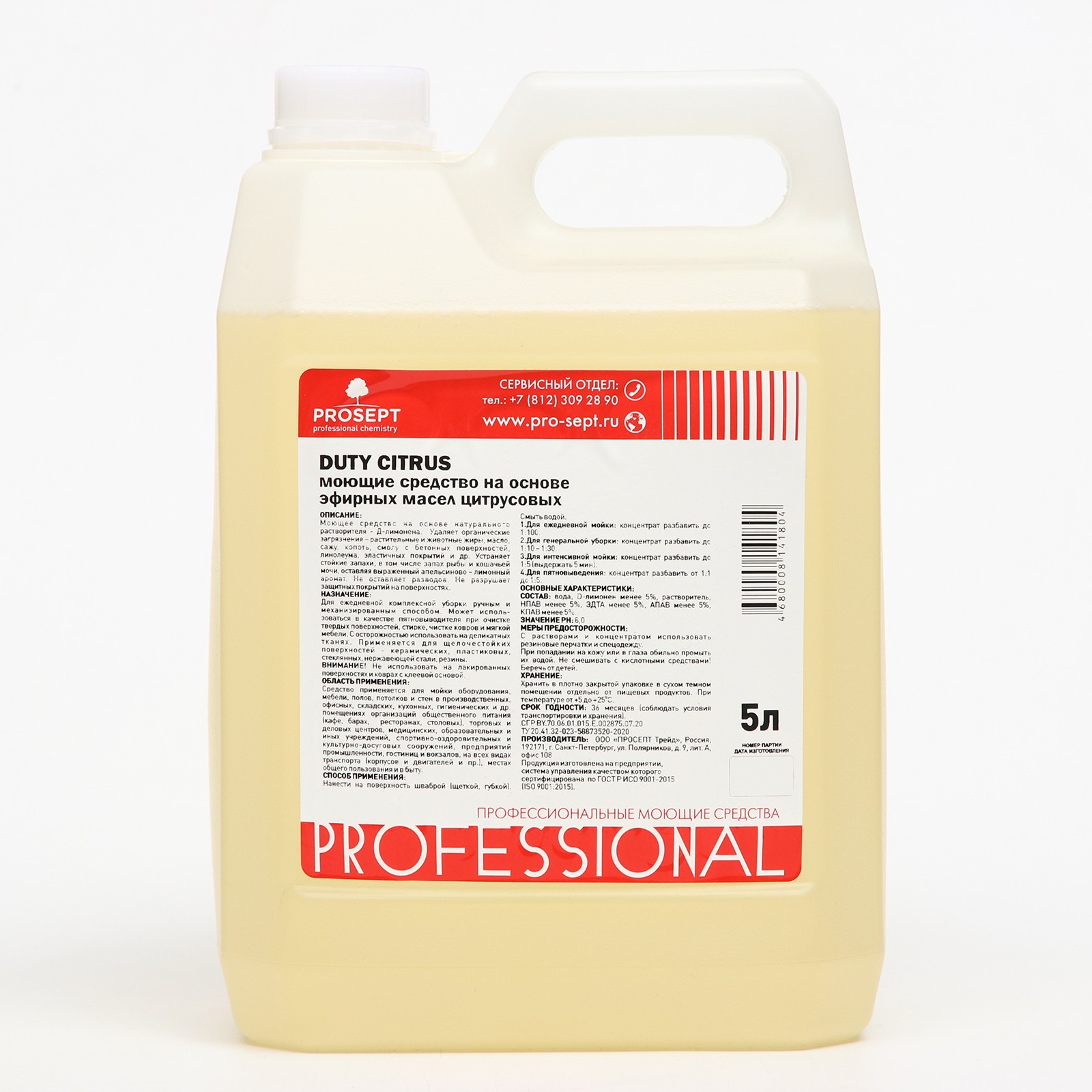 Средство на основе цитрусовых эфирных масел duty citrus, 5л. Средство для обезжиривания и удаления стойких запахов Prosept – моющее средство на основе натурального растворителя - Д-лимонена. Удаляет органические загрязнения – растительные и животные жиры, масло, сажу, копоть, смолу с бетонных поверхностей, линолеума, эластичных покрытий и др. Устраняет стойкие запахи, в том числе запах рыбы, оставляя выраженный апельсиново – лимонный аромат. Эффективен в воде любой жесткости и температуры. Не оставляет разводов. Не разрушает защитных покрытий на поверхностях. Имеет низкое пенообразование. Легко смывается. Не закупоривает форсунки в распыляющих системах. При размораживании сохраняет свои свойства. Преимущества: • для мытья полов, стен, поверхностей; • можно использовать как пятновыводитель при стирке белья; • уничтожает запахи; • приятный цитрусовый аромат. Способ применения: • Нанести на поверхность шваброй, щеткой или губкой. • Смыть водой. Для ежедневной мойки: разбавить до 1:100. Для генеральной уборки: разбавить до 1:10 – 1:30. Для интенсивной мойки: разбавить до 1:5 (выдержать 5 мин). Для пятновыведения при стирке: разбавить от 1:1 до 1:5. С растворами: использовать резиновые перчатки и спецодежду. С концентратом: использовать резиновые перчатки, защитные очки и спецодежду. Меры предосторожности: при попадании на кожу или в глаза обильно промыть их водой. Не смешивать с кислотными средствами! Беречь от детей. parts count: 0 Объём, мл: 5000 Назначение: Для кухонной техники  развернуть описание ▼