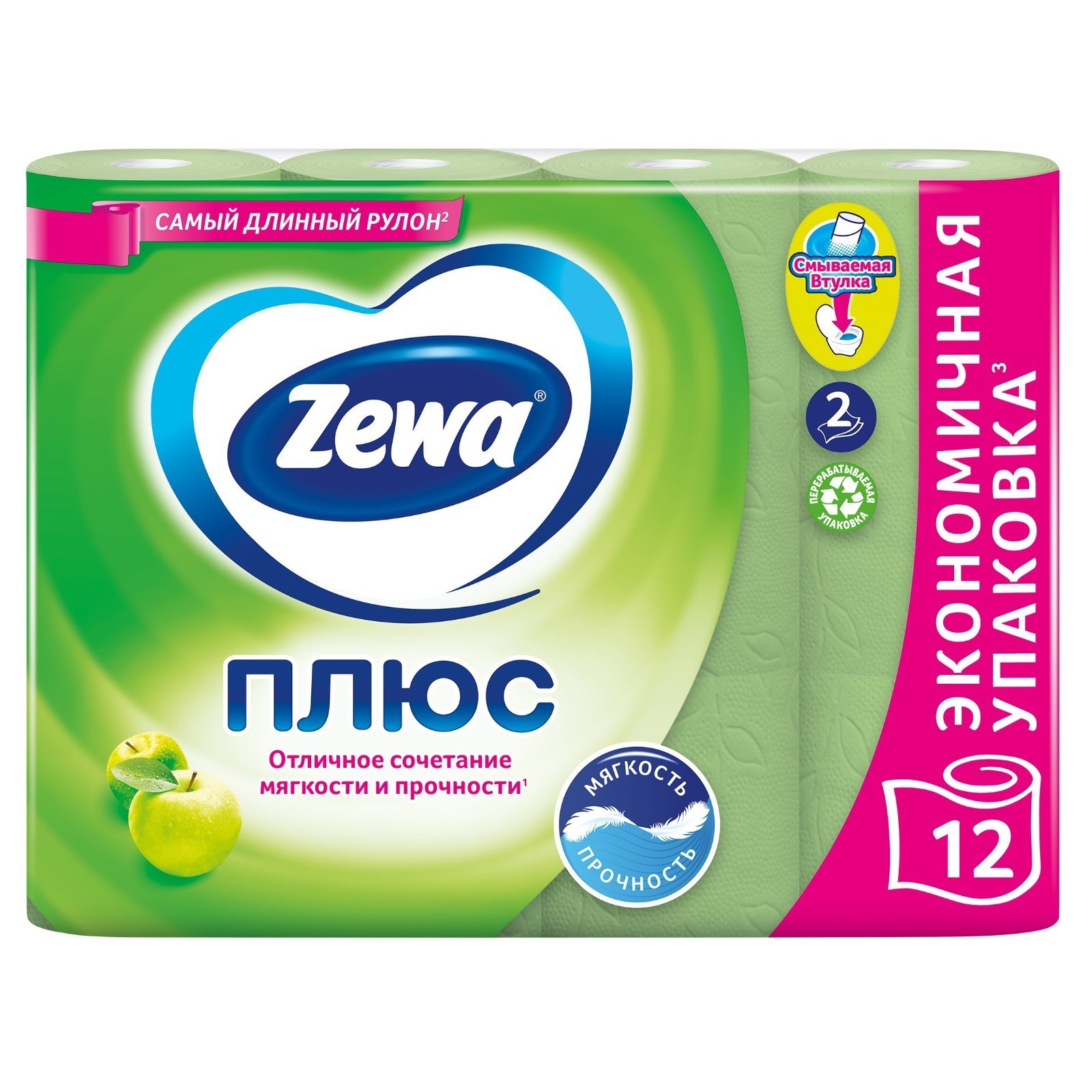 Туалетная бумага Zewa плюс «яблоко», 2 слоя, 12 рулонов