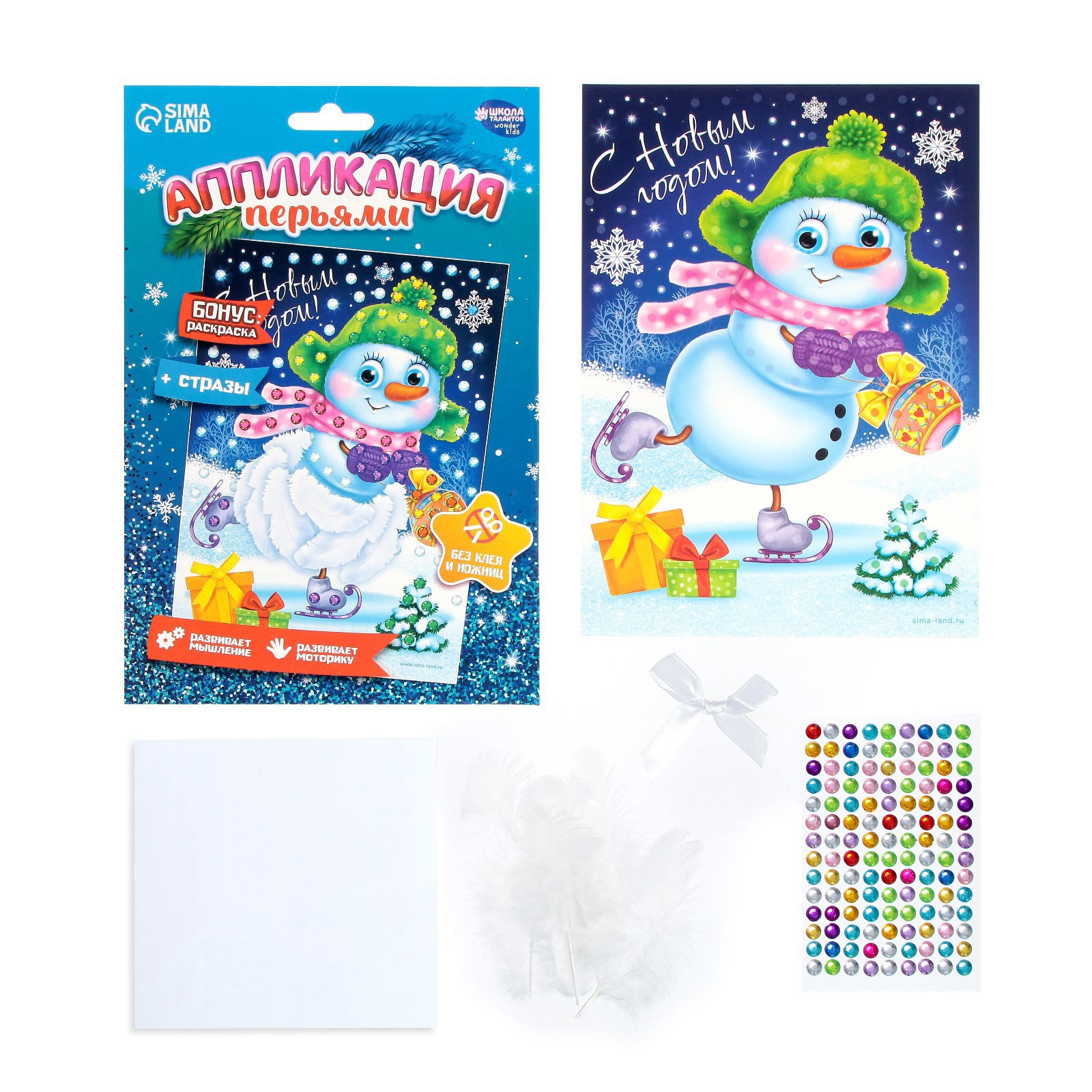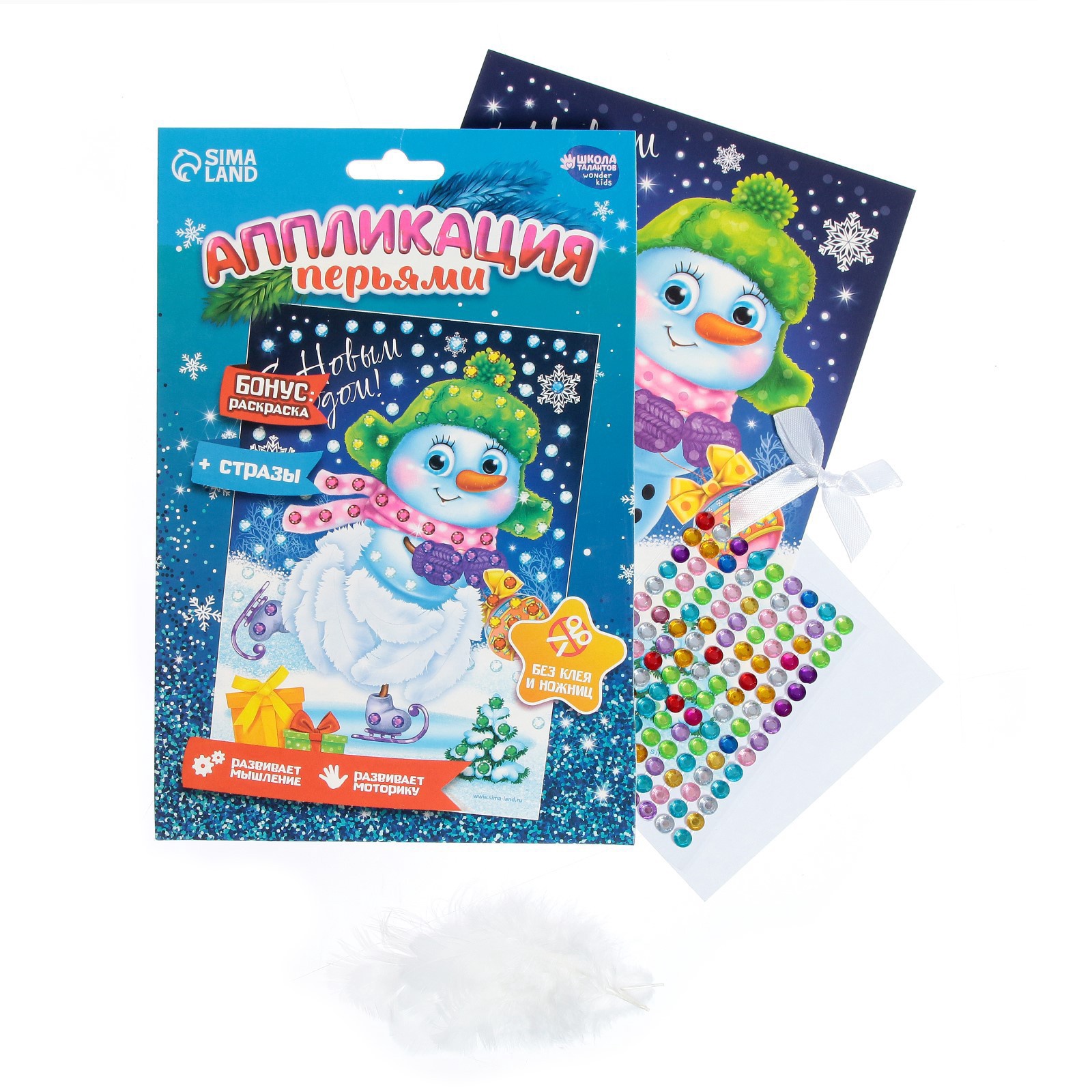 Аппликация на новый год перьями и стразами «снеговик», набор для творчества.