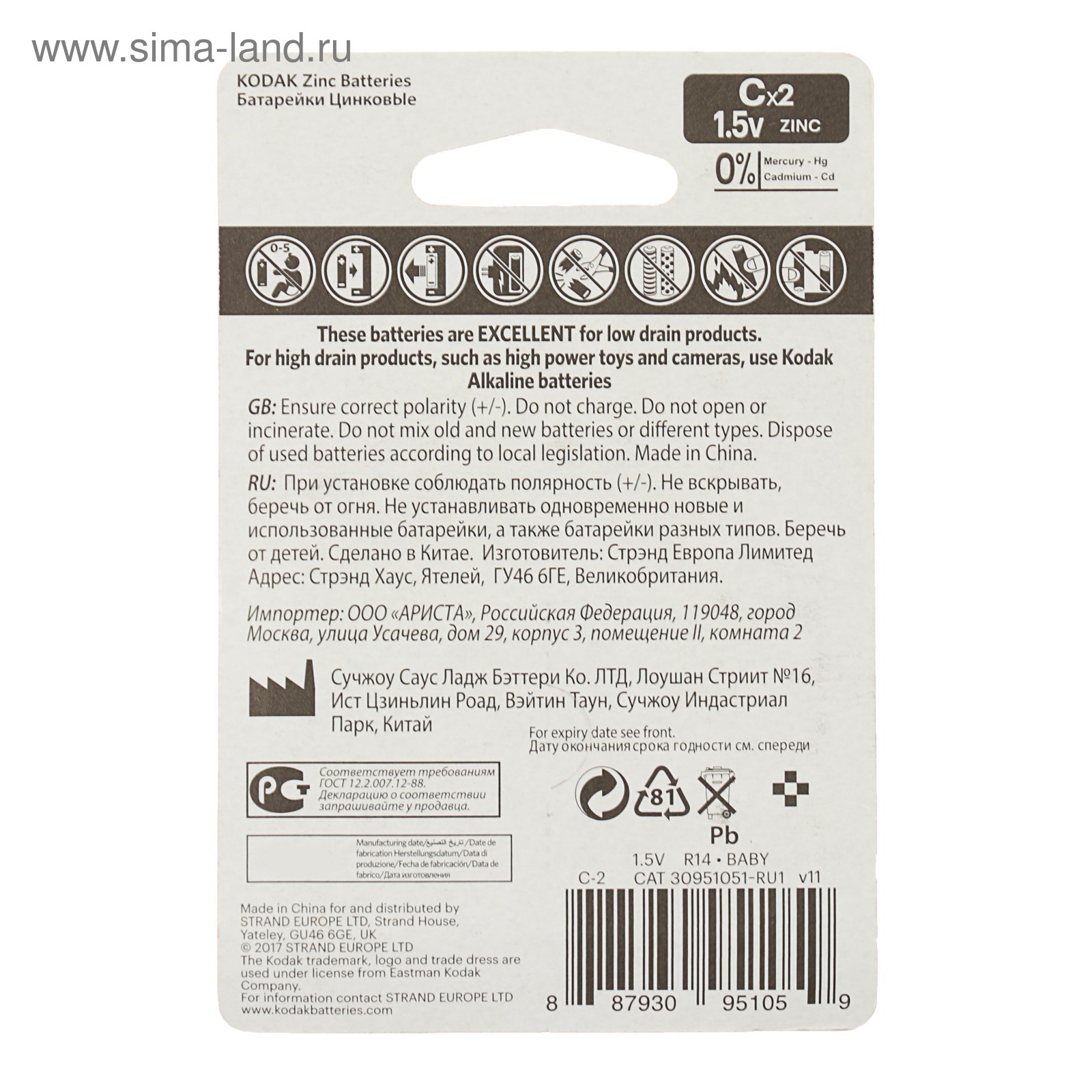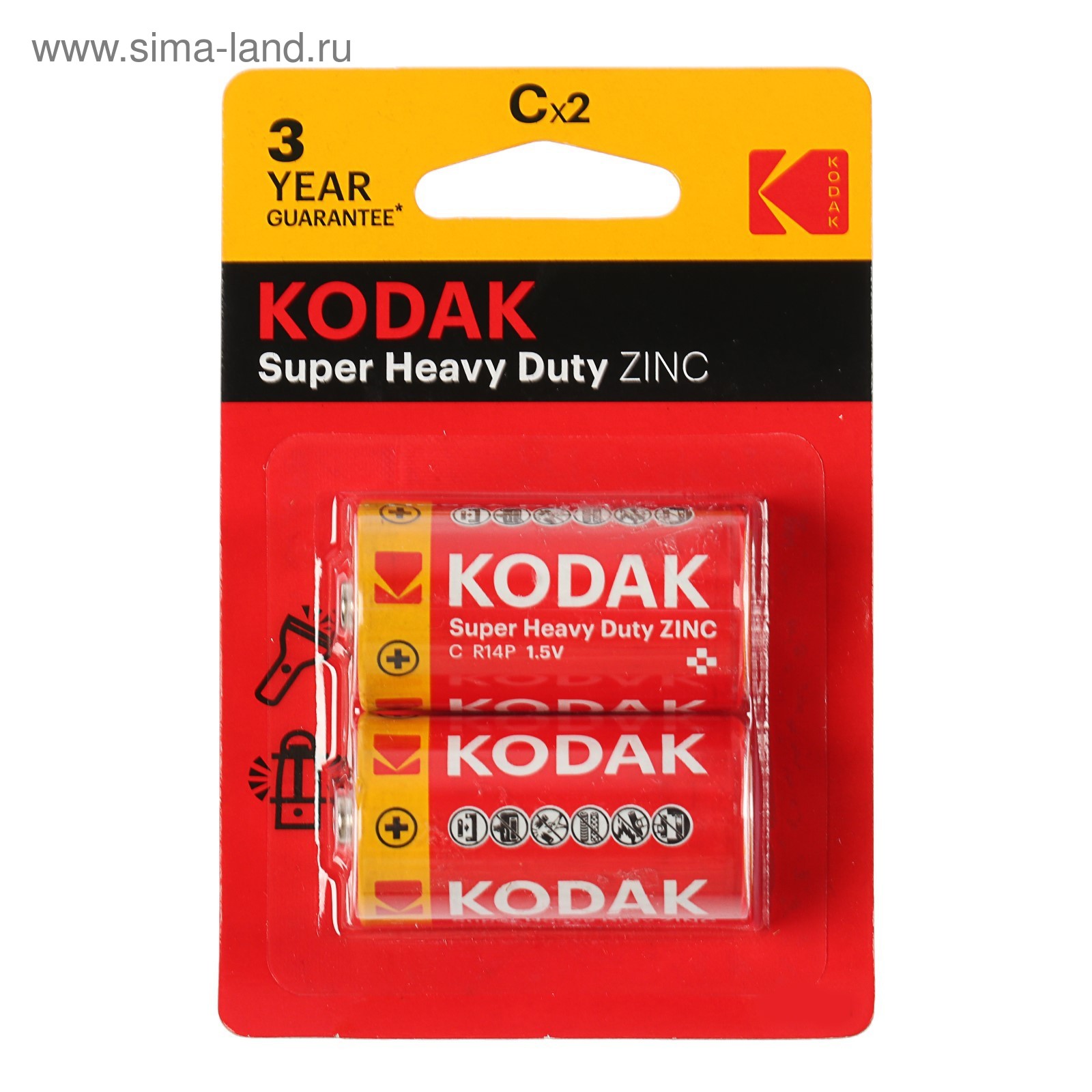 Батарейка солевая kodak extra heavy duty, c, r14-2bl, 1.5в, блистер, 2 шт.. Батарейки типоразмера C наиболее распространены в крупной и энергоёмкой технике: переносных магнитофонах, электрических фонарях. Они выдают напряжение аналогичное пальчиковым элементам, но благодаря габаритам имеют в 3 раза большую ёмкость. Максимальная эффективность солевых элементов питания (R14) достигается в приборах, которые не создают долговременных и интенсивных нагрузок. А их низкая цена не обременит вас при эксплуатации привычных устройств. Срок хранения составляет от 1 до 3 лет. В упаковке, шт.: 2 Вид упаковки: Блистер Типоразмер батареек: C (LR14) Тип батарейки: Солевая  развернуть описание ▼