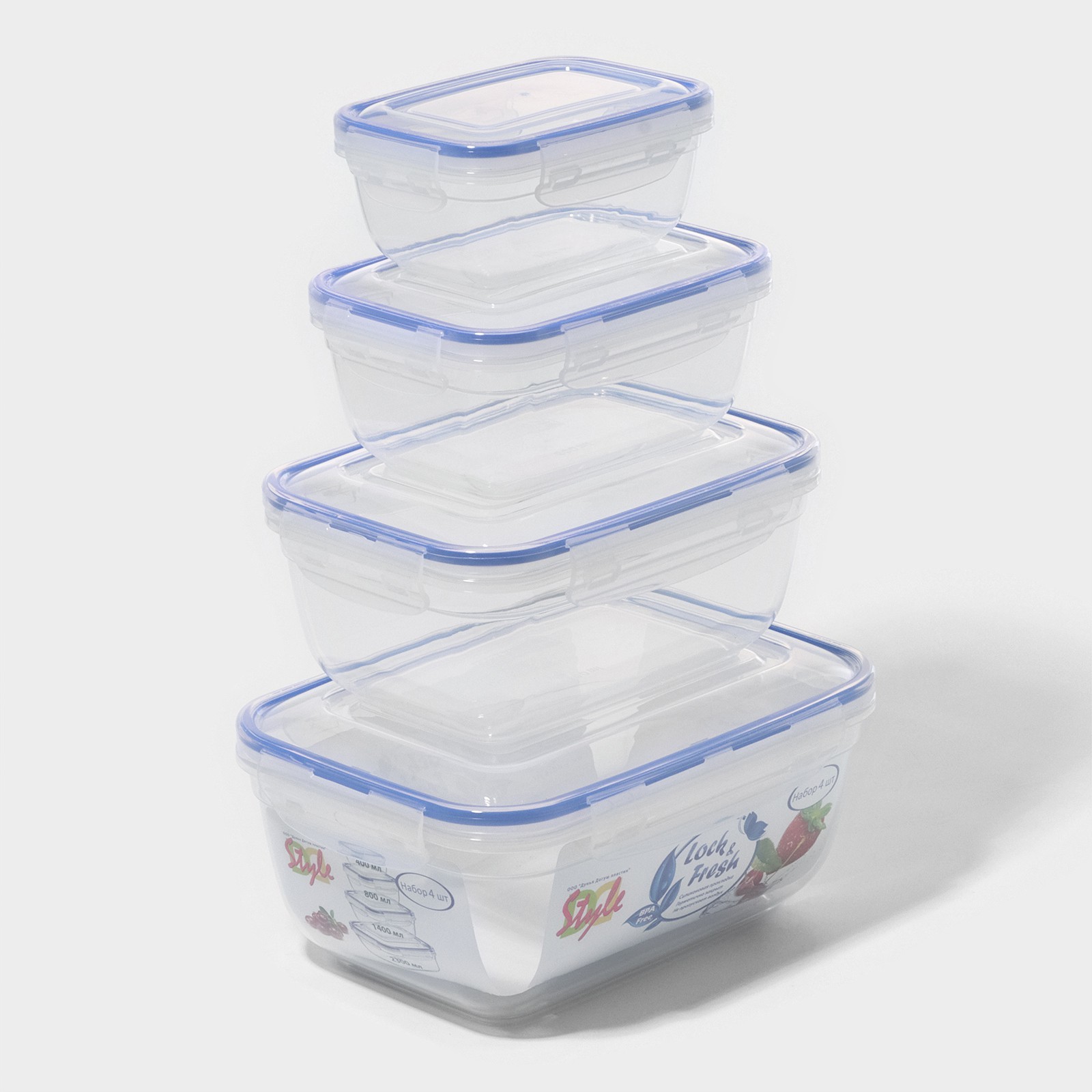 Набор контейнеров пищевых, воздухонепроницаемых 4 шт: 0,4 л, 0,8 л, 1,4 л, 2,3 л, микс