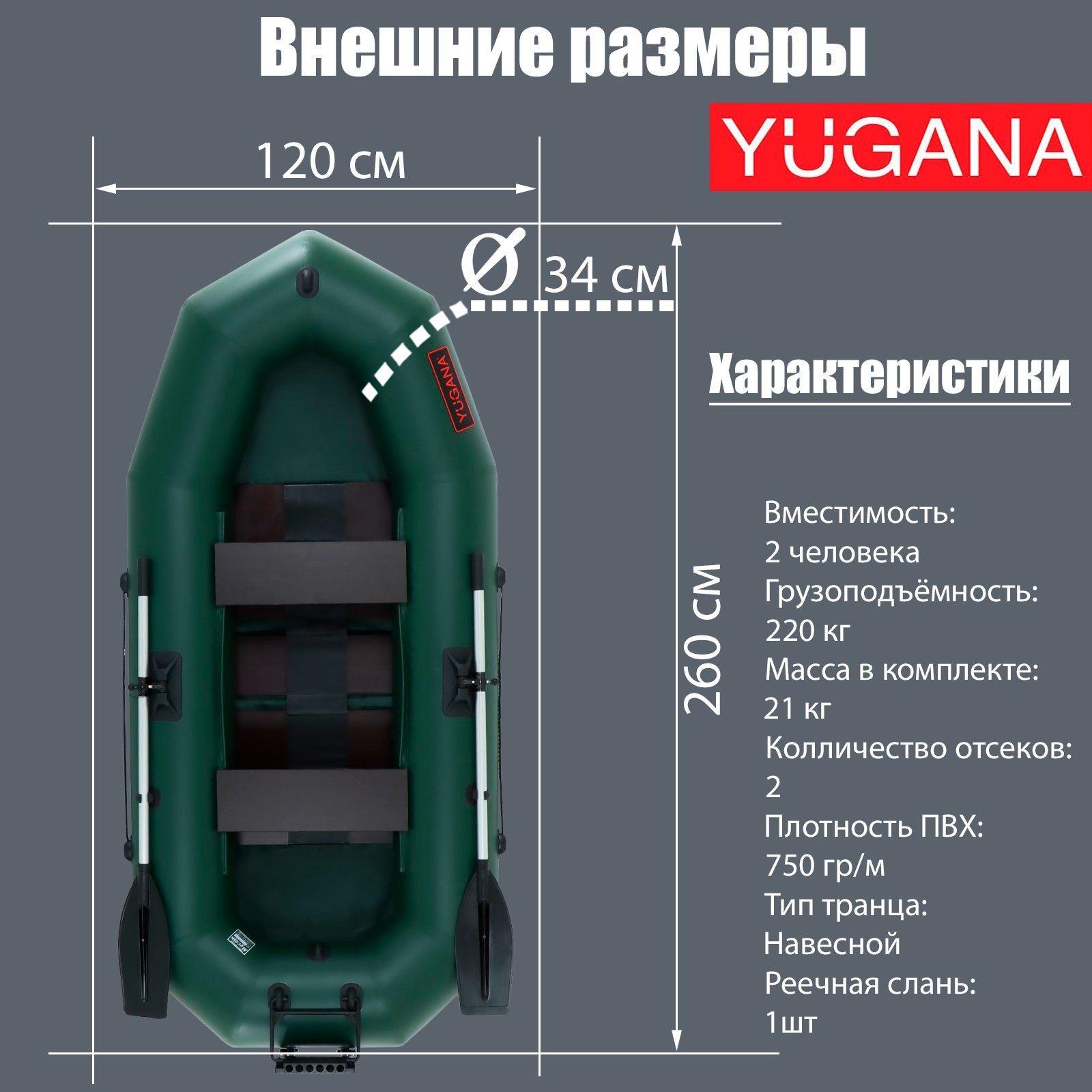 Лодка yugana r-260 pc тр, реечная слань+транец, цвет олива. Двухместная лодка подходит для охоты, рыбалки и аварийно-спасательных работ. Отличается мобильностью, легко помещается в багажнике автомобиля. Имеет передвижные сиденья и поворотные уключины для вёсел. Современный ПВХ-материал плотностью 750 г/м2 позволяет использовать лодку в широком температурном диапазоне. Изделие можно хранить длительное время без дополнительной обработки поверхности. Технические характеристики Грузоподъёмность: 220 кг. Масса в комплекте: 21 кг. Количество отсеков: 2. Мощность двигателя: 3, 5 л. с. Длина: 260 см. Ширина: 120 см. Диаметр баллона: 34 см. Комплектация: алюминиевые вёсла — 2 шт. ;сиденья — 2 шт. ;поворотные уключины — 2 шт. ;насос — 1 шт. ;ремкомплект — 1 шт. ;сумка упаковочная — 1 шт. ;транец навесной — 1 шт. ;реечная слань — 1 шт. Вид: Моторно-гребная Грузоподъёмность, кг: 220 Макс. мощность мотора, л.с.: 3.5 Длина, см: 260 Ширина, см: 120 parts count: 0 Количество мест: 2 Вес, кг: 21 : 750 Вид дна: Слань Вид дна: Реечное Материал: ПВХ Комплектация: Уключины для вёсел Комплектация: Транец Комплектация: Вёсла Комплектация: Насос Комплектация: Сумка упаковочная Комплектация: Сиденья Комплектация: Ремкомплект Комплектация: Слань  развернуть описание ▼