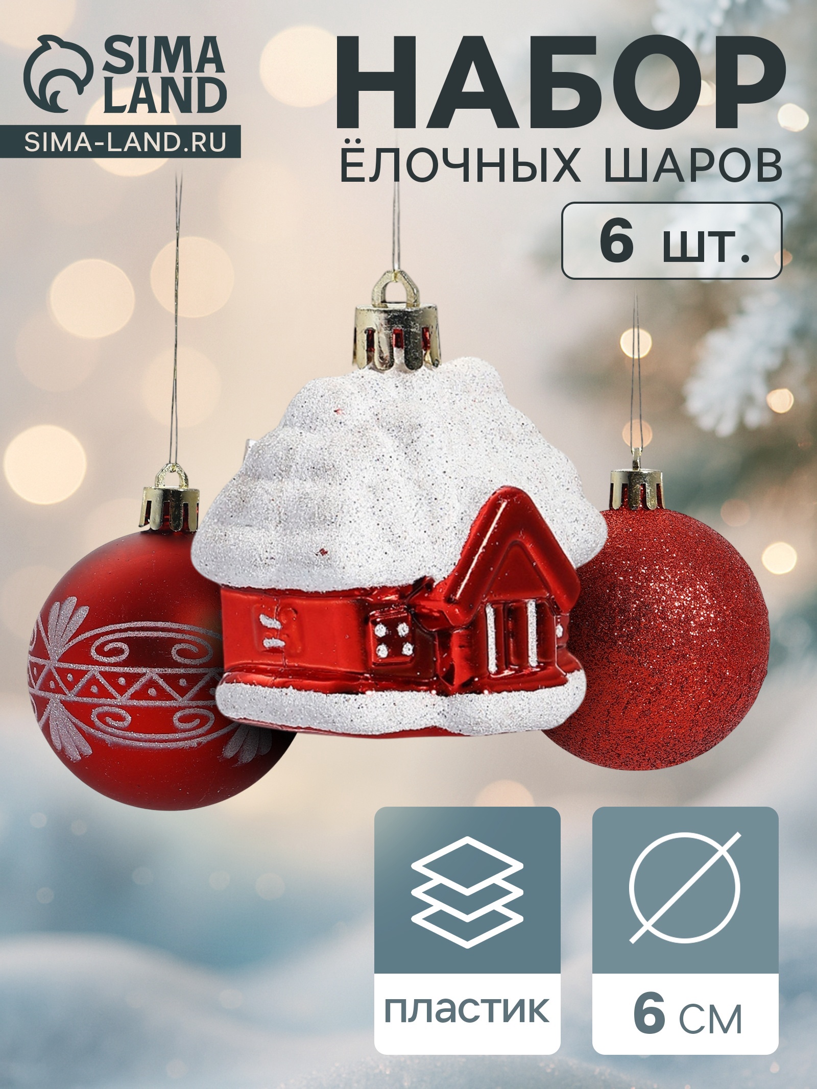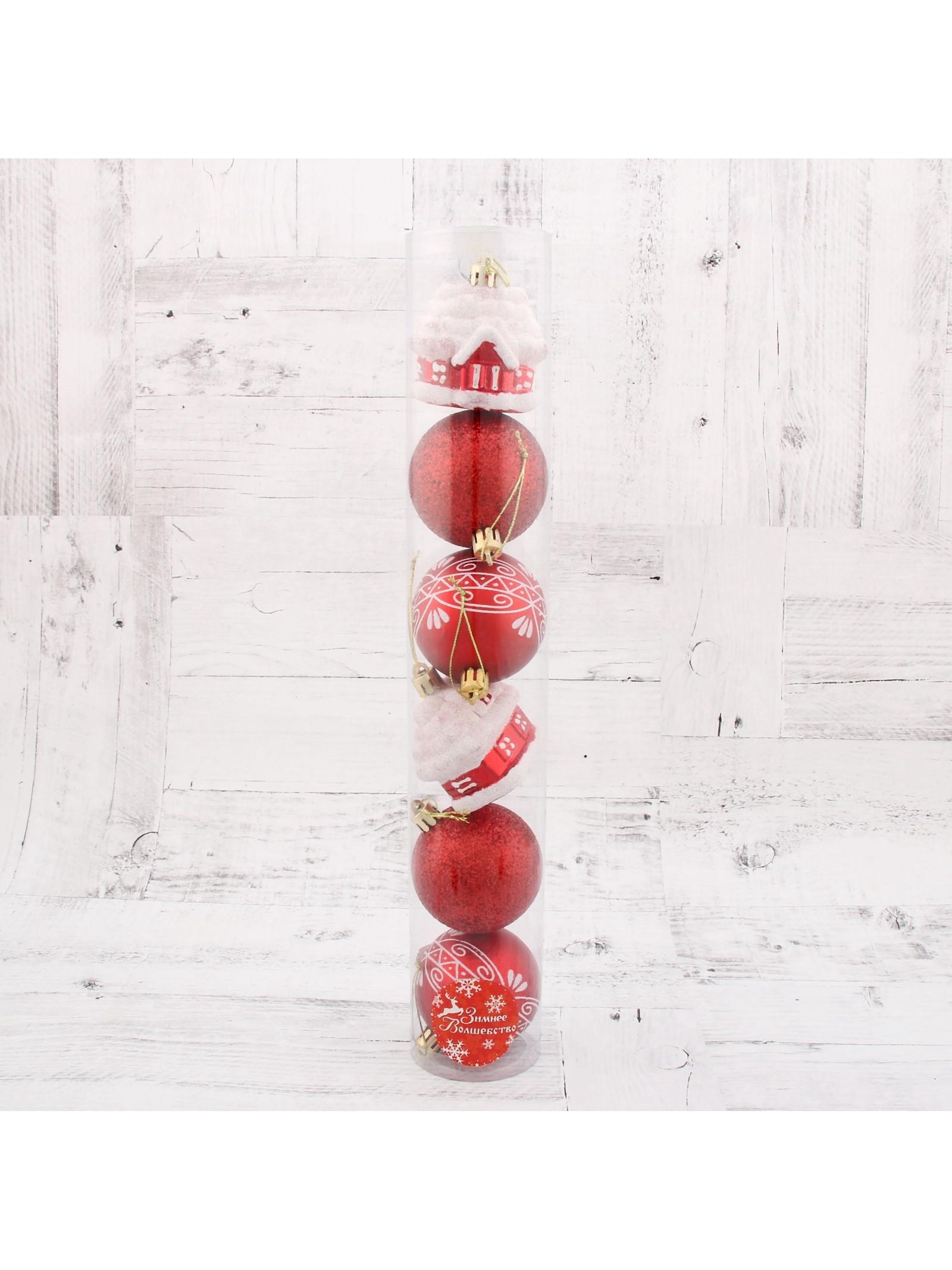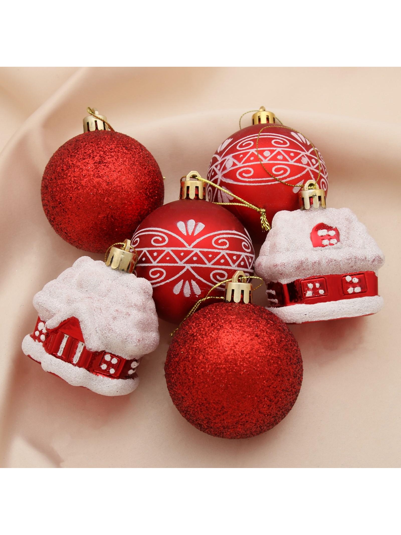 Ёлочные игрушки «праздник», шары новогодние, набор 6 шт. (4 шара, 2 домика) 6 см, красный
