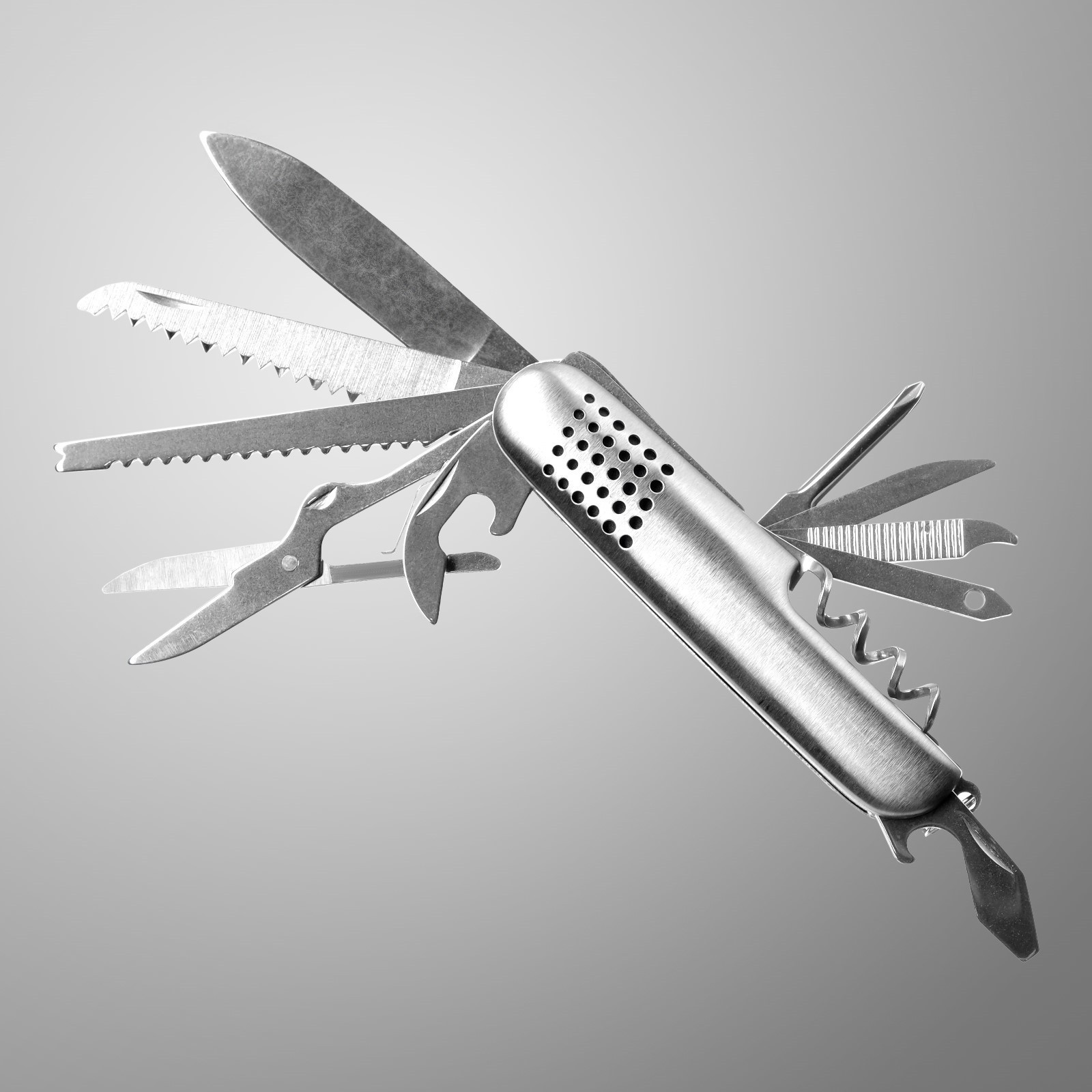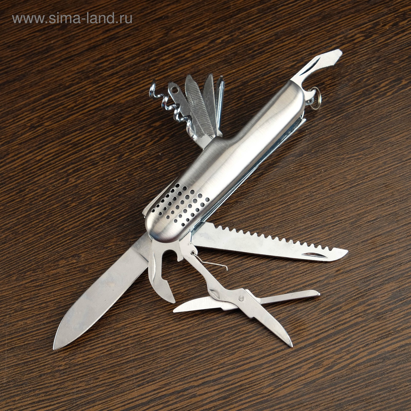 ножницы; консервный нож; два лезвия (ножи); открывалка для бутылок с отверткой; отвертка; две пилы по дереву; пилочка; шило; штопор.