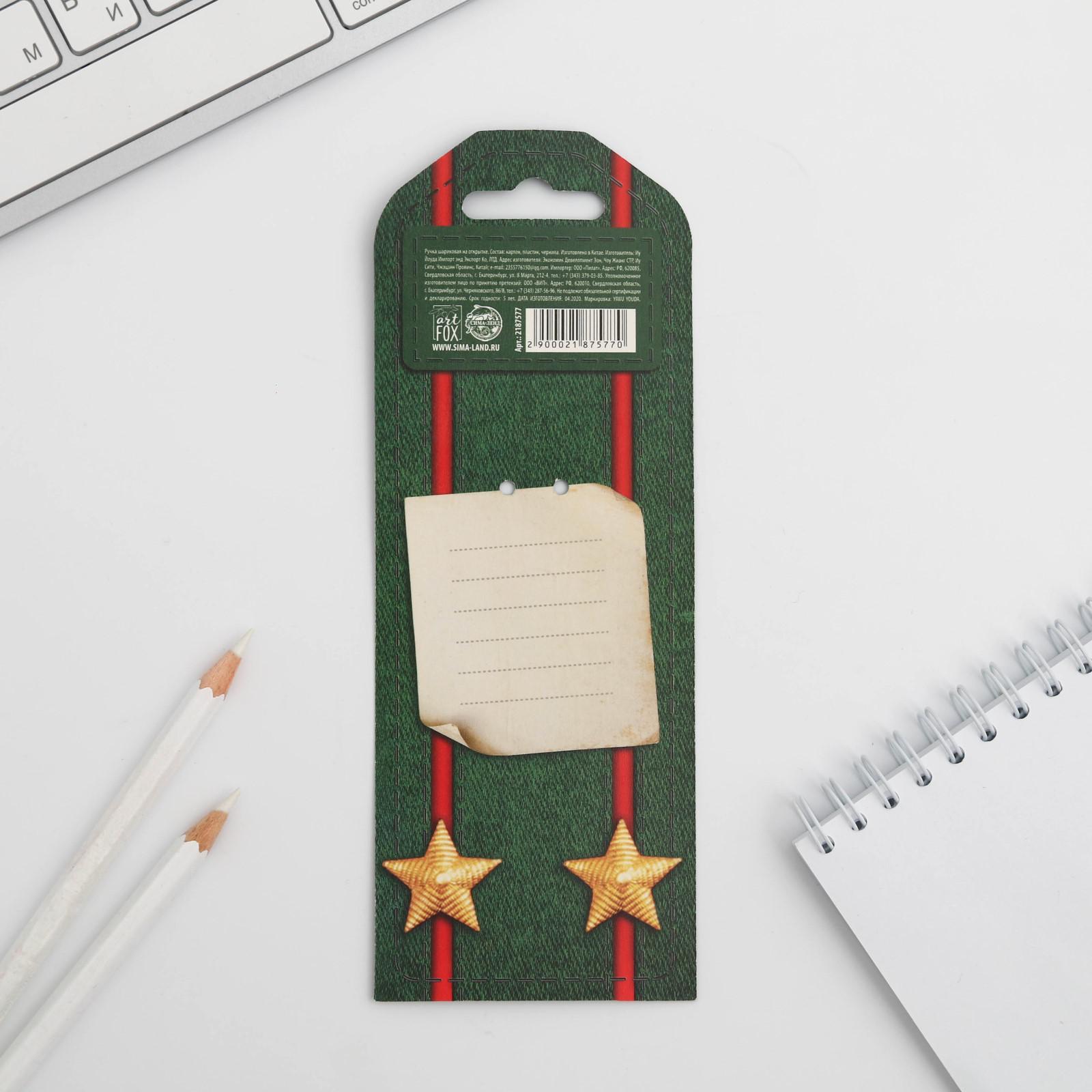 Ручка шариковая, синяя паста, пластик, со звездой, на подложке- погон «23 февраля: с днем защитника отечества». Ручка отличное дополнение к подарку. Яркий дизайн несомненно привлечет внимание и будет выделяться среди других предметов, а удобная форма корпуса позволит использовать ее с комфортом. Стержень заменяемый: да;Материал: пластик.Диаметр пишущего узла, мм:1|Набор:Нет|Цвет:Бирюзовый|Цвет стержня:Синий|Европодвес:Да|Вид упаковки:Открытка|Тематика праздника:23 Февраля|Адресат:Без адресата|Материал:Пластик|Материал упаковки:Пластик|Составляющие набора:Ручка|Штрихкод на единице товара:Да|Наличие грипа:Да|Страна:Китай  развернуть описание ▼